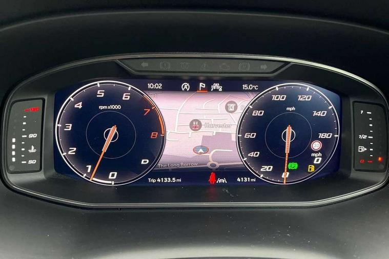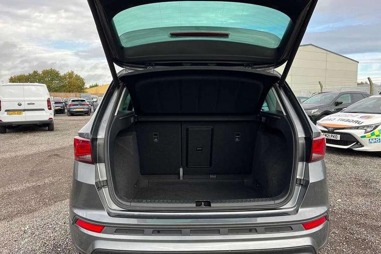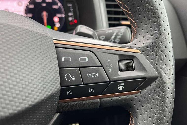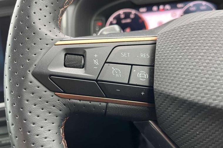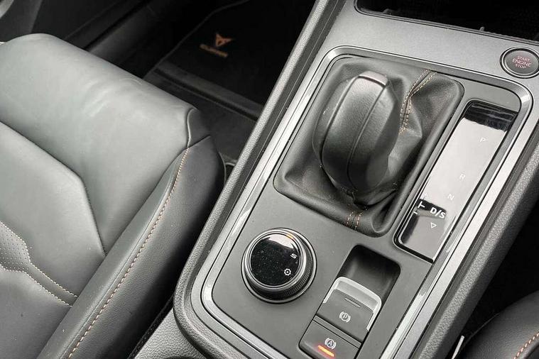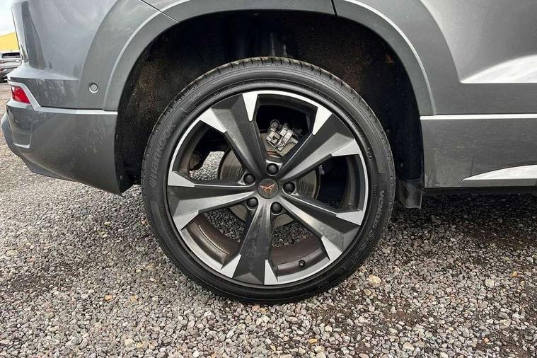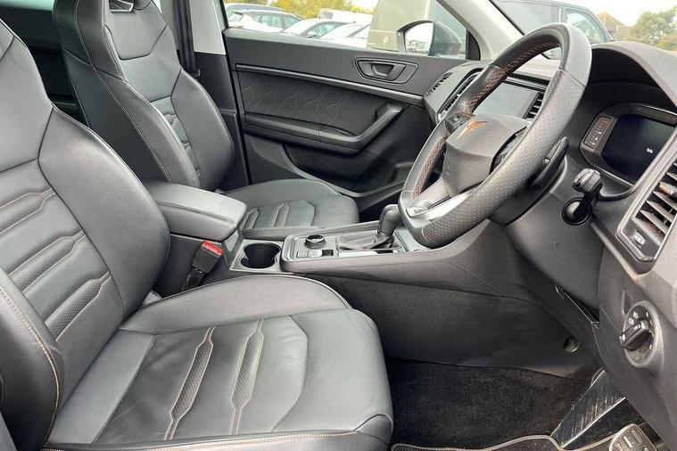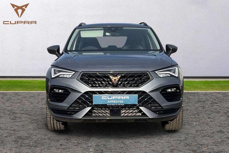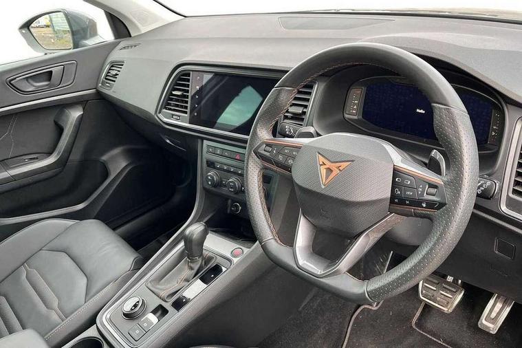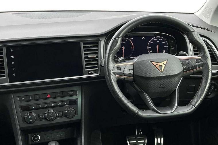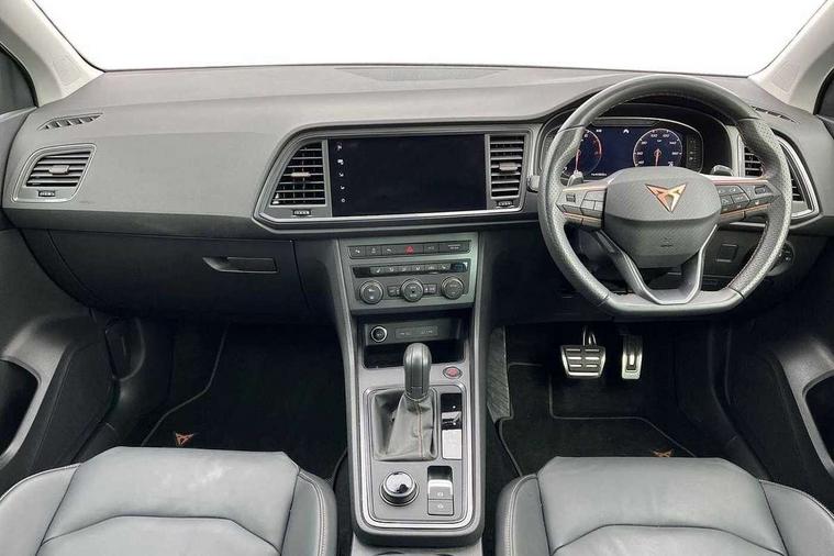 Cruise control system with speed limiter, Digital cockpit, Driving profile selection and conventional shock absorber, E-call, Electric tailgate with virtual pedal, Outside temperature gauge, Progressive power assisted steering, Rear view camera, Self parking functionality (includes front and rear parking sensors), Trip computer, wired and wireless full link smartphone integration, Wireless phone charger, Front and rear shock absorption, chassis with increased ride height, Steering wheel mounted audio/phone controls, Body colour bumpers with dark aluminium diffusor, Body coloured wheel arch surrounds, Dark tinted rear windows, Daytime running lights, Door mirrors with welcome CUPRA light silhouette, Dynamic headlight range control with self adjusting whilst driving, Electric adjustable/heated/folding door mirrors, Front and rear electric windows, Front grille frame in chrome, Full LED headlamps with lens and LED front fog lamps with cornering function, Gloss black door mirrors, Gloss black roof rails, Gloss black side mouldings, Gloss black side window trim, Illuminated aluminium front door sill, LED rear tail lights with dynamic indicators, Rear fog lights, Rear side wing doors, Rear spoiler, Rear wash/wipe, Specific CUPRA design front bumper, Standard rear exhaust tailpipes, Third brake light, 12V socket in front, 3 seat bench in 2nd row, 60/40 split folding rear seat, Aluminium pedals, Cupra steering wheel emblem, Dual zone climate control, Electric driver seat with memory function, Front and rear head restraints, Front centre armrest, Front seat back storage pockets, Grey roof lining, Heated front seats, Heated steering wheel, Height adjustable driver and passenger seat with lumbar adjustment, ISOFIX points in outer rear seats with top tether anchorage points, Leather sport bucket seats, Leather steering wheel and gear knob, Multicoloured ambient lighting with LED interior illumination, Pedal cluster, Rear armrest and easy back seat release mechanism from boot, Single front passenger seat, Sports steering wheel, Steering wheel mounted gearshift paddles, Storage compartment in roof console for sunglass, Storage compartment under driver's seat, Convenience pack - Ateca, Interior lighting pack - Ateca, Navigation system plus pack with DAB - Ateca, Safety and driving pack - Ateca, 3x3 point rear seatbelts, ABS, Traction control system (TCS), Electronic stability control (ESC) and Electronic differential lock system (XDS), Airbags - Driver and front passenger airbag with deactivation, front side, two curtain and driver's knee airbags, Black brake callipers with CUPRA logo, Electric parking brake with auto hold function, Front and rear seatbelt reminder, Front assist with autonomous emergency braking, Hill hold control, Manual rear child locks, Single tone horn, Tiredness recognition system, Tyre pressure monitoring system, Alarm, Keyless entry, Locking wheel bolts, 19" Sport machined alloy wheels 36/3 in black/silver,