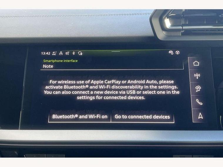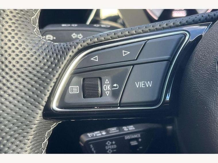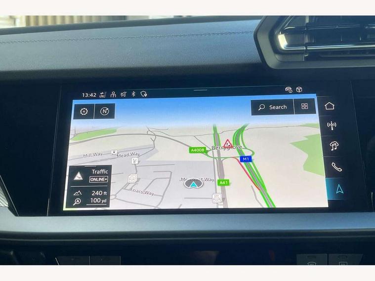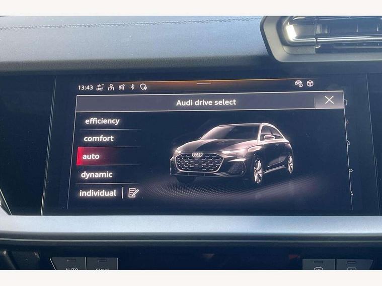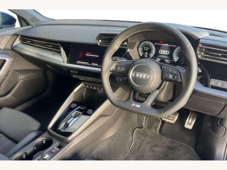 Adjustable speed limiter, Audi drive select, Audi smartphone interface with app store includes wireless Apple carplay, Android auto and Amazon alexa integration, Audi virtual cockpit plus - 12.3" full HD resolution dynamic digital instrument cluster, Automatic start/stop system with recuperation, Bluetooth interface, Camera based traffic sign recognition, Collision avoidance assistant, Cruise control, Distraction and Fatigue warning, e-Call (emergency call), Electromechanical power speed sensitive steering, Emergency assist, Lane departure warning system, MMI Navigation Plus with high resolution 10.1" colour touch screen display, Park Assist with parking system Plus, Service indicator, Trip computer, Voice control system with natural language interaction, 3 pin 10 amp domestic charging cable, CCS socket for DC charging, Charging cable for public charging, mode 3 (type 2), 32 A, Compact charging system, Industrial connector CEE 32 A, 230 V, length 1.6 m, Standard suspension, Type 2 socket for AC charging, Audi Phonebox light with wireless charging, Audi sound system - 10 loudspeakers including centre loudspeaker and subwoofer, DAB Digital radio, USB ports with charging function in the rear, Acoustic glass windscreen, All weather light, Aluminium window trim, Auto dimming frameless rear view mirror, Automatic dynamic range control, Body colour exterior mirrors, Chrome exhaust tailpipes, Dipped beam, main beam, position light and turning light, Electrically adjustable/heated/folding/auto dimming door mirrors with integrated LED indications + kerb view function for passenger side, Exterior model badging, Front and rear side air inlets in grained matt black with dark liquid chrome frame, Front electric windows, Front radiator grill in high gloss dark chrome, Heat insulating glass windscreen, Illuminated door sills with aluminium inserts at the front with S logo, Intersection light, LED 3rd brake light, LED brake lights, LED daytime running x3, LED headlights with LED rear lights and dynamic rear indicators, LED rear number plate lights, LED reverse light, LED tail lights, Light and rain sensors, Manoeuvring light, Motorway light, Privacy glass - dark tinted rear window, rear door and side windows, Rear diffuser and grill in grained matt black with inlay in dark liquid chrome, Rear electric windows, Rear side wing doors, Rear wiper, S line bumpers, S roof spoiler, Side S line emblems on front wings, Side sill trim in dark liquid chrome, Static Cornering lights, 12V socket and storage compartment in front centre console, 3 seat bench in 2nd row, 3 spoke flat bottomed leather multifunction sport steering wheel with gear shift paddles, 3-zone deluxe automatic air conditioning, 4 way electrically adjustable lumbar support for driver and front passenger, 40/20/40 split folding rear seat bench, Black cloth headlining, Black front and rear floor mats, Convenience auxiliary air conditioning, Front and rear centre armrest in artificial leather with contrasting stitching on armrests and instrument panel, Front and rear headrests, Heated front seats, Height and reach adjustable steering wheel, Manual boot compartment lid, Manually adjustable front seats, Rear centre armrest with cupholder, S badging on the steering wheel, Seat side bolsters, Single front passenger seat, Stainless steel pedals and front footrest in black, Twin leather upholstery with front sports seats S embossed logo, Aluminium interior elements pack - A3, Multi-coloured LED interior lighting package with Multi-coloured contour lighting of instrument panel - A3, 3x3 point rear seat belts, Acoustic vehicle alerting system, Driver and front passenger airbag with passenger airbag deactivation, Electronic Stabilisation Control (ESC) including ABS, ASR and EDL, First aid kit with warning triangle and 2 safety vests, Front side airbags with head airbags and interaction airbag, Hill hold assist, Pre-sense front with pedestrian and cyclist detection, Seatbelt monitoring, Tyre pressure loss indicator, Anti theft alarm, Anti-theft wheel bolts, Electronically operated child locks, Immobiliser, Remote central locking with safelock, Black dashboard, Inlay in dark aluminium spectrum, Tyre repair kit,