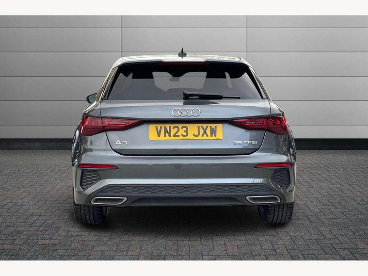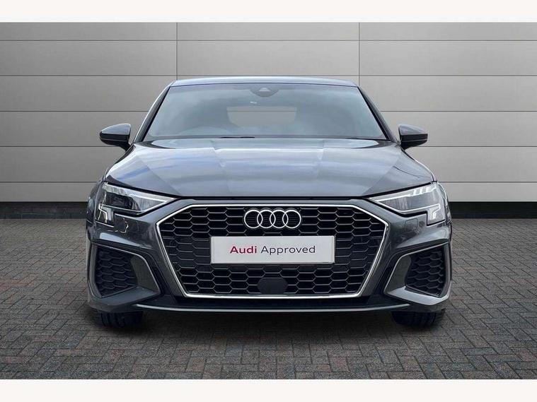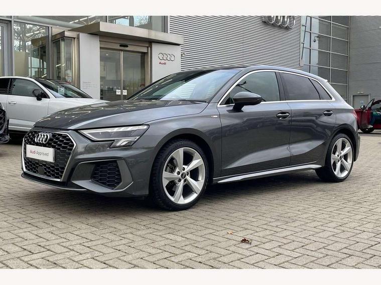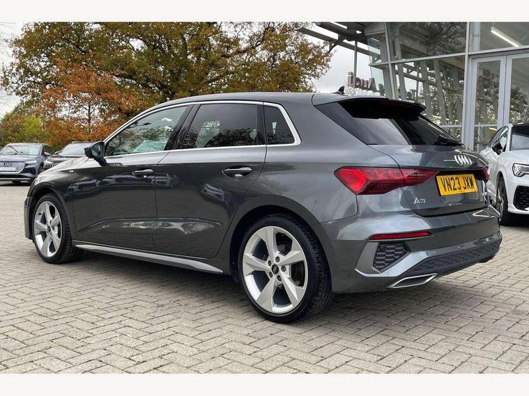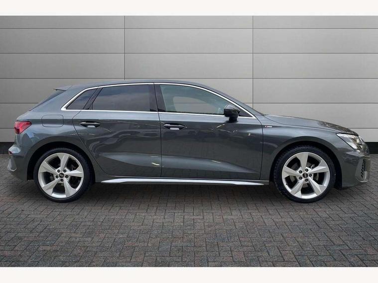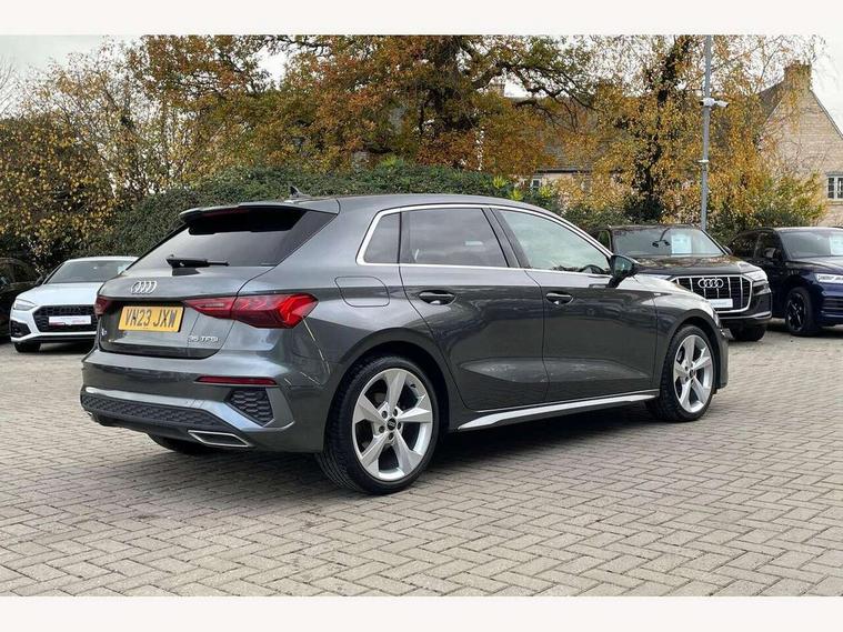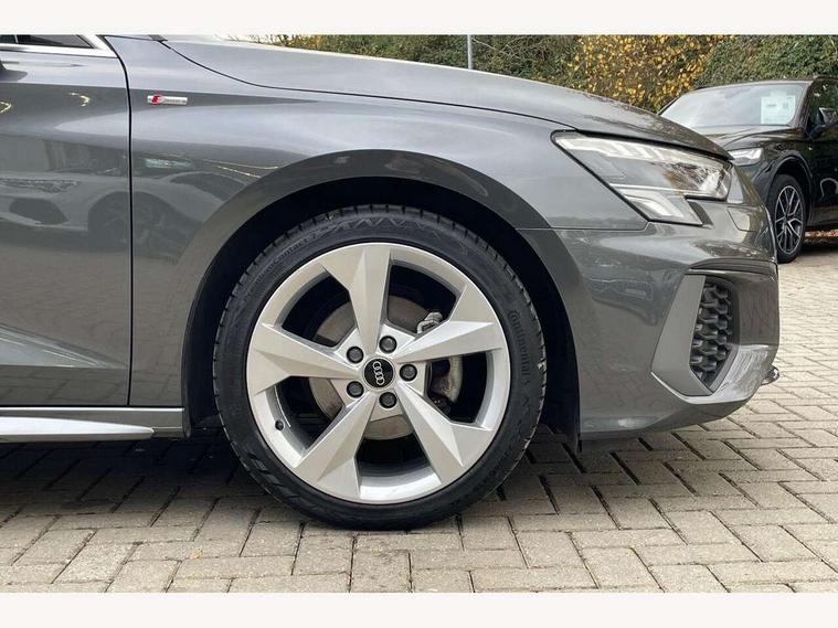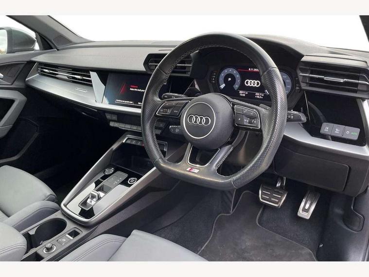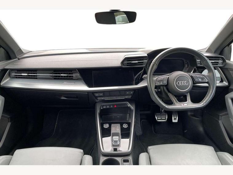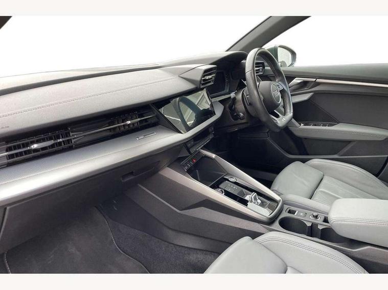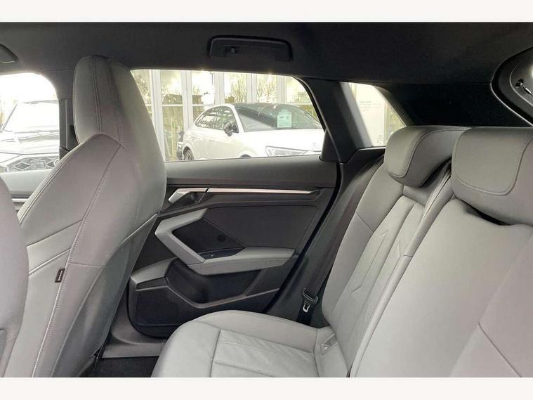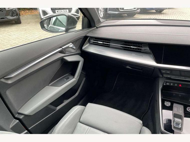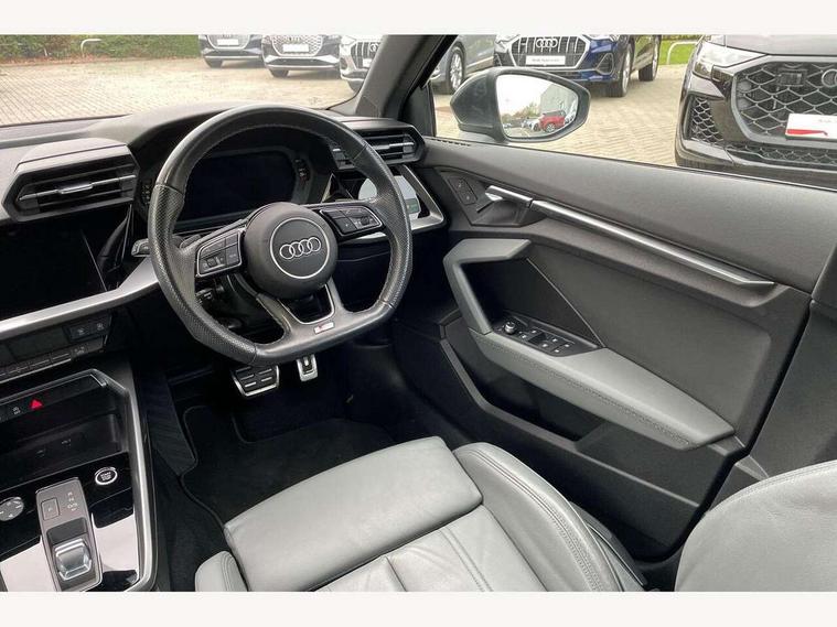 Audi drive select (Auto, Comfort, Dynamic, Efficiency and Individual), Audi smartphone interface, Audi Virtual Cockpit - 10.25" digital and colour instrument cluster, Automatic start/stop system with recuperation, Bluetooth interface, Camera based traffic sign recognition, Collision avoidance assistant, e-Call (emergency call), Electromechanical power speed sensitive steering, Lane departure warning system, MMI Navigation Plus with high resolution 10.1" colour touch screen display, Service indicator, Trip computer, Voice control system with natural language interaction, Sports suspension, 2xUSB-C connection with data and charging functions, 6 passive loudspeakers, DAB Digital radio, 3rd brake light, Acoustic glass windscreen, Aluminium window trim, Auto dimming frameless rear view mirror, Body colour exterior mirrors, Electrically adjustable/heated/folding/auto dimming door mirrors with integrated LED indications + kerb view function for passenger side, Front electric windows, Illuminated aluminium inserts front door sills with S logo, LED daytime running lights, LED headlights with LED rear lights and dynamic rear indicators, Light and rain sensors, Privacy glass - dark tinted rear window, rear door and side windows, Rear electric windows, Rear side air outlets in grained matt black, Rear side wing doors, Rear wiper, S line bumpers, S roof spoiler, 12V socket and storage compartment in front centre console, 3 seat bench in 2nd row, 3 spoke leather multifunction steering wheel with paddle shift, 4 way electrically adjustable lumbar support for driver and front passenger, 60/40 split folding rear seat bench, Black cloth headlining, Dual zone electronic climate control, Front and rear centre armrest in leather, Front and rear headrests, Front/rear floor mats, Height and reach adjustable steering wheel, Interior lighting - glove compartment light and right hand side, Luggage compartment floor covering, Manual boot compartment lid, Manually adjustable front seats, Seat side bolsters, Single front passenger seat, Stainless steel pedals and front footrest in black, Twin leather upholstery with front sports seats S embossed logo, Aluminium interior elements pack - A3 Sportback, LED interior lighting pack - A3 Sportback, S line styling pack - A3 Sportback, 3x3 point rear seat belts, Driver and front passenger airbag with passenger airbag deactivation, Electronic Stabilisation Control (ESC) including ABS, ASR and EDL, First aid kit with warning triangle and 2 safety vests, Front side airbags with head airbags and interaction airbag, Pre-sense front with pedestrian and cyclist detection, Seatbelt monitoring, Tyre pressure loss indicator, Anti theft alarm, Anti-theft wheel bolts, Electronically operated child lock, Immobiliser, Remote control central locking, Dark spectrum aluminium inlays, accent surfaces in the dashboard and centre console in platinum grey silk effect paint finish,