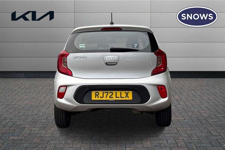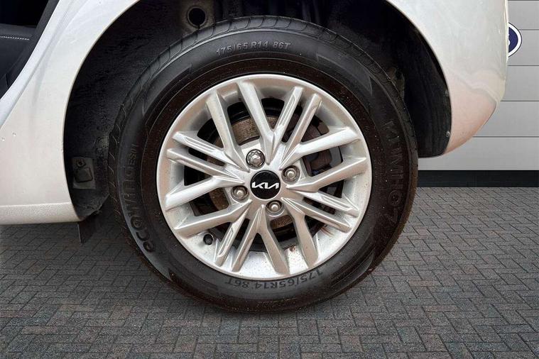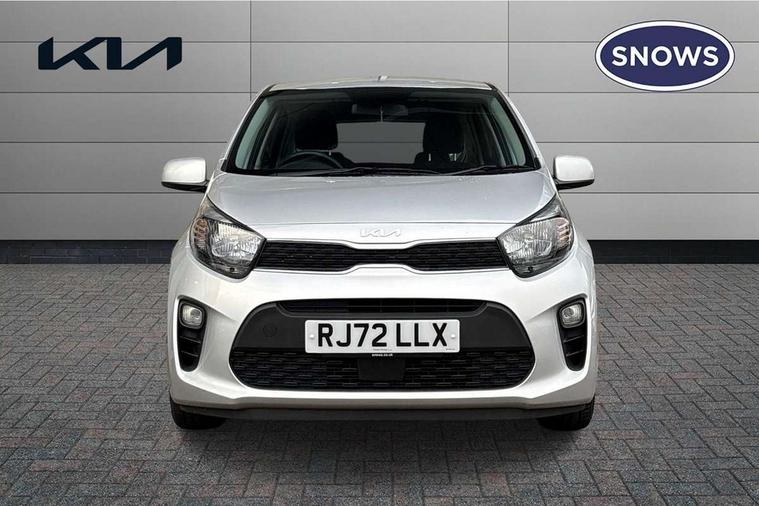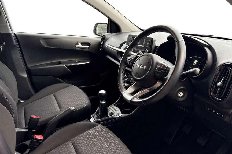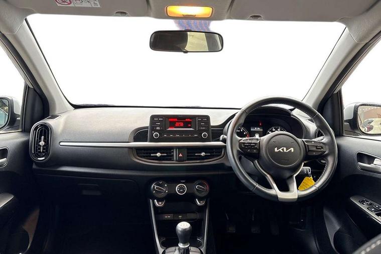 3.8" monochrome audio display with RDS and DAB, Emergency call service, Emergency stop signalling system, External temperature gauge, Motor driven power steering, Tachometer, Tailgate, Trip computer, 4 speaker audio system, Bluetooth with music streaming, Steering wheel mounted controls, USB ports for connection of a media device, Automatic headlight control system, Black radiator grille with chrome surround, Body colour bumpers, Body colour mirrors and door handles, Day/night rear view mirror, Daytime running lights, Electric adjustable heated door mirrors, Front and rear electric windows with drivers's auto up/down function, Headlamp levelling, Heated rear window, High mount brake light, MFR - Multi Focus Reflector halogen headlights with black bezel, Rain sensor, Rear fog lights, Rear side wing doors, Rear wash/wipe, Speed variable front wipers, Tinted glass, Visible VIN plate, Welcome and follow-me home light functionality, 1 x rear coat hook, 12V power point front, 2 seat bench in 2nd row, 3 x passenger assist grips, 60/40 split/folding 2nd row of seats, All round height adjustable headrests, Cupholders in centre console, Driver and front passenger sunvisor with vanity mirror, Driver seat height adjust, Front cabin lights, Glovebox, High gloss lower centre fascia trim, door armrest and air vents, ISOFIX Child seat top tethers and anchor fixings, Leather trimmed steering wheel and gearshift, Luggage area light, Luggage area parcel shelf, Manual air conditioning, Passenger front seatback pockets, Premium cloth upholstery, Silver paint finished interior door handles, Single front passenger seat, Slide/reclining front seats, Tilt adjustable steering wheel, Advanced Driver Assistance Pack - Picanto, 2 x 3-point rear seatbelts, ABS/EBD, Automatic unlocking of doors in case of impact, Dual front airbags, ESC + BAS + VSM + HAC, Front passenger airbag cut-off switch, Front seatbelt height adjusters, Front seatbelt pretensioners + load limiters, Hill hold control, Knee airbags, Rear child proof door locks, Seatbelt warning, Side impact protection, Torque vectoring brake based and straight line stability (SLS), Traction control, Twin curtain airbags, Twin front side airbags, Tyre pressure monitoring system, Anti theft alarm, Engine immobiliser, Folding key, Locking wheel nuts, Remote central door locking, 14" alloy wheels, Tyre mobility kit,