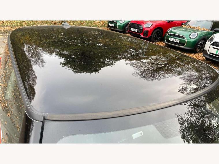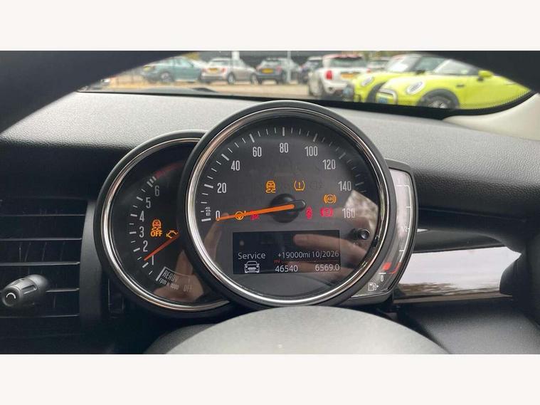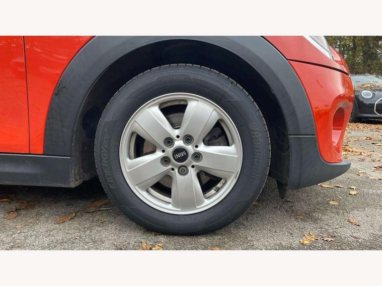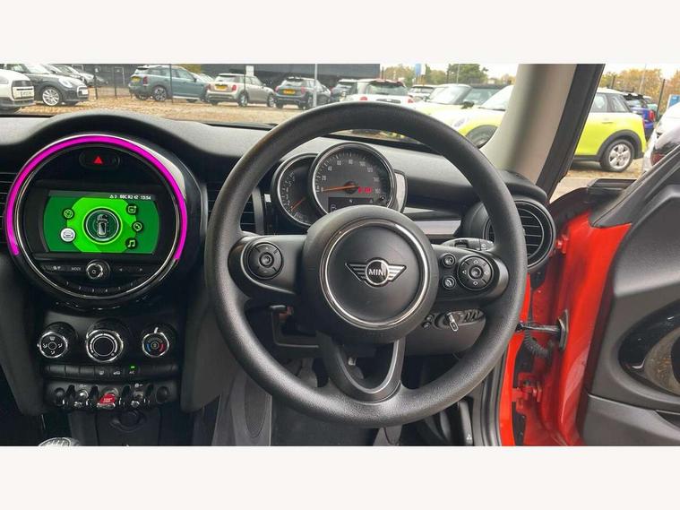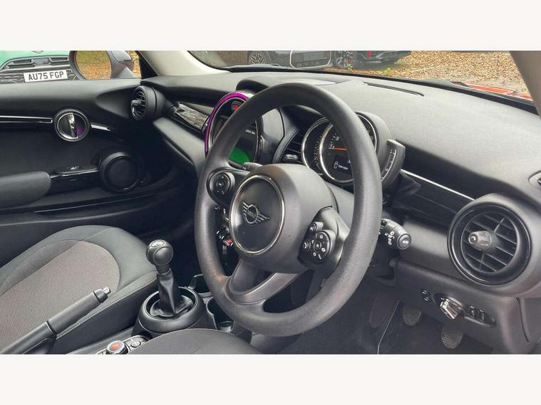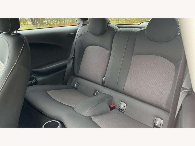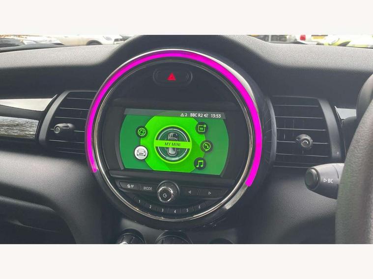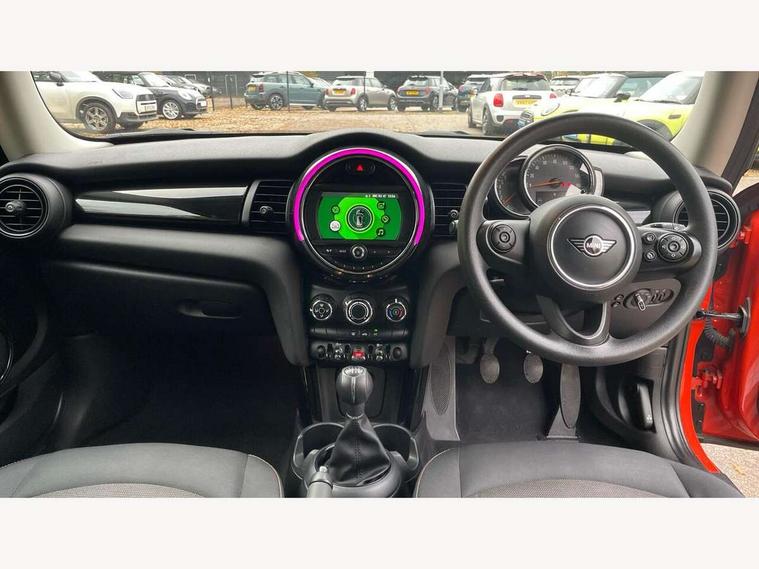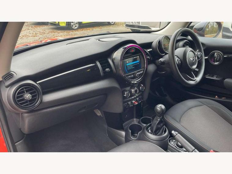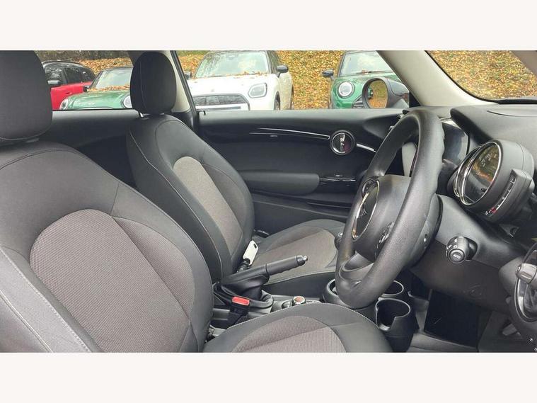 Compatible mobile phone bluetooth with audio streaming, Instrument cluster, Mini E-call, MINI TeleServices, On board computer, Service interval indicator, 6.5" touchscreen with LED ring, FM tuner and DAB digital radio, Automatic headlight activation switch, Body colour fuel filler cap, Chrome border high gloss black slats radiator grille, Dynamic brake lights, Electric front+rear windows, Heated rear window, Heated windscreen washer jets, LED headlight with closed ring and daytime driving lights, Left exhaust tailpipe with chrome finisher, Metal door sill strips with MINI imprint, Model logo Cooper on right of tailgate, Rain sensor window wipers, Rear fog lights, Rear LED lights with union jack design, Rear window wiper, Side scuttle panel with integrated indicator, Sun/heat protection glass, White indicator lenses, 12V Accessory socket in centre console, 4 lashing eyes in luggage compartment, 60/40 split folding rear seat, Chrome interior highlights, Colour line - Carbon black, Cupholders, Front and rear isofix with front passenger airbag deactivation, Glove compartment, Height and length steering column adjustment, Interior lighting with 12 basic colours selectable via toggle switch in roof, Leather gearshift lever and handbrake gaiters, LED reading lights, vanity mirror lights, front foot well light and spotlight on front seats, Manual air conditioning, Mechanical seat adjustment, driver seat height adjust, forward/back and front seats backrest, Mini logo projection on floor from drivers exterior mirror, Multifunction steering wheel, Satellite grey headlining, Storage compartments in doors, Sunvisors with vanity mirrors, 3 point seatbelts on all four seats, 6 Airbags - front, side, head and seat belt tensioners, Anti-lock braking system (ABS), DSC - Dynamic Stability Control, Front and rear disc brakes, Hill start assist, Single tone fanfare horn, Tyre pressure monitoring system, Alarm system with tilt sensor, monitoring doors, bonnet interior and tailgate, Electronic vehicle immobiliser, Start/stop toggle with keyless go, Tool kit,