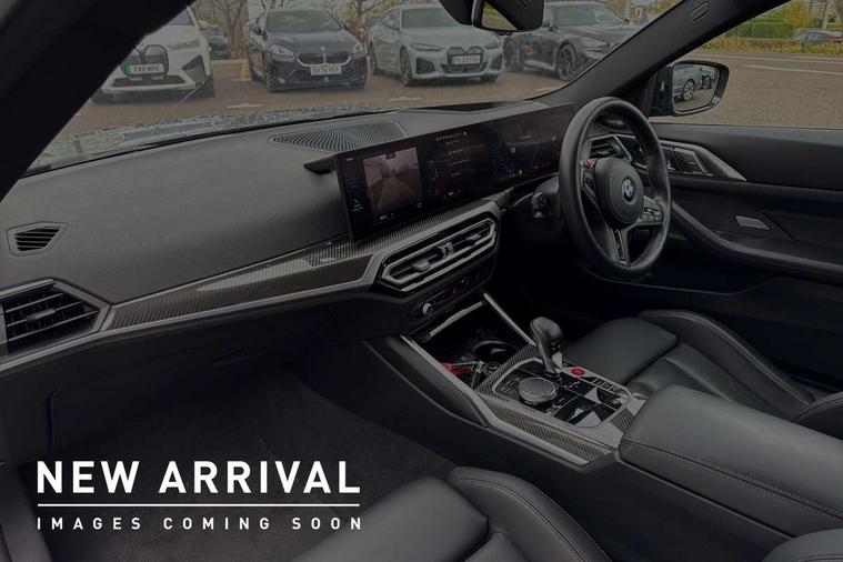 Active guard plus, Automatic start/stop system, BMW ConnectedDrive online services, BMW legal emergency call, BMW Live Cockpit Pro with Head up display including 12.3" instrument display and 14.9" high resolution control display with navigation function, BMW Teleservices, Brake pad wear indicator warning light, Condition based service, Door/boot open warning light, Driving experience switch, Electric Power Steering (EPS) with Servotronic, iDrive controller on centre console, Instrument cluster with extended contents, Language version English, Lights on warning, M drive buttons, Oil sensor for level and grade, warning by check control system, Oil temperature gauge, On board computer, On board diagnostics, Optimum shift indicator, Outside temperature display, Park distance control, Pull away assistant, Run flat indicator, Service interval indicator, Shifting point display, Speed limiter, Start/stop button in blue, Variable sport steering, Adaptive M Sport suspension, Double joint spring strut front axle, M Drive Professional including track mode, laptimer, traction control & Drift analyser, M Sport differential, M steptronic sport transmission with drivelogic, Safety battery terminal clamp, 8 programmable favourite buttons, Auxiliary point for auxiliary devices, BMW professional radio/CD/MP3, DAB Digital radio, Harman/Kardon loudspeaker system, Acoustic laminated side glass, Auto dimming driver's door mirror, Auto dimming rear view mirror, Automatic headlights + automatic windscreen wipers, Black chrome exhaust tailpipes, Black model designation badges, BMW high gloss shadow line with extended contents, BMW Individual shadowline lights, Body colour bumpers, Body colour door handles, Carbon fibre reinforced plastic (CFRP) roof, Day time running light, Door mirror integrated indicators, Door sill finishers with aluminium inserts, Dynamic brake lights, Electric adjustable heated door mirrors, Electric folding door mirrors, Follow me home headlights, Front and rear bumper system, Front electric windows with open and close fingertip control, anti trap facility and comfort closing, Headlight beam throw control, Heat protection, sun protection glazing, Heated washer jets, High beam assistant, High gloss black frameless kidney grille with M badge, LED number plate light, LED tail lights with 3D L-shaped LED light design, M designation, Mirror glass aspheric on driver's side, convex on passenger side, Rain sensor, Rear boot, Rear fog lights, Rear reflectors, Reversing light, Shark fin roof aerial, Third brake light, Visible VIN plate, Welcome lighting, 2 cupholders in front centre console, 2 cupholders in rear armrest, 2 rear head restraints, 2 x 12 V Power sockets (luggage compartment and front centre console), 2 x USB Type C ports for charging and data transmission in front centre console, 40:20:40 split folding rear 2 seat bench with loading system, Ambient lighting, Anthracite headlining, Battery in luggage compartment, Carbon fibre centre console incl. cover for cupholders and storage compartment, Carbon fibre decorative steering wheel finishers, Carbon fibre shift paddles, Carbon fibre strip in instrument panel on front passenger side, Centre console armrest with storage compartment, Compartment in front of cupholder, Driver/passenger sunvisors with ticket holders + illuminated vanity mirrors, Electric front seats + driver memory, English handbook, Floor mats in velour, Footwell lighting, Front and rear door exit lights, Front door storage bins with bottle holder, Front interior light, Front isofix attachment + airbag deactivation, Front reading light, Front seat backrest width adjustment, Front seats lumbar support, Front/rear door armrests, Gearshift lever with embossed M badge, Heated front seats, Height adjustable front headrests, Illumination in armrest storage compartment, Interior mirror lighting, Isofix on 2nd row outer seats, Lockable/illuminated glovebox, Luggage compartment lighting, Multifunction steering wheel, Rake/reach adjustable steering wheel, Single front passenger seat, Storage compartment in rear doors, Storage tray and compartment with cover in centre console, Three zone automatic air conditioning, Toolkit located in luggage compartment, Wireless charging tray, Additional storage compartment pack - M4, Connected package professional - M4, High gloss shadowline exterior trim pack - M4, 4 x 3 point seatbelts, ABS/EBD, Automatic Stability Control (ASC), Brake energy regeneration, Brake fade compensation, Compound structure brake discs, Cornering brake control (CBC), Crash sensor, Curtain airbags, Driver/Front Passenger airbags, Dry braking, Dynamic brake control, Dynamic stability control + (DSC+), Dynamic Traction Control - DTC, Electromechanical parking brake, Electronic differential lock control (EDLC), Front and rear head airbags, Front seat side impact airbags, Front seatbelt pretensioners + load limiters, Hill start assist, M Sport seat belts, Seat occupancy detection for driver and passenger side, Seatbelt warning, Side impact protection, Two tone horn, Tyre pressure sensor, Warning triangle and first aid kit, Centre lock switch, Closing system with central locking, Digital key, Electronic immobiliser, Remote central locking, Thatcham cat 1 remote alarm, Vehicle Key with 4 buttons including the integrated key, Galvanic finish to control surrounds, High gloss black interior trim, Tyre repair kit,