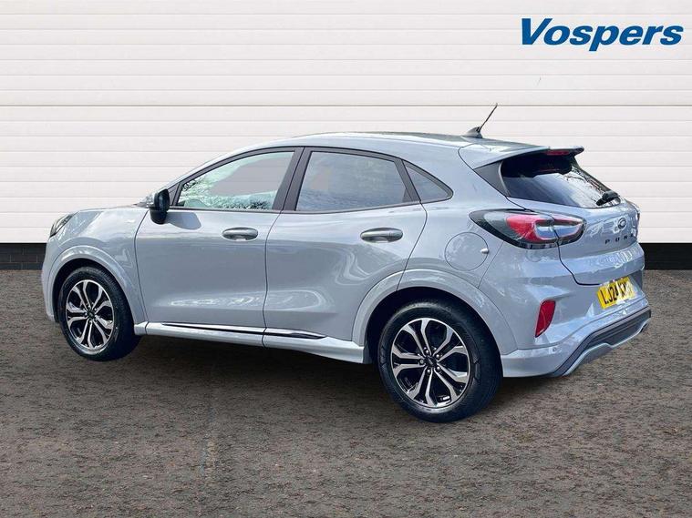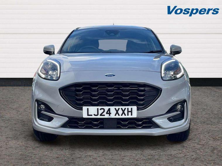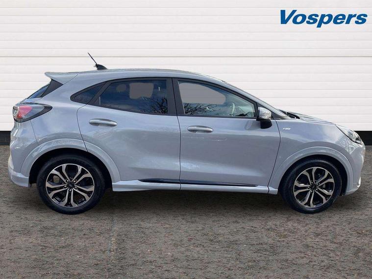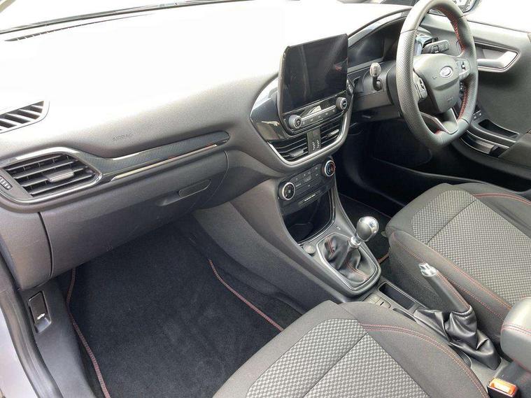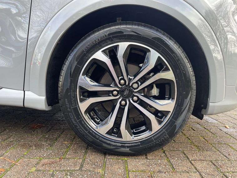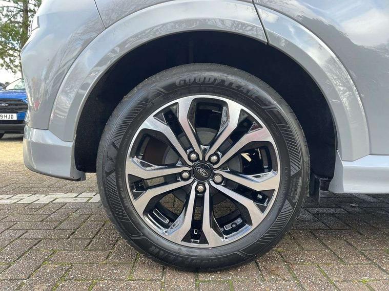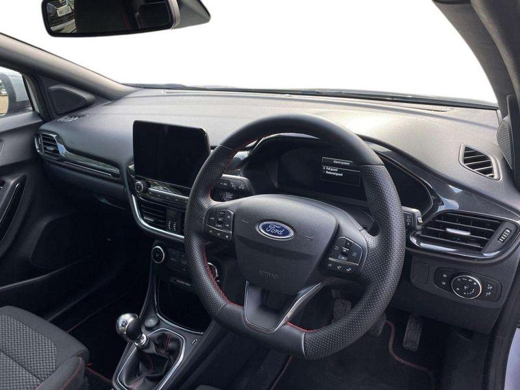 Driver impairment monitor, Emergency call service, Ford easy fuel, Full digital 12.3" instrument cluster, Lane keeping aid with lane departure warning, Power assist steering, Power start button, Rear parking sensor, Selectable drive modes(Normal, sport, Eco, trail, slippery), Speed sign recognition, Sport suspension, Automatic headlights with auto high beam, Automatic rain sensing wipers, LED rear lamps, Power foldable heated door mirrors with puddle lamps, Projector headlamps with LED day time running lights and front fog lamps, Quickclear heated windscreen, Rear side wing doors, Rear wiper, ST-Line body styling kit with unique grille, Third brake light, 3 seat bench in 2nd row, Centre console with armrest and stowage, Ford megabox extended bootspace, Front and rear head restraints, Front floor mats, Manual 2 way passenger seat adjustment, Manual 4 way driver seat adjust with lumbar adjustment, Single front passenger seat, ST- Line cloth trim with red stitching, ST-Line flat bottomed sensico leather steering wheel with leather handbrake and aluminium gear knob, Ford SYNC 3 navigation pack - Puma, 3 rear seatbelts, Child safety lock, Electronic stability control (ESC) and hill start assist, Pedestrian/cyclist detection & post-collision braking, Pre collision assist system, Tyre pressure monitoring system (TPMS), Thatcham alarm,