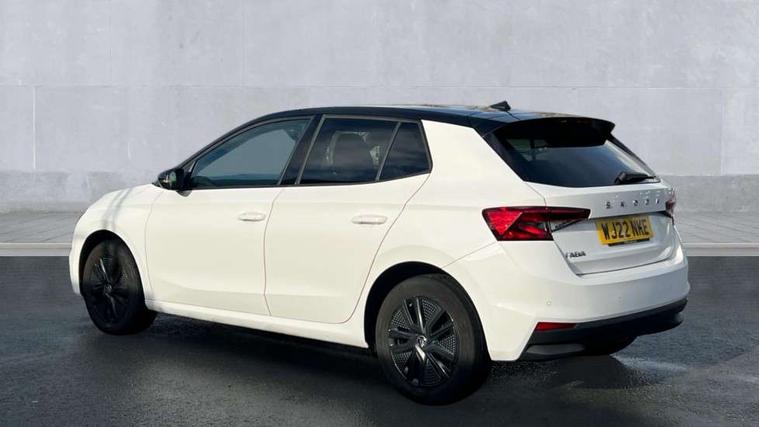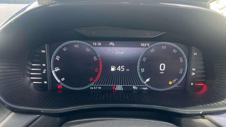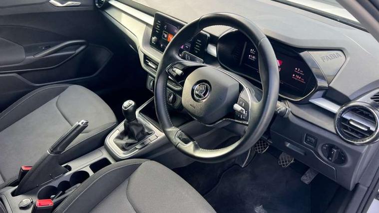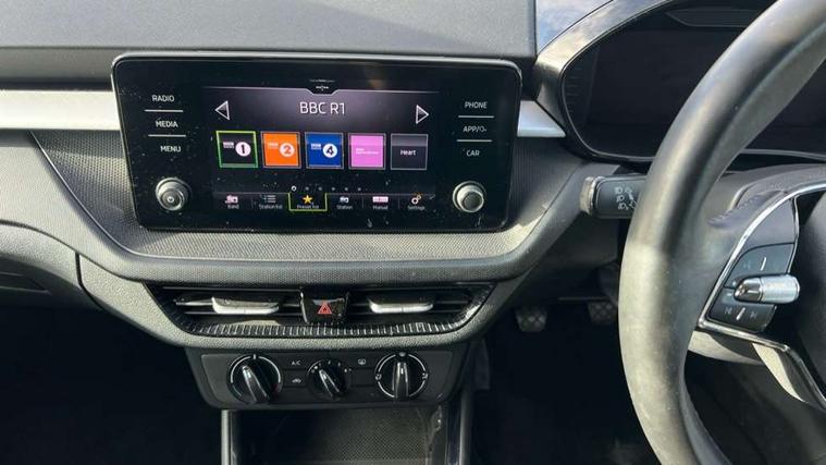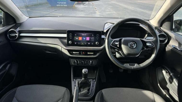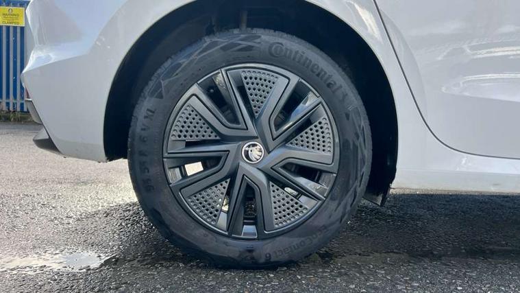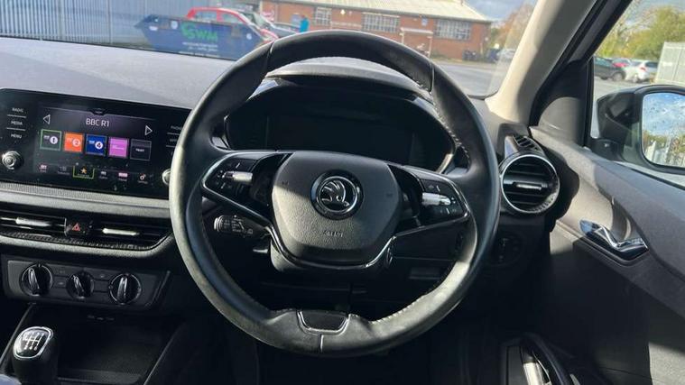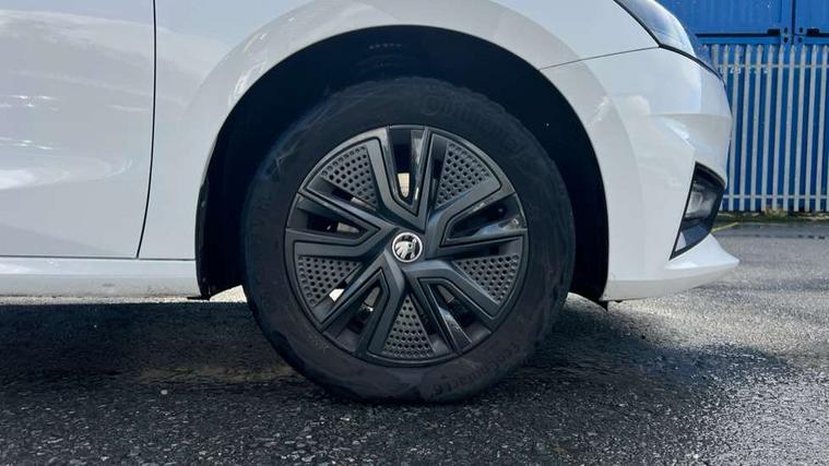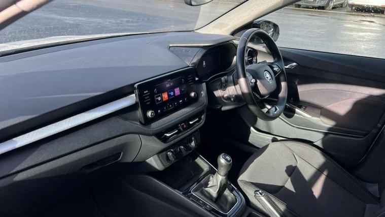 Bluetooth connection, Driver alert system - DAS, Electromechanical power steering, Exterior temperature gauge, Lane assist including road edge detection, Service interval indicator, Virtual cockpit with 10.25" colour display, 2x USB-C in the front (for data transmission and charging), 6 Speakers (4 in front and 2 in rear), Auxiliary socket for external MP3 player, Bolero radio with 8" colour display, DAB digital radio reception, Basic rear lights, Body coloured bumpers, Dimming rear view mirror with black frame, Door mirror integrated indicators, Electrically adjustable and heated door mirrors, Electrically adjustable front windows with function auto up/down, Front window wiper intermittent control, Headlight range control - Automatic, Ice scraper in fuel cap, LED daytime running lights with coming and leaving home feature, Mechanical adjustable rear windows, Privacy glass, Rear LED fog light, Rear side wing doors, Rear window wiper with washing nozzles, Roof mounted spoiler, SKODA tailgate lettering in chrome, Third brake light, 3 rear headrests, Backrest split and folding, Central console with fixed cup holder and storage box, Chrome handbrake release button, Fabric upholstery, Gearshift knob/handle in leather, Grain satin black interior door handles, Hand brake lever handle in leather, Height adjustable front headrests, Height adjustable steering wheel, ISOFIX and TopTether anchorage points to the outer rear seats, ISOFIX and TopTether on the front passenger seat, Luggage compartment lighting, Pollen filter, Rear seat bench unsplit, Single front passenger seat, Storm grey headlining, Sun visors with mirror and airbag label on passenger side, Ticket holder, Umbrella in drivers door, 3-point height adjustable front seats belts with pretensioner and force limiter, Automatic warning lights in case of crash, Driver and passengers airbag with switch off function, e-Call+, ESC including ABS, MSR, ASR, EDS, HBA and XDS, Front and rear seat belt warning, FRONT ASSIST (AEB City and AEB Inter Urban), Front side airbags, Head airbags, One tone horn, Pedestrian protection, Three rear 3-points safety seat belts with pretensioner and force limiter including stop function for outer rear seat belts, Tyre pressure monitoring system, Anti-theft alarm system including immobiliser, interior monitoring, backup horn, and towing protection, Anodized cross line upper decorative trim, Colour Edition air vents, Grain satin black central console cover, Grain satin black lower decorative trim, Satin black door and side trim panel in front, Anti-theft wheel bolts protection, Super-low rolling resistance tyres,