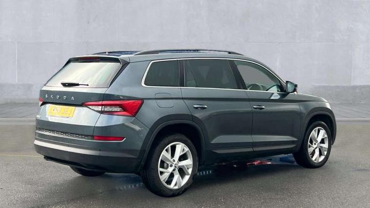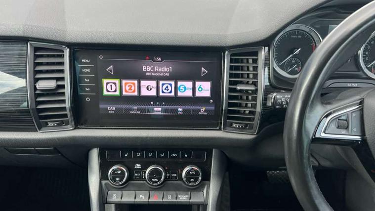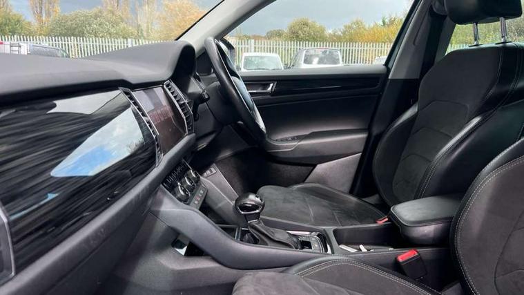 Bluetooth system, Colour multifunction trip computer, Columbus satellite navigation with 9.2" touch screen and integrated Wi-Fi + WLAN, Digital voice enhancement, Drive mode selector, ECO Stop/start function, Exterior temperature indicator, SmartLink plus, Speed limiter, Tailgate unlocking from outside, Bolero Radio, DAB Digital radio, DVD System, USB and SD card connectivity, Aero front windscreen wipers with intermittent function, Aero rear window wiper, Auto dimming rear view mirror, Automatic activation of hazard warning lights, Black wheel arch surrounds, Body colour bumpers, Body colour door mirrors and handles, Electric front and rear windows, Electrically adjustable heated foldable and auto dimming door mirrors with boarding spots, Front and Rear door steps, Full LED Headlights with adaptive front light system and LED daytime running lights, Headlight washers, Heated rear window, Invisible tailpipe, LED front fog lights with static cornering light function, LED rear fog light, LED third brake light in rear spoiler, Light assistant (coming home/tunnel light), Radiator grille frame in matt black with chrome strip, Rain and light sensors, Rear spoiler, Safety reflectors on front and rear doors, Sunset privacy glass, Tinted windows, 12V socket in boot, 2 rails with 2 hooks including 4 hooks for net programme, 4 foldable roof handles with rear coat hooks, 4 lashing points on luggage floor, 60:40 foldable rear seat with sliding adjustment and backrest angle adjustment, Bottle holders in door panel in the 1.5 litre front and 1 litre rear, Cargo storage compartments, Centre console with open storage box, cup holder and 12V socket, Chrome headlight control button, Chrome interior door handles, Coat hooks on B pillar, Covered storage compartment on driver side, Drawers under driver and front passenger seats, Front centre armrest with storage compartment, Front/rear courtesy lights, Gear shift lever with chrome frame and black gloss insert, Height adjustable front headrests, Illuminated and cooled glovebox, Illuminated luggage compartment, Isofix system on outer rear seats, Manually adjustable steering column, Net programme in boot (1x horizontal Net, 2x vertical Nets), Overhead glasses storage compartment, Passenger side net compartment on centre console, Pollen filter, Rear centre armrest with cupholders, Removable lamp in luggage compartment, Roll up luggage compartment cover with intermediate position, Small Bags on the inner sides of the front backrests, Small pockets on the inner side of the front backrests, Storage compartment in lower middle Instrument panel, illuminated with closing, Three rear height adjustable headrests, Ticket holder on A Pillar, Umbrella in door panel, Chrome pack - Kodiaq, Auto door release and activation of warning lights in the event of an accident, Driver and passenger airbags, Electronic parking brake with hill hold control, Emergency rear braking signal, ESC (incl. ABS+MSR+ASR+EDS+HBA+DSR+RBS+MKB), Front and rear three point safety belt on all seats, Front assist includes AEB city/urban, Front side airbags, Fuel cut off safety device, Head and knee airbags, Passenger airbag deactivate switch, Rear disc brakes, Safety vest holder in door, Seat belt reminder for all seats, Two tone horn, Tyre pressure monitor, Warning lights in front doors, Alarm with interior monitoring and tilt sensor with safe function, Immobiliser, Keyless entry and start system (KESSY), Remote central locking,