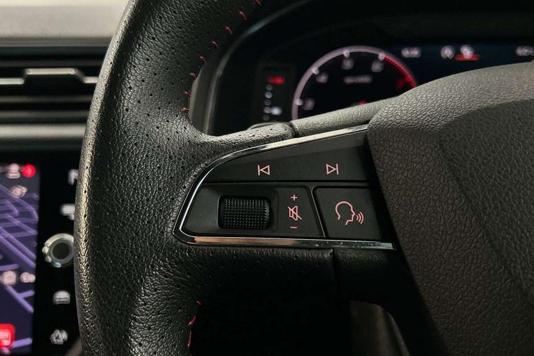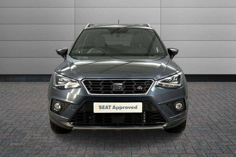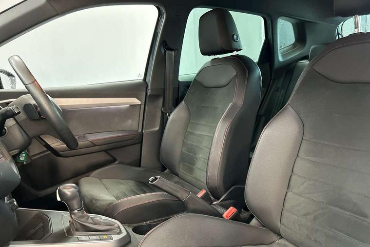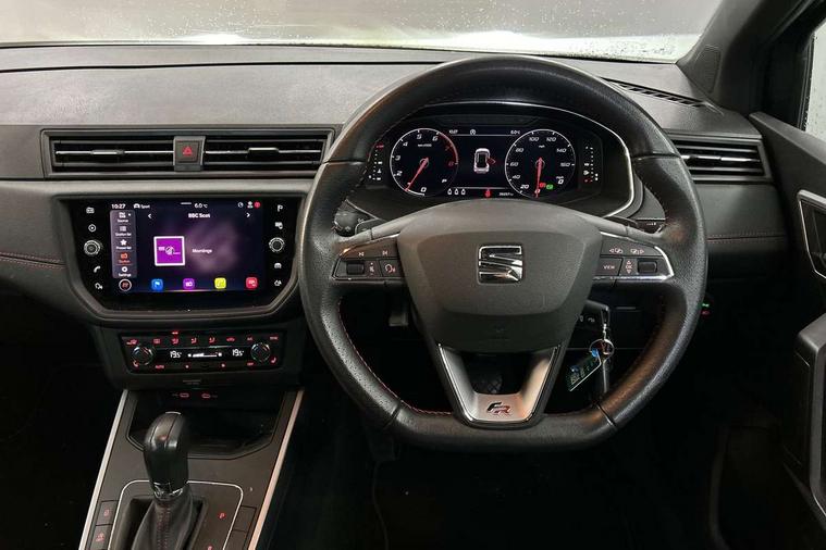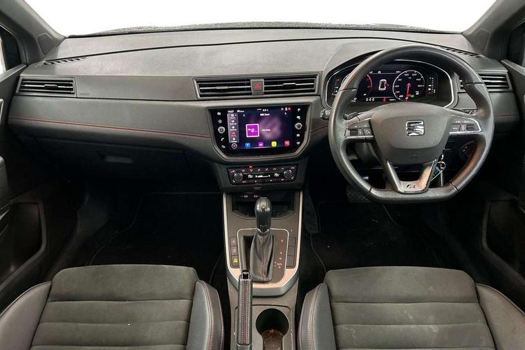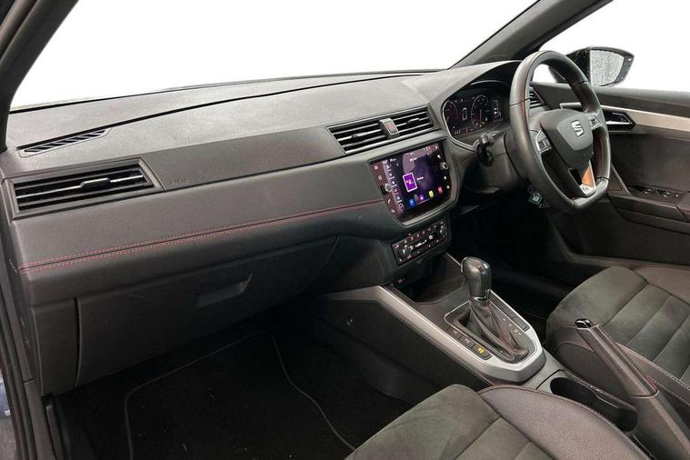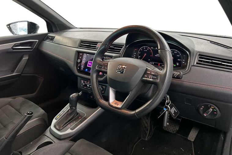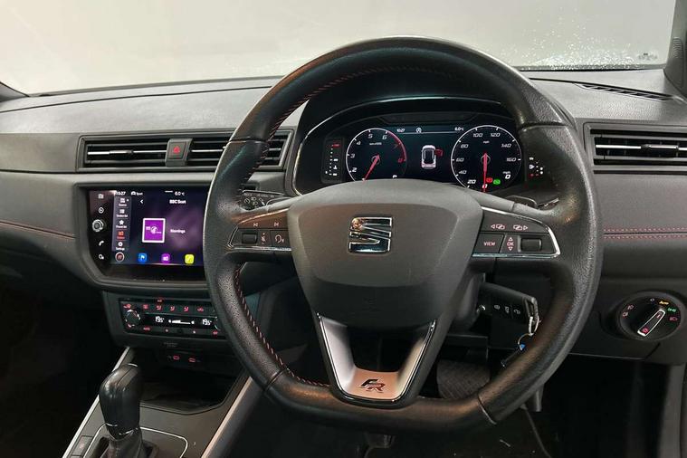Interior chrome line trim, Leatherette dashboard, Connectivity pack plus - Arona, Interior chrome pack - Arona, 18" Performance alloy wheels, 2 folding remote keys with window open/close function, Alarm with back-up horn, Electronic engine immobiliser, Locking wheel bolts, Remote central locking + deadlocks, Tow away protection, 6 speakers, Bluetooth interface for hands free and audio streaming, DAB digital radio and AM/FM radio, Steering wheel mounted audio controls, 3 point seatbelts on all rear seats, ABS, Active front headrests, Child locks on rear doors, Driver and front passenger airbags with front passenger airbag de activation, front side and curtain airbags, Electronic stability control, Emergency Brake Assist (EBA) and front assist, Front and rear seatbelt reminder, Hill hold control, Multi-Collision braking, Tiredness recognition system, Traction control, Tyre pressure monitoring system, Anti theft roof antenna, Auto dimming interior rear view mirror, Automatic activation of hazard warning lights, Automatic headlights, Body coloured bumpers, Body coloured door handle inserts, Chrome front grille frame, Chrome roof rails, Chrome window trim, Coming/leaving home lighting function, Dark tinted rear windows, Electric front/rear windows with one touch/auto up/down, Electrically adjustable, heated and folding door mirrors, Full LED headlights dipped and mainbeam + front and rear fog lights, Ice metal door side panels, LED daytime running lights, LED rear tail lights and licence plate lights, Protective side mouldings, Rain sensing wipers, Rear window wash/wipe, Roof colour door mirrors, Twin exhaust pipe styling hidden exhaust pipe, Visible VIN plate, Windshield wiper with intermittent control and potentiometer, 2 cupholders, 60/40 split folding rear seat, Aircare filter, Black interior roof, Double boot floor, Driver sunvisor with covered mirror + card holder, Dual zone climate control, Front courtesy light with front reading lights, Front sport seats, Gear shift indicator, Heated front seats, Height adjustable front seats, Height/reach adjustable steering column, Illuminated boot, Instrument lighting with brightness control, Interior light in footwell, central console and door panel, ISOFIX points in outer rear seats with top tether anchorage points, Microsuede cloth upholstery, Multi-colour ambient interior lighting, Passenger sunvisor with vanity mirror, Perforated flat bottomed leather steering wheel/gear knob/handbrake with red stitching and FR logo, Steering wheel mounted gearshift paddles, Two front and three rear height adjustable headrests, 'Lights On' Reminder warning buzzer, Cruise control and speed limiter, Digital clock, Digital cockpit, Electric speed sensitive power steering, Full Link Smartphone Integration with Mirror Link, Apple Car Play, Google Android Auto with USB cable for Apple and Android compatibility, Low fuel warning light, Outside temperature display, Rear parking sensor, RPM counter, Seat connect with safety, serivice, remote and online, SEAT Drive profile - Four different models normal-sport-eco-individual, steering response, throttle response and gear shifts mode, Trip computer, Sports suspension,