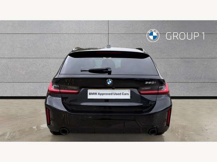 Active guard plus, Attentiveness assist, Automatic Start/stop button, BMW iDrive, BMW Teleservices, Condition based service, ConnectedDrive Services, Driving experience switch, Live cockpit plus with Navigation + 12.3" instrument display + 14.9" display, Intelligent voice assist, 2 USB, 4G LTE connect, Oil sensor for level and grade, Preparation for driver assistance, Shifting point display, Smartphone integration, Variable sport steering, Double joint spring strut front axle, Fuel tank breather system, M sport suspension, Sport automatic transmission with steering-wheel mounted gearshift paddles and launch control, DAB tuner, 3rd brake light, Acoustic glazing, Automatic headlight beam throw control with load dependent regulating reaction, dynamic compensation of braking dive and acceleration squat, BMW emblem, engine compartment lid and tailgate, Body colour roof fin, Door sill strips, Electric windows - front and rear, with open/close fingertip control, anti-trap facility and comfort closing, Follow me home headlight function, Front and rear bumper system with replaceable deformation elements, Front apron plastic in body colour, Fuel filler flap - right rear in body colour, Heated washer jets, Illuminated bow type door handles in body colour drivers side with door lock, Interior rear view electrochromatic mirror with automatic anti dazzle function, LED headlights with LED daytime running lights and LED turn indicator, LED rear lights, Licence plate panel integrated into front bumper and tailgate, Matt black B-pillar finsher, Matt black window recess cover, Model designation on right side of tailgate, One piece front bumper cover including towing eye cover in body colour, Rain sensor with automatic headlight activation, Rear side wing doors, Rear wiper, Reversing lights, Side frame decorative moulding black matt, Visible exhaust tailpipe finisher, Welcome lights in interior and door handle area, 12V power socket in front storage compartment, 2 front cupholder in centre console with clamping elements and matt black inlay, 3 seat bench in 2nd row, 3 zone automatic air conditioning, 40:20:40 split folding rear seat with loading system, Anthracite headlining, Armrest integrated in front and rear door trim + front centre console armrest, BMW ID, Cruise control operation in steering wheel, Driver backrest width adjustment, Folding rear centre armrest with 2 cupholders, Front and rear door exit lighting (left / right), Front and rear footwell lighting, Front and rear headrests, Front and rear reading lights, Front and rear velour floor mats, Front sport seats, Heated front seats, Height adjustable mechanically and infinitely variable steering column, Illuminated armrest storage compartment, Illuminated glove compartment, Illuminated luggage compartment, Lashing eyelets in luggage compartment, LED ambient lighting with welcome carpet light, M Sport multifunction leather steering wheel, Make-up mirror lights, Single front passenger seat, Standard seat for driver and passenger with manual adjustment, Sunvisors with vanity mirrors and ticket pocket, Toolkit located in luggage compartment, Connected pack professional - 3 Series Saloon/Touring, Interior and exterior mirror pack - 3 Series Touring/Saloon, M Aerodynamics package - 3 Series Saloon/Touring, M sport exterior styling pack - 3 Series Saloon/Touring, Storage compartment pack - 3 Series Saloon/Touring, 3x3 point rear seatbelts, BMW emergency call, Child locks on rear doors, Crash sensor activating of airbags, Unlocking doors, hazard warning lights, interior light, safety battery terminal, Driver and front passenger with seat occupancy detection for driver's and passenger side, Driver and passenger side airbags, body protection at side and airbags deploy from seat backrests, Dynamic brake control, Dynamic stability control + (DSC+) - Anti-lock Braking System (ABS) with brake assist and cornering brake control + Automatic Stability Control (ASC), Dynamic Traction Control - DTC, Electric parking brake including automatic hold function and automatic release of the parking brake when driving off, Electronic differential lock control (EDLC), Head airbags in 1st and 2nd row, head protection at side, curtain airbags open from headliner above 1st and 2nd row, Plastic fuel tank, Side impact protection, Tyre pressure monitoring with three level warning strategy, Ventilated front and rear disc brakes, Warning triangle and first aid kit, Alarm system, Centre lock switch, Closing system with central locking, Electronic vehicle immobiliser,