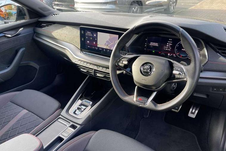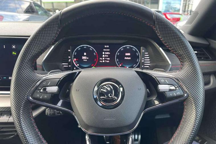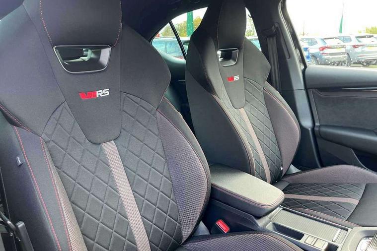 1x USB Type C port in rear view mirror (charging only), 2x USB Type C ports in rear of front centre armrest (charging only), Bluetooth system, Columbus satellite navigation with 10" touchscreen display, Driver fatigue sensor, eCall emergency system, Front and rear parking sensors with manoeuvre assist, Front assist system, Progressive dynamic steering, Smartlink (includes android auto and mirrorlink), Speed limiter, Turn Assist, Virtual Cockpit - 10.25" digital display, Voice control system, Wireless SmartLink for Apple Car Play, Electronically controlled limited slip differential, Front and rear stabilizers, 2x USB Type C ports (for charging and data transfer), 8 Speakers, DAB Digital radio, Aero front windscreen wipers with intermittent function, Auto dimming rear view mirror, Body colour door handles, Chrome exhaust tailpipes, Door sills with vRS logo, Electric front and rear windows, Exterior gloss black sports styling including front grille, side strip, window surrounds, door mirror and badging, Full LED Matrix headlights with AFS and cornering front fog lights, Headlight washers, Heated rear windscreen, High level third brake light, Ice scraper in fuel cap, LED daytime running lights, Rain and light sensors, Rear fog light on one side, Rear privacy glass, Rear side wing doors, vRS bumpers and lip spoiler, 3 rear headrests, 3 seat bench in 2nd row, 4 foldable roof handles, Aluminium pedals, Black headlining, Black microsuede padded dash panel with red contrast stitching, Chrome inner door handles, Front centre armrest, Front head restraints, Heated front seats, Illuminated glovebox, Leather trimmed gearshift lever, Luggage compartment lighting x1 light, Mechanical rear seat release, Parcel shelf - folding, Single front passenger seat, Sunglasses storage, Textile floor mat set, Three spoke leather sports multifunction steering wheel with paddles, Ticket holder, Umbrella in door panel, Unsplit rear bench seat and split folding backrest, LED interior light pack - Octavia, 3 point front/outer rear seatbelts+pre-tensioners, Alarm with interior monitoring, tilt sensor and back up horn, Automatic door unlocking in case of crash, Automatic fuel cut off in case of crash, Automatic warning lights in case of emergency braking, Curtain airbags and front side airbags, Driver and front passenger airbags, Drivers knee airbag, Electronic parking brake, Emergency call and proactive services, ESC including ABS, EBV, MSR, ASR, EDS, HBA, DSR, Front and rear disc brakes, Front central airbag, Hill hold control, Hill start assist, ISOFIX on front passenger seat and outer rear seats, Manual rear child locks, Passenger airbag deactivate switch, Red brake calipers, Two tone horn, Tyre pressure monitor, Visual and acoustic seat belt reminder, Warning reflectors in front door, Door locks with immobiliser, Keyless entry and start/stop including rear doors, Remote central locking, Carbon optic decorative inserts, Gloss black air vent surrounds, 19" Altair anthracite alloy wheels,
