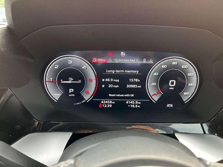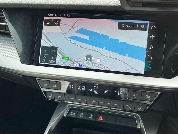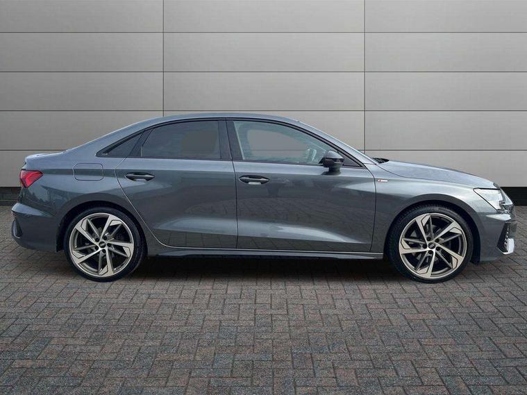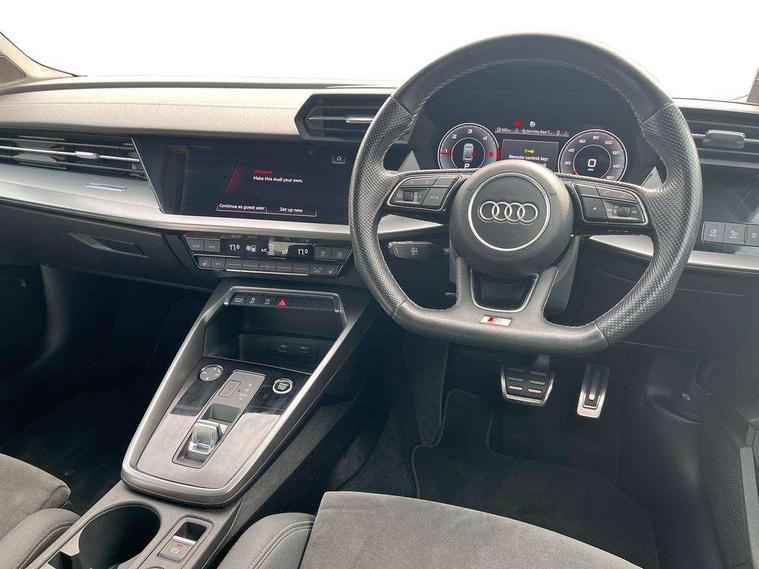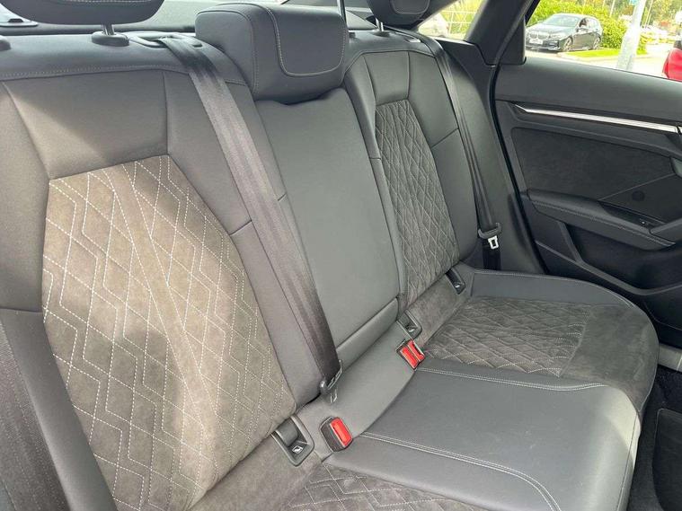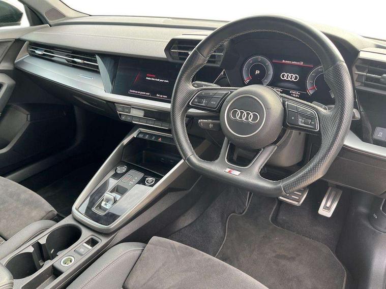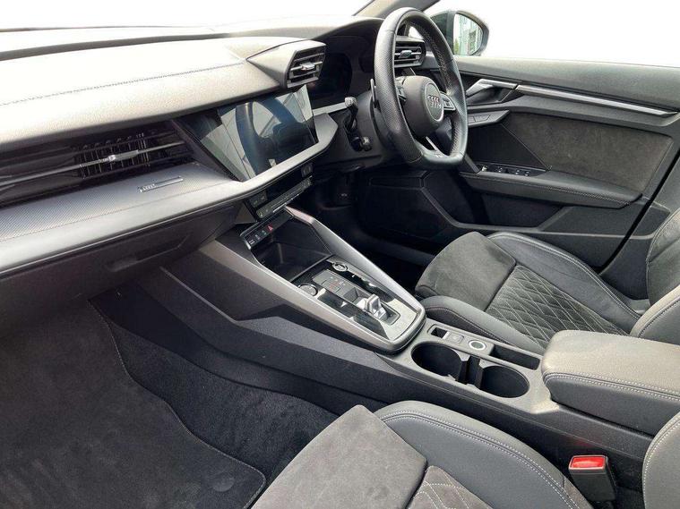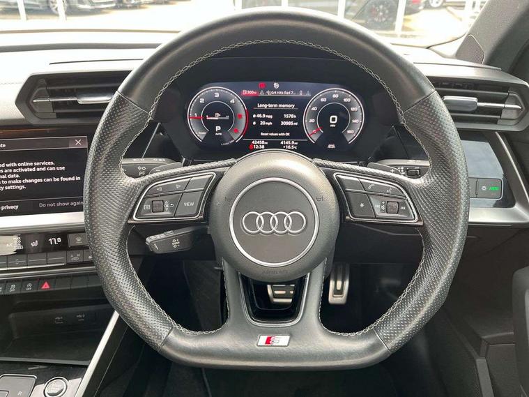 Audi connect emergency call and service, Audi drive select (Auto, Comfort, Dynamic, Efficiency and Individual), Audi smartphone interface, Audi virtual cockpit plus - 12.3" dynamic digital instrument cluster, Automatic start/stop system with recuperation, Bluetooth interface, Collision avoidance assistant, Cruise control + speed limiter, Electromechanical power speed sensitive steering, Lane departure warning system, MMI Navigation Plus with high resolution 10.1" colour touch screen display, Rear parking sensors, Service indicator, Voice control system, Diesel particulate filter, Sports suspension, 1xUSB-A and 1xUSB-C connection, 6 passive loudspeakers, CD player, DAB Digital radio, Acoustic glass windscreen, Auto dimming frameless rear view mirror, Automatic lights and wipers, Electrically adj heated/folding + automatically dimming exterior mirrors with memory + automatic kerb side function for passenger side exterior mirror, Front electric windows, Illuminated door sills with aluminium inserts at the front with S logo, Integrated LED indicators in door mirrors, LED daytime running lights, Light and rain sensors, Model and engine designation badges at rear, Privacy glass - dark tinted rear window, rear door and side windows, Rear electric windows, S roof spoiler, 12V socket and storage compartment in front centre console, 3 spoke flat bottomed multifunction plus sports contour leather wrapped steering wheel with shift paddles, 4 way electrically adjustable lumbar support for driver and front passenger, 40/20/40 split folding rear seat bench with cupholder, Alcantara/twin leather upholstery with front sports seats S embossed logo, Black cloth headlining, Dual zone electronic climate control, Electrically adjustable front seats with memory function for driver's side and exterior mirrors, Front and rear centre armrest in leather, Front and rear headrests, Front/rear floor mats, Heated front seats, Height and reach adjustable steering wheel, Interior lighting - glove compartment light and right hand side, Luggage compartment floor covering, Manual boot compartment lid, Seat side bolsters, Stainless steel pedals and front footrest, Aluminium interior elements pack - A3, Black styling pack - A3/S3, Extended ambient lighting pack - A3/S3 Saloon, LED interior lighting pack - A3 Saloon Edition 1/Vorsprung, Matrix LED Exterior lighting with headlight washer Pack - A3/S3, 3x3 point rear seat belts, Driver and front passenger airbag with passenger airbag deactivation, Electronic Stabilisation Control (ESC) including ABS, ASR and EDL, First aid kit with warning triangle and 2 safety vests, Hill hold assist, Pre-sense front with pedestrian and cyclist detection, Seatbelt monitoring, Tyre pressure loss indicator, Anti theft alarm, Anti-theft wheel bolts, Electronically operated child lock, Immobiliser, Remote control central locking, Aluminium air vent surrounds, Aluminium trim elements, Dark spectrum aluminium inlays, accent surfaces in the dashboard and centre console in platinum grey silk effect paint finish, 19" 5 arm trapezoid design alloy wheels in titanium matt grey with diamond cut finish,