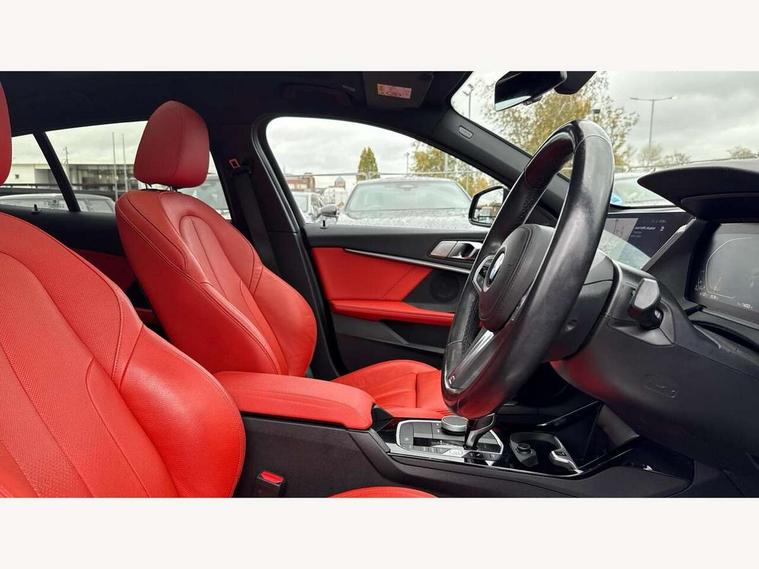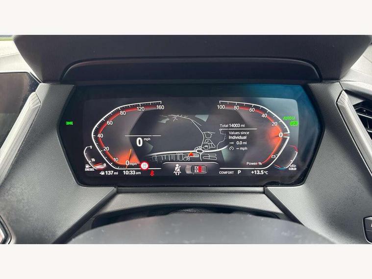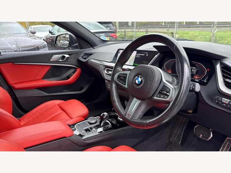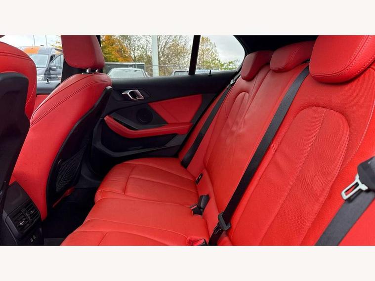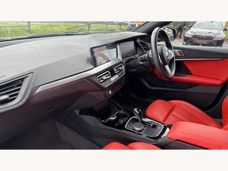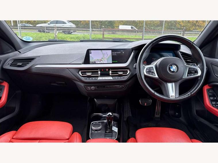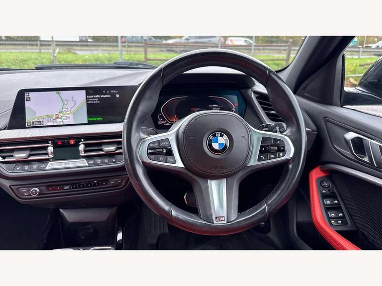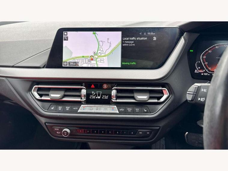 Active guard plus, Attentiveness assist, BMW ConnectedDrive online services, BMW Teleservices, Check Control warning system for monitoring of lights and door/luggage compartment open warning, Cruise control with speed limiter, Eco pro mode, Front axle single joint with specific axle kinematics to minimise drive influences on steering + provide increased rigidity agile driving behaviour, Integrated owners handbook, Lane departure warning system, Oil sensor for level and grade, On board computer, Optimum shift indicator, Personal Profile, Pull away assistant, Rigidly mounted rear subframe - Multi link construction with separate spring / damper configuration and excellent driving characteristics, Speed limit Info including no-overtaking indicator, AdBlue tank, Aluminium lightweight construction, Anti roll bar front and rear, Balancer shaft, Diesel particulate filter, Drive Performance Control, Electronic differential lock, M sport suspension, Single turbo charger with variable vane geometry, Twin tube gas filled shock absorbers with degressive characteristic curve, DAB Digital radio, Auto dimming rear view mirror, Automatic headlight beam throw control, Automatic windscreen wipers and automatic headlight, Body colour door handles, Body colour mirror caps, Body colour roof trims, Chrome 'M' logo side designation, Chrome exhaust twin tailpipes round 90mm in left, Chrome kidney grille frame with Satin Aluminium struts, Direction indicator side lights in exterior mirrors, Electrically adjustable exterior mirror with mirror adjustment switch on drivers armrest and aspheric on driver side, convex on passenger side, Fading support, Folding side mirrors with auto dimming/folding wing mirrors with auto dimming, Follow me home headlights, Front and rear bumper system with replaceable deformation elements, Front and rear electric windows with open and close fingertip control, anti trap facility and comfort closing, Front door sill finishers in black plastic with M designation in metallic look, Green tinted heat protection glazing, High gloss shadowline window frame, Recess cover mirror frames and B/C pillar embelisher trim, High level third brake light, Integrated front windscreen with washer jets, LED daytime running lights, LED eyebrow turn indicators, LED front fog lights, Lightweight engineering, Matt black air guide grilles, Matt black wheel arch trim, Model designation on electric bootlid, Nearside reverse light in rear light cluster, Preparation for high beam assistant, Rear fog lights, Rear side wing doors, Rear window wiper, Shark fin antenna, Trailer stabilisation logic, Visible VIN plate, Welcome lighting, 12V power socket in front centre console with blanking plug, 3 rear seat head restraints, 3 seat bench in 2nd row, 3 spoke sports leather steering wheel with black leather and stitching, pearl chrome decorative finish, specific M Badge, Anthracite headlining, Black boot net with lashing eyes, Cargo function on 2nd seat row, Child seat ISOFIX attachment for two outer rear seats and front passenger seat with anchorage points, Conditioned based service, Driver and front passenger backrest net on rear, Driver and front passenger seat heating, Driver side folding compartment in instrument panel, Folding rear clothes hook, Four grab handles integrated in roof lining, Front and rear door pockets with bottle holders, Front and rear side armrest integrated into door trim, Front armrest, Front sports seats, Glove compartment, Height adjustable front head restraints, Luggage compartment for bag hooks on left and right, foldable luggage compartment liner and four lashing eyelets, Manual adjust steering wheel, Multi-function controls for steering wheel, Single front passenger seat, Storage compartment in centre console, Storage compartment in luggage compartment, Stowage of the parcel shelf in luggage compartment trim, Sun visors with vanity mirrors and insert tab, Two front centre console cupholders, Two zone automatic air conditioning, Type C two USB ports in rear centre console, Velour floor mats, Additional interior lighting pack - 1 Series, BMW live cockpit professional pack- 1 Series, Connected pack professional - 1 Series, Interior lights pack - 1 Series, M Sport exterior styling aerodynamics pack - 1 Series, 2 tone horn, 3 point seatbelts on all seats, front pyrotechnic belt tensioners, stopper and belt force limiters, rear coded belt buckles, Airbags - Front driver/passenger, front and rear curtain head protection, front side, manual deactivation of front passenger airbag, Anti lock braking system (ABS) with brake assist, BMW emergency call, Brake drying, Braking readiness, Child proof locking system in rear door, City braking function, Comfort modes, Cornering brake control, Crash sensor activating of airbags, Unlocking doors, hazard warning lights, interior light, safety battery terminal, Driver and front passenger seat belt security check, Dynamic stability control + (DSC+), Dynamic Traction Control - DTC, Electrically operated hand brake including automatic hold function, Front and rear disc brakes, Seatbelt warning, Side impact protection, Tyre pressure monitoring system, Warning triangle and first aid kit, Central locking switch for all doors, fuel filler cap and luggage compartment, Deadlocking function system to all doors, Drive away locking system on all doors and luggage compartment with de-activated in iDrive settings, Incorrect fuel protection system, Locking wheel bolts, Remote control with integrated key with High-gloss Black inlay and M designation and 1 button for open/ close lock, window, open luggage compartment, Start/stop button illuminated in centre console with keyless engine start and auto start stop deactivation button, Thatcham Cat.1 alarm and immobiliser, Wheel slip limitation close to the actuator (ARB), Contrast stitching on instrument panel, Electrically powered 12V compressor, Reduced rolling resistance tyres,