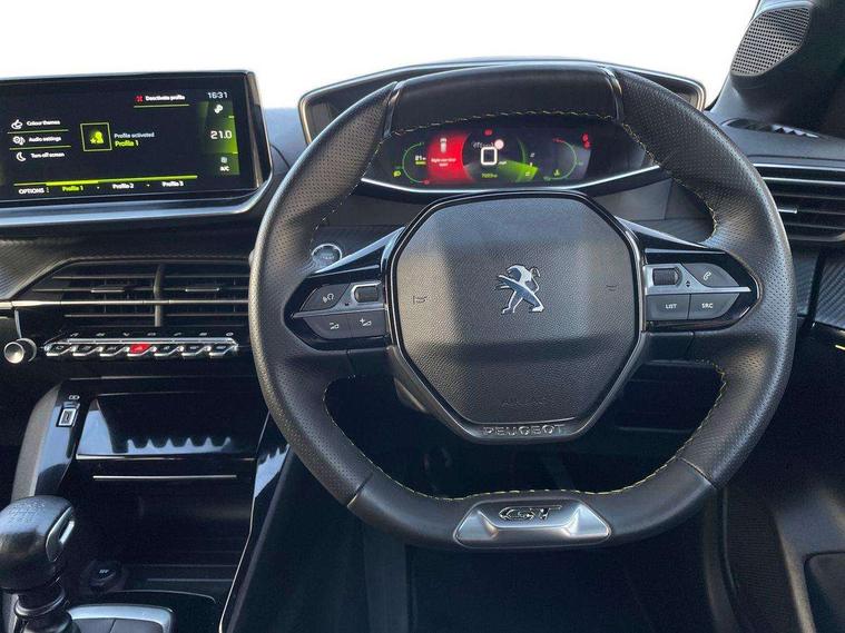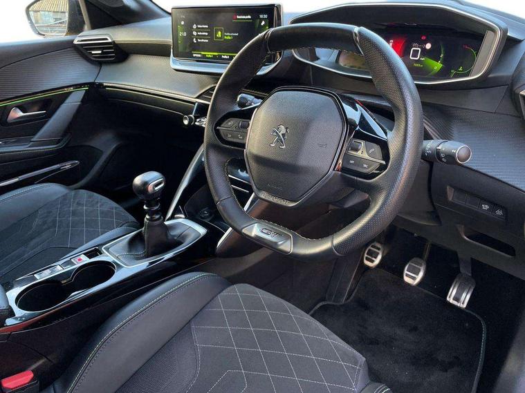 10" Capacitive colour touchscreen with connected 3D navigation, Blind spot monitoring, Bluetooth telephone facility, Driver attention warning, Exterior temperature indicator with ice warning, Lane keep assist, Mirror screen with mirror link, apple carplay and android auto, Multi function trip computer, PEUGEOT i-Cockpit with compact steering wheel, PEUGEOT i-Cockpit with configurable 3D headup instrument panel, PEUGEOT SOS and assistance, Push button start, Smart phone docking station, Speed limit recognition and recommendation, Start/stop system, Visio park assist 180 with colour reversing camera + front and rear parking sensor, 2 front USB socket with USB-C, 2x USB sockets in rear, 6 speakers radio with mp3 compatible, DAB Digital radio, Voice recognition for radio, navigation and telephony features, 2 X Rear number plate lights, Automatic hazard light activation upon heavy brake application, Automatic lights, Automatic windscreen wipers, Body coloured exterior door handles, Dark tinted rear side and tailgate windows, Diamond black rear spoiler (roof), Diamond Black roof, Electric front windows + one touch + anti-pinch, Electric rear windows with one touch/anti-pinch, Electrically adjustable, heated and power folding door mirrors, Follow me home headlights, Frameless electrochrome interior rear view mirror, Full LED headlights with smartbeam assist, Gloss black finish on B pillar, Gloss black rear cluster connecting strip, Gloss black wheel arch extensions, Gloss black window surround, GT model designation badging on C pillar, GT model designation badging on tailgate, Headlights left on audible warning, LED daytime running lights with 3 claw headlight with distinctive tooth design, LED side indicator lights integrated into door mirrors, LED third brake light, Model designation badges front and rear, Nera black door mirror shells, Peugeot scuff plates, Radiator grille - Dark chrome chequered and gloss black edge trim, Rear bumper with gloss black finish, Rear full LED 3D peugeot signature claw effect lights with daylight function, Rear lower bumper diffuser effect trim in gloss black, Rear reversing lights, Rear side wing doors, Rear windscreen wiper triggered automatically in reverse gear, Roof mounted aerial with fin design, Roof spoiler, Single exhaust tailpipe, Tailgate with heated rear windscreen and wiper blade, Variable front intermittent wipers, 1/3 to 2/3 split folding rear seats, 12V socket, 3 seat bench in 2nd row, 8 Colour personalisable ambient lighting, Aluminium pedals and foot rest, Automatic air conditioning, Driver and front passenger seat manual adjustment in longitudinal and back rest angle, Driver and front passenger seat mechanical height adjustment, Driver and front passenger sport seats, Electric power steering with reach and rake adjustable steering column, Front and rear carpet mats in black with lime green stitch detail, Front centre armrest with storage compartment, Front LED interior light with 2 reading spotlights and rear interior light with timer, Gear shift indicator, High centre console with 2 cup holders, ISOFIX child seat mounting points on passenger seat, Lime green contrast stitching to armrest, front centre console, door panels and dashboard facia, Map pockets on the backs of the front seats, Mistral full grain perforated leather steering wheel with aikinite stitch detail and satin chrome 'GT' emblem, Piano keys gloss black plated toggle switches to access main functions of the vehicle, Piano keys gloss black plated toggle switches to access touchscreen functions, Rear centre headrest, Roof lining - Mistral black, Satin chrome gear lever, Seatbelt unfastened on the move audible and visual alert for front and rear seats, Single front passenger seat, Drive assist pack - 208, 3 rear 3 point seatbelts, ABS (Anti-lock Braking System) with EBD (Electronic Brakeforce Distribution) and EBA (Emergency Braking Assistance), Active safety brake with night function/cyclists/pedestrians, Adaptive driver and front passenger airbags with passenger airbag deactivation function, Child locking functionality on rear doors, Driver/front passenger side airbags, Electric parking brake, ESP with Hill Assist, Front and rear curtain airbags, Front and rear disc brakes, Front optimised safety headrests and 3 x rear retractable headrests with height adjustable, Front three point retractable seatbelts with force limiters, Tyre pressure sensor, Acoustic vehicle alert system (AVAS), Automatic door locking when moving off, Deadlock, Electronic code immobiliser, Peugeot Open and Go System, Remote central locking, Thatcham cat. 1 alarm with anti lift sensor, Carbon effect Dashboard, front and rear door panel finish, 17" Bronx two-tone alloy wheels, Space saver spare wheel,
