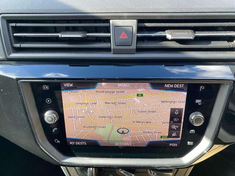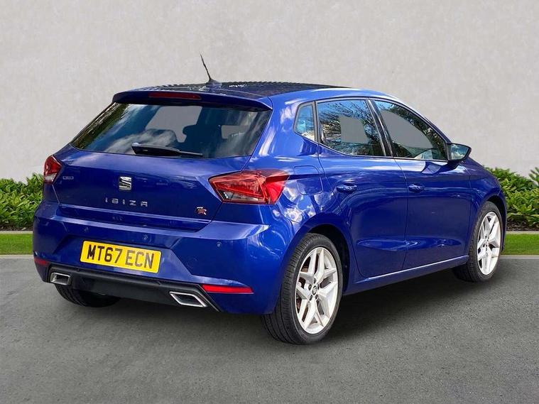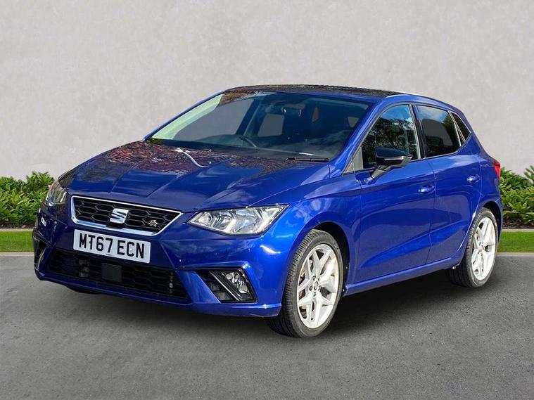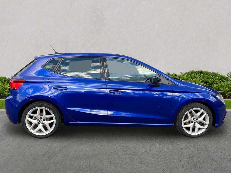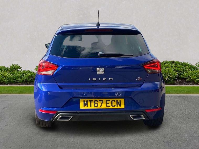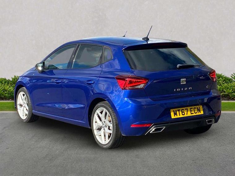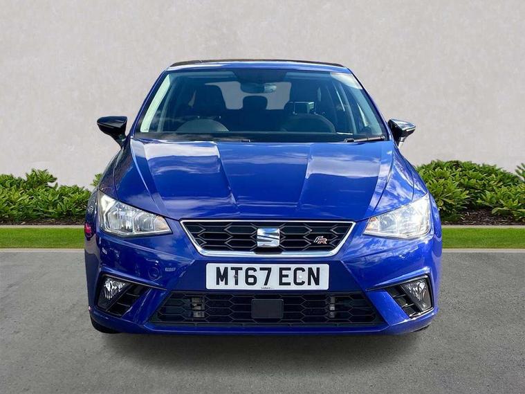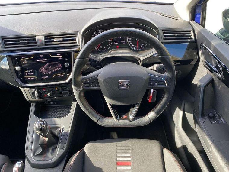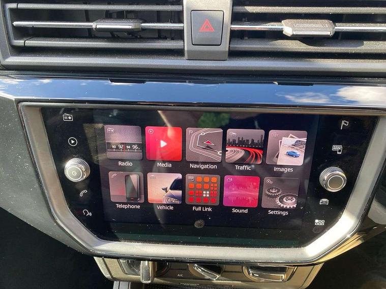 'Lights On' Reminder warning buzzer, Bluetooth Handsfree Phone Connection, Digital clock, Low fuel warning light, Outside temperature gauge, Satellite navigation system with 3D mapping, SEAT Drive profile, SEAT logo boot release, Speed sensitive power steering, Trip computer, Sports suspension, Auxiliary input socket, Digital Audio Broadcast (DAB) Tuner, Radio/MP3 player, SD card slot, Steering wheel mounted controls, USB port, Auto dimming rear view mirror, Automatic headlights, Automatic rain sensing wipers, Body colour bumpers, Body colour door handles, Brilliant black door mirrors, Chrome grille, Coming home headlight function, Cornering front fog lights, Dark tinted rear windows, Electric folding door mirrors, Electric front windows + one touch + anti-pinch, Electric headlight adjustment, Electrically adjustable and heated door mirrors, Exclusive FR front and rear bumpers, LED daytime running lights, LED tail lights, Twin exhaust pipes, 3 rear headrests, 60/40 split folding rear seat, Driver's sunvisor with ticket holder/vanity mirror, Dust/pollen filter, Flat bottom sports leather steering wheel, Front courtesy lights, Front cupholders x 2, Front reading lights, Glovebox, Height adjustable driver's seat, Height adjustable front/rear head restraints, Height adjustable passenger seat, Height/reach adjust steering wheel, Illuminated boot, Instrument lighting with brightness control, Leather handbrake, Leather steering wheel and gear knob, Rear top tether child seat ISOFIX attachment, Sports seats, Full link media system pack with apple Carplay - Ibiza, Media system plus pack with 8.0" colour touchscreen - Ibiza, 3 point seatbelts on all 3 rear seats, ABS, Active front headrests, Child locks on rear doors, Curtain airbags, Driver/Front Passenger airbags, ESP+EBA, Front passenger airbag deactivation, Front side airbags, Hill hold control, Multi-Collision braking, Seatbelt warning, Tiredness recognition system, Tyre pressure monitoring system, 2 folding remote keys with window open/close function, Electronic engine immobiliser, Locking wheel bolts, Remote central locking + deadlocks, Volumetric alarm with back up horn,