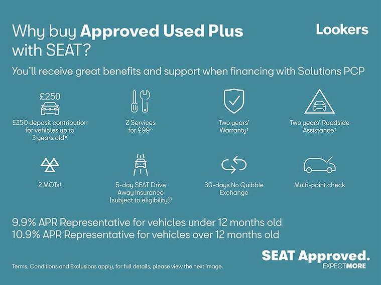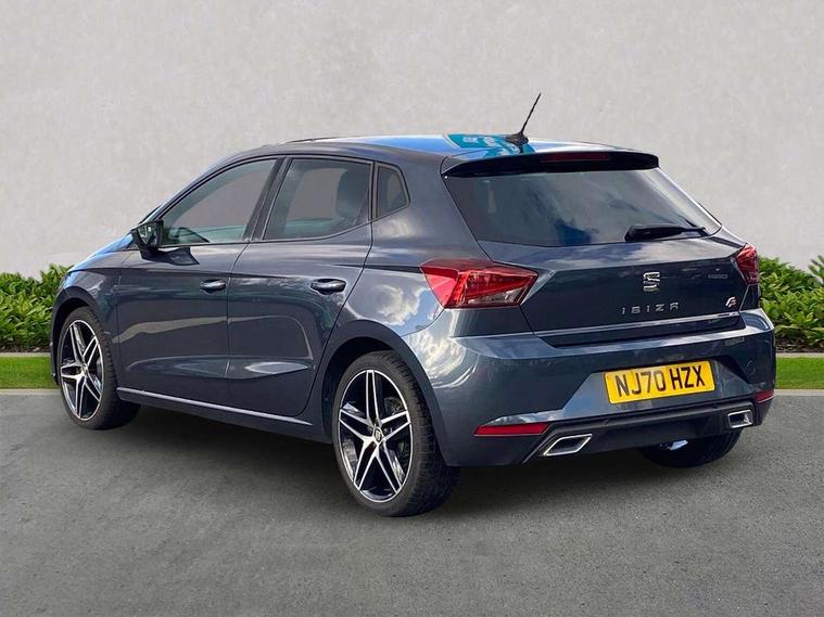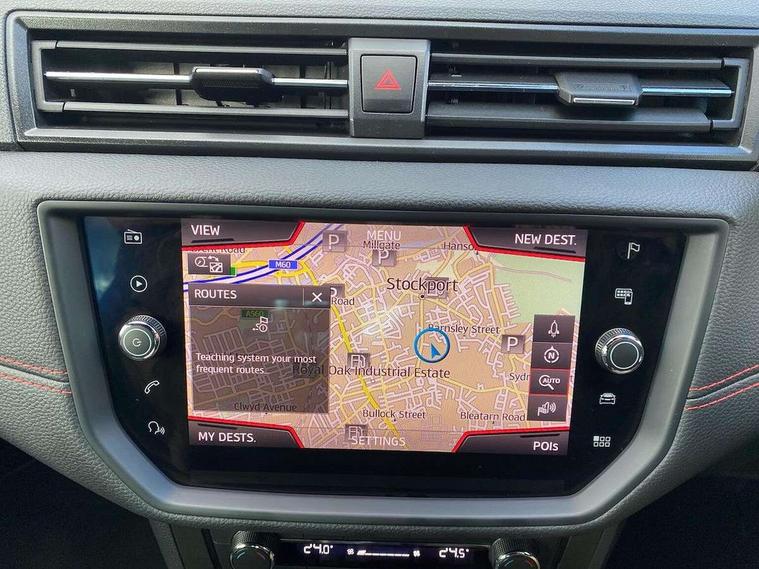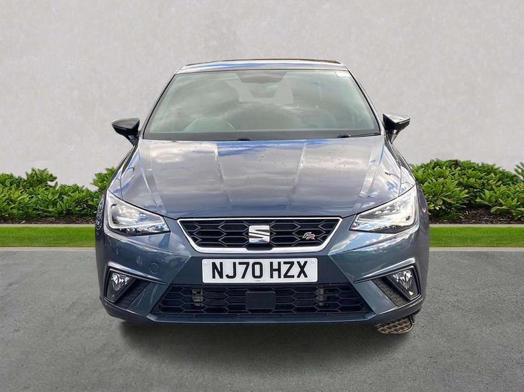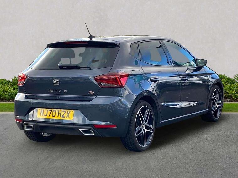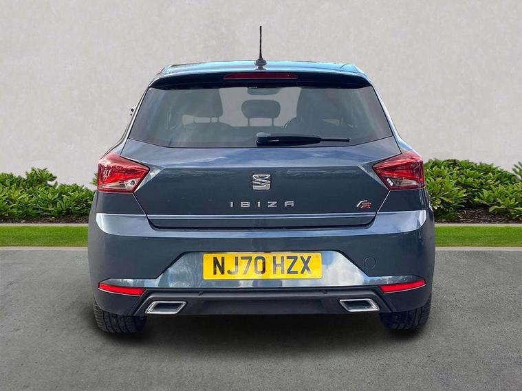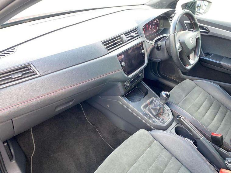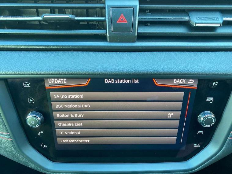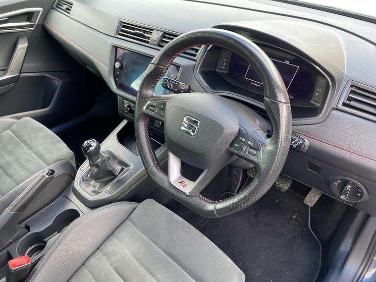 'Lights On' Reminder warning buzzer, Bluetooth Handsfree Phone Connection, Cruise control, Digital clock, Digital cockpit, Full Link Smartphone Integration with Mirror Link, Apple Car Play, Google Android Auto, Low fuel warning light, Outside temperature gauge, Power Steering, Satellite navigation system with 3D mapping, 8" touch screen, voice control and additional USB port, SEAT Drive profile, SEAT logo boot release, Trip computer, Sports suspension, 6 speakers, Auxiliary input socket, CD player, Digital Audio Broadcast (DAB) Tuner, Radio/MP3 player, SD card slot, SEAT USB media cable, Steering wheel mounted controls, USB port, Anti theft roof antenna, Auto dimming rear view mirror, Automatic headlights, Automatic rain sensing wipers, Body colour bumpers, Body colour door handles, Brilliant black door mirrors, Chrome front grille frame, Chrome grille, Coming/leaving home lighting function, Cornering front fog lights, Dark tinted rear windows, Electric folding door mirrors, Electric front windows, Electric headlight adjustment, Electrically adjustable and heated door mirrors, Exclusive FR rear bumper, Full LED headlights, LED daytime running lights, LED tail lights, Rear fog lights, Twin exhaust pipes, 3 rear headrests, 60/40 split folding rear seat, Door and steering wheel ice metal decorative inserts, Driver's sunvisor with ticket holder/vanity mirror, Dual zone climate control, Dust/pollen filter, Flat bottomed perforated leather steering wheel with red stitching and FR logo, Front courtesy lights, Front cupholders x 2, Front reading lights, Gear shift indicator, Glovebox, Height adjustable driver's seat, Height adjustable front/rear head restraints, Height adjustable passenger seat, Height/reach adjust steering wheel, Illuminated boot, Instrument lighting with brightness control, Leather dashboard, Leather handbrake, Microsuede cloth upholstery, Multi-colour ambient interior lighting, Passenger sunvisor, Rear top tether child seat ISOFIX attachment, Sports seats, Full LED headlight pack - Ibiza, 3 point seatbelts on all 3 rear seats, ABS, Active front headrests, Child locks on rear doors, Curtain airbags, Driver/Front Passenger airbags, ESP+EBA, Front assist (AEB), Front passenger airbag deactivation, Front side airbags, Hill hold control, Multi-Collision braking, Seatbelt warning, Tiredness recognition system, Tyre pressure monitoring system, Electronic engine immobiliser, Locking wheel bolts, Remote central locking + deadlocks, Volumetric alarm with back up horn, 18" Performance machined bi-colour alloy wheels,