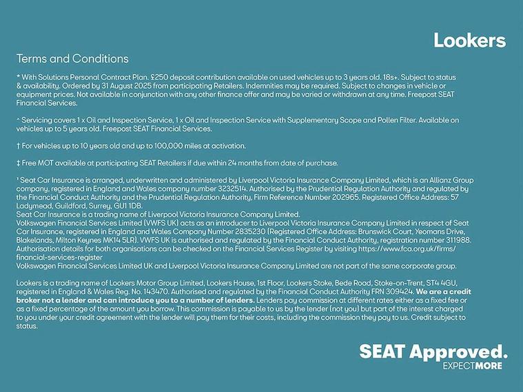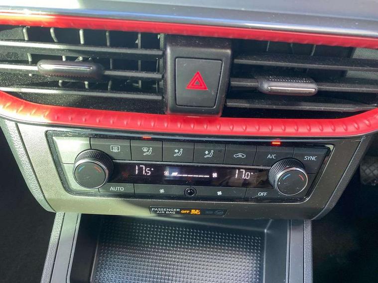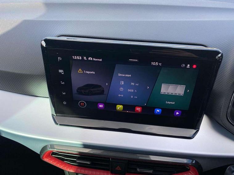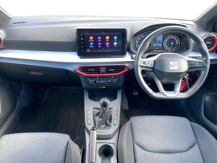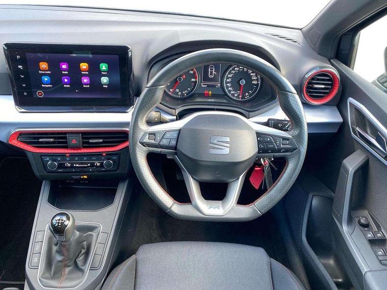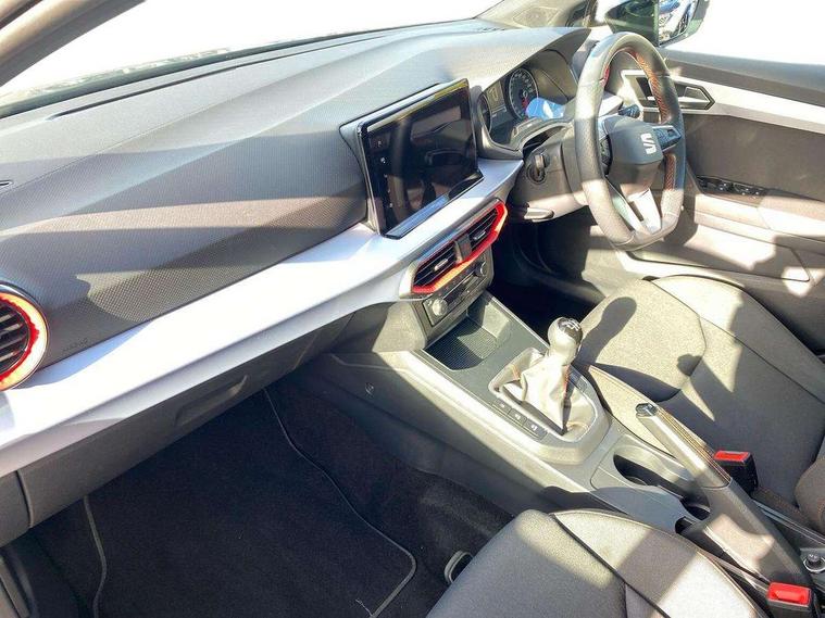 'Lights On' Reminder warning buzzer, 9.2" touchscreen navigation system with type C USB socket, Voice control and DAB/AM/FM radio, Auto start and stop system, Bluetooth audio streaming with handsfree system, Digital clock, Full link smartphone integration with mirror link, wireless apple carplay, Google android auto + USB Type C cable for apple and android devices, Lane assist, Low fuel warning light, Outside temperature gauge, Power Steering, Seat connect with safety, service, remote and online, SEAT drive profiles and ECO function, SEAT logo boot release, Speed limiter, Trip computer, Sports suspension, Auxiliary input socket, Radio/MP3 player, SD card slot, Steering wheel mounted controls, Anti theft roof antenna, Auto dimming rear view mirror, Automatic rain sensing wipers, Black door mirrors, Body colour bumpers, Body colour door handles, Brilliant black window surrounds, Dark tinted rear windows, Electric adjustable/heated/folding door mirrors, Electric front windows, Electric headlight adjustment, Electric rear windows, Front/rear fog lights, FULL LED automatic headlights with dynamic headlight range control, coming and leaving home, LED daytime running lights, LED tail lights, Rear roof spoiler with FR twin exhausts, 60/40 split folding rear seat, Ambient interior lighting, Chrome detailing and black headlining, Cloth upholstery, Dual zone climate control with combination filter, Front courtesy lights, Front cupholders x 2, Front reading lights, Gear shift indicator, Glovebox, Height adjustable front and rear headrests (five), Height adjustable front seats, Height/reach adjust steering wheel, Illuminated air vent surrounds, Illuminated boot, Instrument lighting with brightness control, Isofix, Leather multifunction flat bottomed sports steering wheel, Passenger sunvisor, Sports seats, Sunvisors with mirror and driver side card holder, 3 point seatbelts on all 3 rear seats, ABS, Active front headrests, Child locks on rear doors, Electronic stability control, Energy recovery system, Front assist forward collision warning and autonomous emergency braking, Front driver and passenger side airbags with curtain airbag and front passenger airbag deactivation, Hill hold control, Multi-Collision braking, Seat belt reminder for front and rear seats, Tiredness recognition system, Tyre pressure monitoring system, Electronic engine immobiliser, Locking wheel bolts, Perimeter alarm and interior monitoring with backup horn and tow away protection, Remote central locking + deadlocks, 17" Alloy wheels in Brilliant silver,