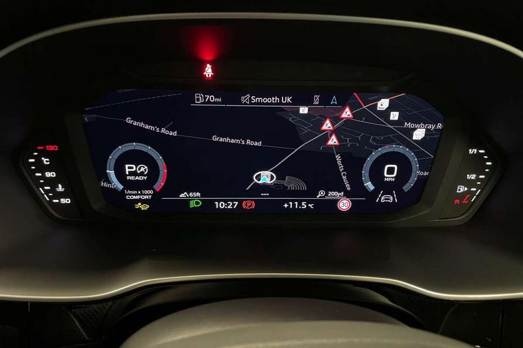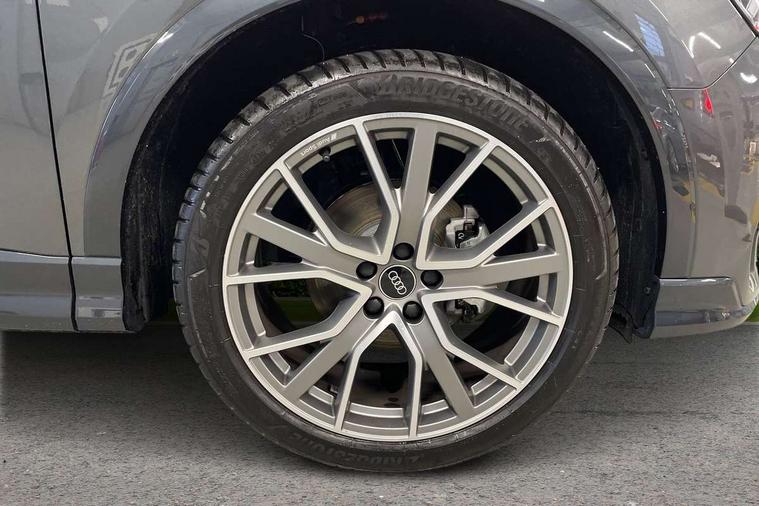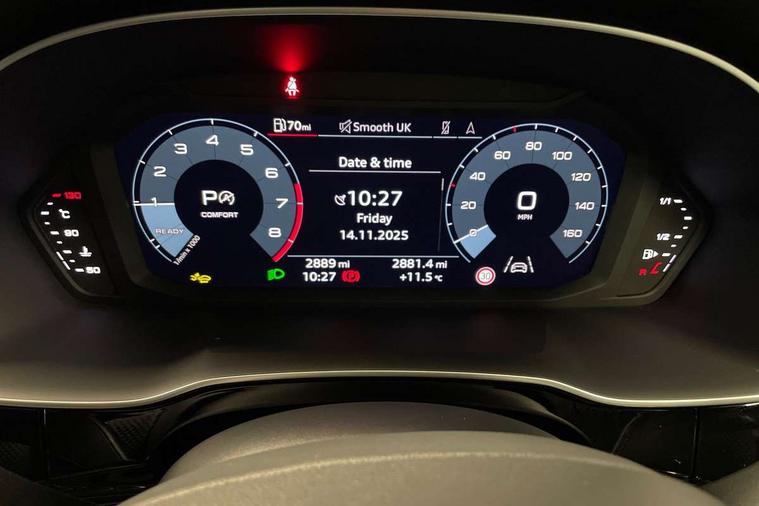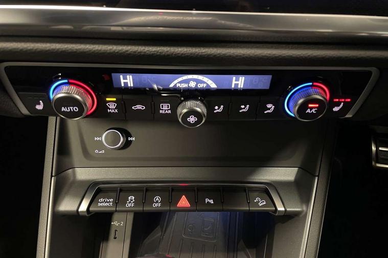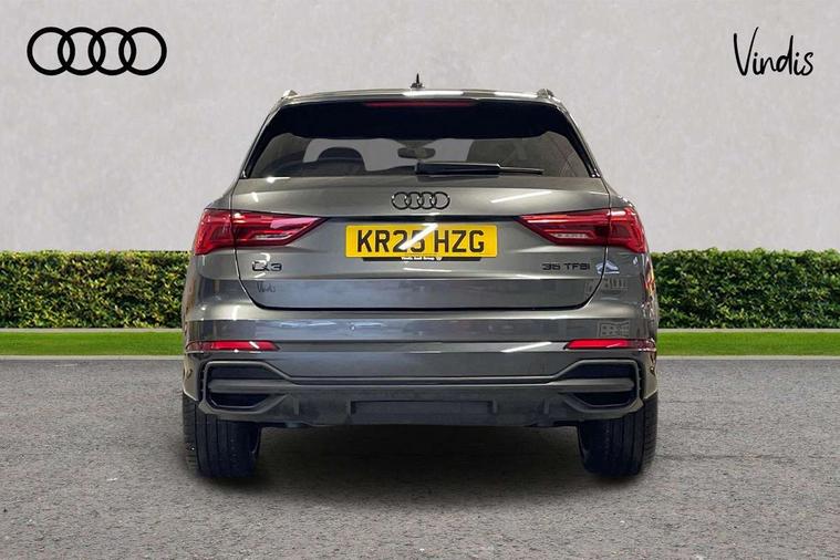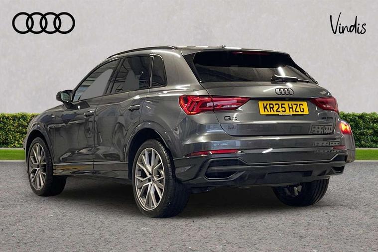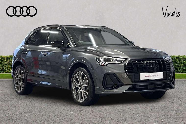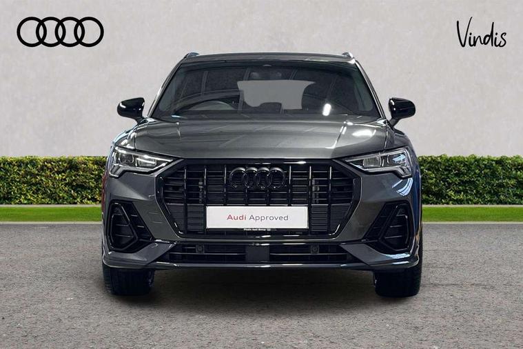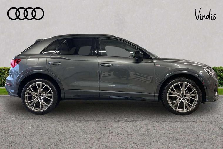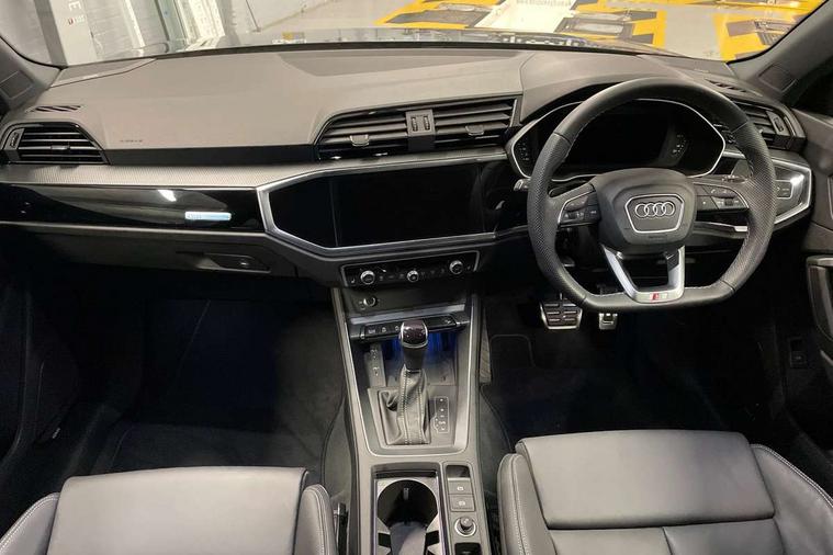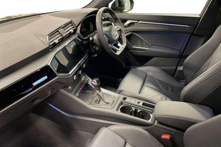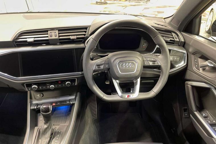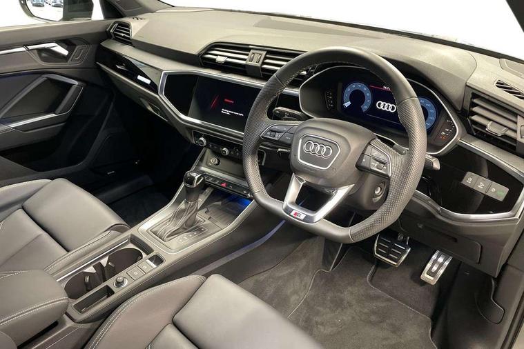 Amazon alexa Integration, Audi connect safety and service, Audi drive select, Audi lane departure warning, Audi smartphone interface includes wireless Apple carplay/Android Auto, Audi Virtual Cockpit - 10.25" display, Bluetooth interface, Camera based traffic sign recognition, Distraction and Fatigue warning, Legal emergency call, MMI Navigation Plus with high resolution 10.1 inch touchscreen colour display, Power operated tailgate, Progressive steering, Service interval indicator, Start stop system with recuperation, Voice control system with natural language interaction, Sports suspension, 2 USB-C ports with charge and data functions, 6 passive loudspeakers, DAB digital radio module, Acoustic windscreen, Audi Beam uses LEDs to project the Audi logo onto the ground as you exit your Q3, Auto dimming door mirrors, Auto dimming frameless rear view mirror, Black roof rails, Electrically folding, adjustable and heated door mirrors with integrated LED side indicators and kerb view function for passenger side, Front and rear electric windows, Front fog lights, Grille vertical bars in aluminium silver/Matt, High gloss black finish B and C pillars, LED Dynamic rear indicators, LED headlights with LED daytime running lights, LED rear lights, LED third brake light, Privacy glass dark tinted rear and rear-side windows (from B-pillar backwards), Rain and light sensors, Rear diffuser grille in grained matt black, Rear diffuser strip in matt anthracite black, Rear side wing doors, Rear wiper, S line bumpers in contrasting Manhattan grey, Variable front intermittent wipers, 12V socket in rear centre console, 3 seat bench in 2nd row, 40:20:40 folding with manual adjustment for 60:40 forwards/backwards position and backrest angle, Adjustable rear seat bench/backrest with centre armrest and cupholder, Black cloth headlining, Dual zone electronic climate control, Electric lumbar support, Front and rear black floor mats with contrast stitching in rock grey, Front and rear headrests, Front centre armrest, Height and reach adjustable steering wheel, Illuminated door sill trims with S logo, ISOFIX child seat mounting for front passenger with airbag deactivation and outer rear seat including top tether attachment point for outer rear seats, Manual front seats with height adjustment, Perforated leather gearknob, Single front passenger seat, Stainless steel luggage compartment sill finisher, Stainless steel pedals, Twin leather upholstery with front sport seats + S embossing, Black styling pack - Q3, Non smoking pack - Q3, 3x3 point rear seatbelts, 6 airbags - Driver, front passenger, curtain and side windows, Audi pre-sense front with pedestrain and cyclist recognition, Electrically operated child locks on rear doors, Electromechanical parking brake, Electronic stabilisation control including ABS, ASR and EDL, Front seatbelt reminder, Hill descent control, Hill hold assist, Pre sense basic, Seatbelt monitoring, Tyre pressure warning, Warning triangle and first aid kit, Anti theft wheel bolts, Immobiliser, Remote central locking, Thatcham approved category 1 anti theft alarm, Aluminium look interior elements, Detail dashboard around MMI touch colour display in glass look, black with surround in aluminium look, Leatherette door armrest, Piano black inlay,