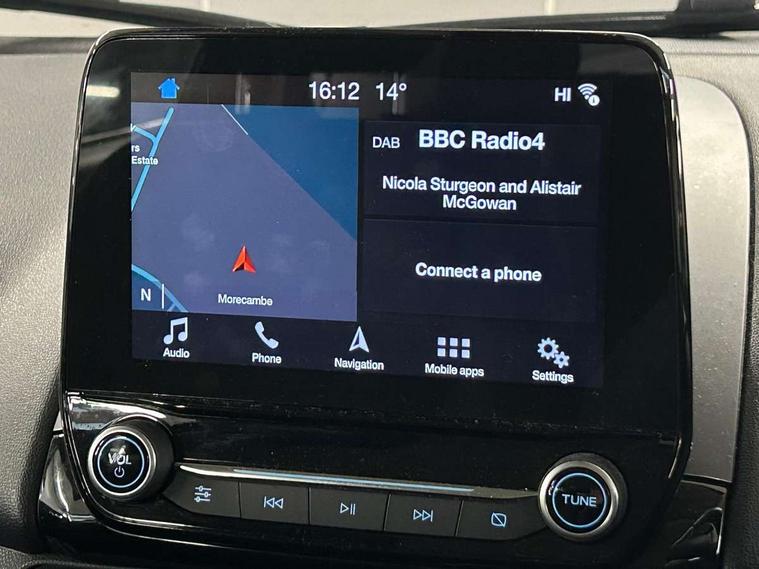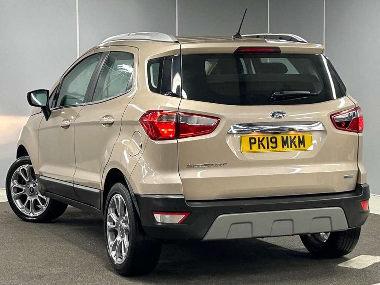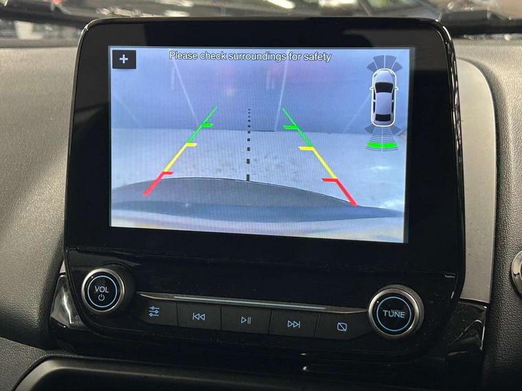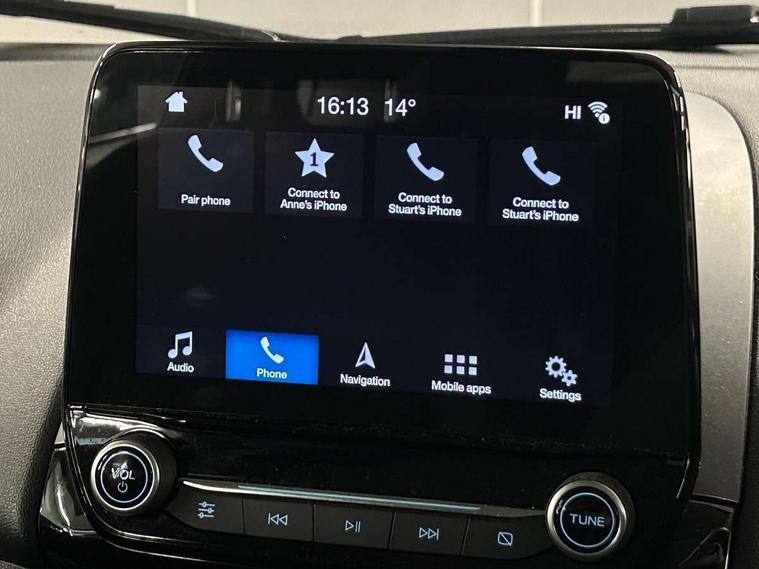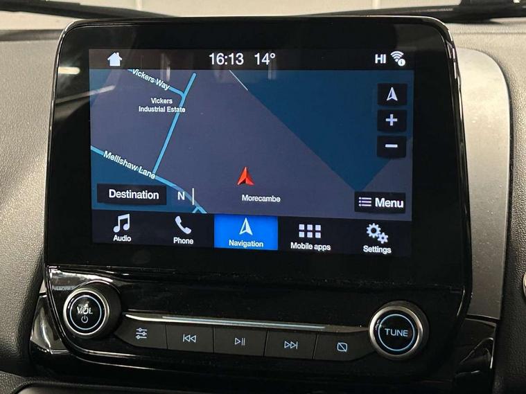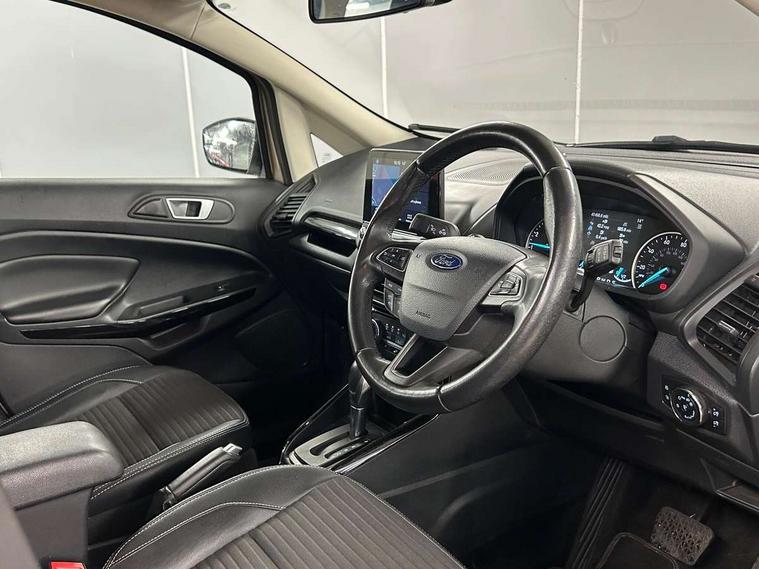 Cruise control, Easy fuel capless refuelling system, PAS, SYNC 3 nav system with DAB radio, 8" screen, voice control, emergency assistance, Apple car play/Android auto, 2x USB, Ford pass connect, Trip computer, 'Quickclear' heated windscreen/heated washer jets, Auto dimming rear view mirror, Automatic headlights, Body colour door handles, Body coloured bumpers, Electrically adjustable and heated door mirrors, Front door threshold plates, Front fog lights, Front grille with chrome trim surround, Headlamps with LED day running lights, Headlight levelling control, Power foldable door mirrors with puddle lights, Power front and rear windows with global opening/closing, Rain sensing front wipers, Rear wiper, 12V socket in front and rear, 60/40 split rear seats, 7 shade adjustable ambient lighting, Centre console with sliding front armrest, Cooled glovebox, Courtesy lights with map reading light, Driver seat height/lumbar adjust, Driver's side glovebox, Driver/passenger sunvisors and lidded vanity mirrors, EATC - Electronic Auto Temperature control, Folding grab handles, Footwell ambient lighting, Front head restraints, Front seat back map pockets, Front/rear floor mats, Groove cloth/leather upholstery, Illuminated glovebox, Illuminated luggage compartment, Isofix system on outer rear seats, Leather gear knob and handbrake grip, Leather steering wheel with audio controls, Luggage compartment carpet, Overhead console with sunglasses holder, Rake adjustable rear seats, Reach + rake adjustable steering column, Rear headrests, Steering wheel with chrome inserts, Storage drawers under front seats, Tie down hooks, Variable boot floor, Rear view camera pack - Ecosport, 3x3 point rear seatbelts, ABS, Child locks on rear doors, Curtain airbags, Driver airbag, Drivers knee airbag, Electronic Stability Programme with hill launch assist, Emergency brake assist, Front passenger airbag deactivation, Front side airbags, Passenger airbag, Seatbelt reminder for driver and front passenger, Traction control, Tyre pressure monitoring system, Immobiliser, MyKey system, Remote central locking, Thatcham 1 volume sensing alarm, Tyre inflation kit,