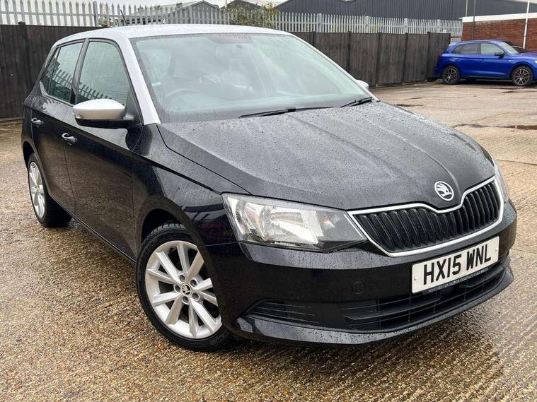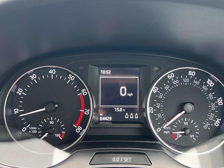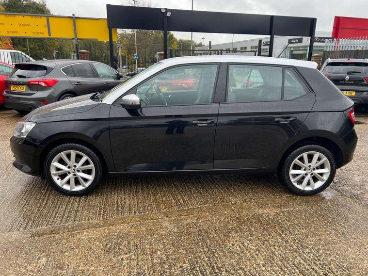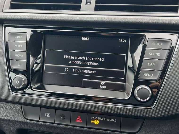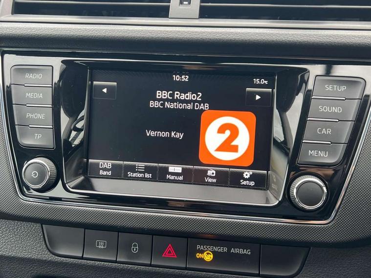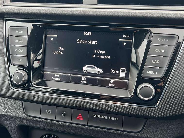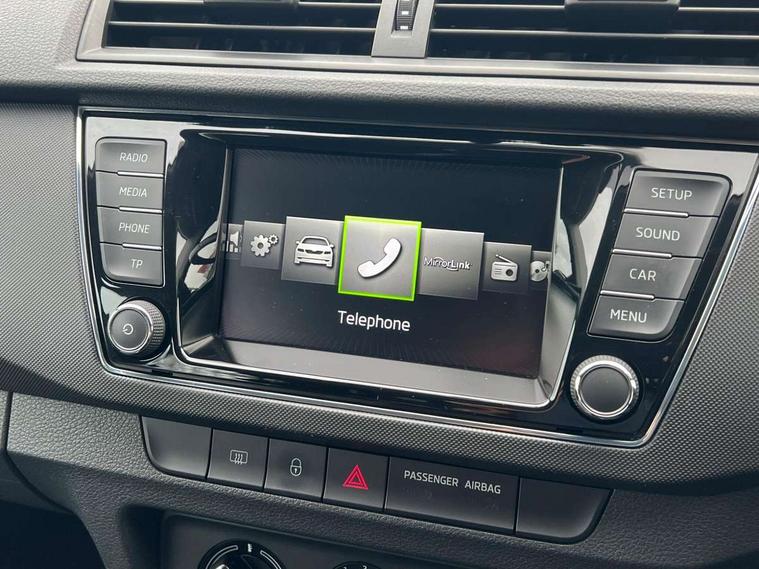 Bluetooth system, Exterior temperature gauge, Front assistant collision mitigation, Maxi dot trip computer, PAS, Service interval indicator, Speed limiter, Auxiliary socket for external MP3 player, Bolero radio with telephone control, Mirror Link, USB and SD card, DAB Digital radio, Body colour bumpers, Body colour door handles, Chrome grille surround, Electric front windows, Electrically adjustable and heated door mirrors, Heated rear window, Height adjustable headlamps, Intermittent rear wash/wipe, Tinted rear windows, Tinted windscreen, 1.5L bottle holder in front door panels, 2 height adjustable rear headrests, 60/40 split folding rear seat, Boot stowage box, Cargo area storage tray, Cloth upholstery, Driver + passenger vanity mirrors, Folding grab handles, Front reading lights, Height adjustable driver's seat, Height adjustable front headrests, Height adjustable passenger seat, Height/reach adjust steering wheel, Interior light with delay, Leather gearshift, Leather handbrake, Lower glovebox cover, Luggage load hooks, Parcel shelf, Pollen filter, Rear courtesy light, Rear storage trays, Storage compartment under front seats, Ticket holder, Two rear outer seat isofix location points, Arkamys surround sound pack - Fabia, Chrome Pack - Fabia, 3x3 point rear seatbelts, ABS, Curtain airbags, Driver and passenger airbags, Driver and passenger side airbags, EDS, ESC with ASR, Front seatbelt pretensioners, Hydraulic Brake Assist (HBA), Passenger airbag deactivate switch, Seatbelt warning, Tyre pressure monitor, Alarm with interior monitoring, Immobiliser, Locking wheel bolts, Remote central locking,