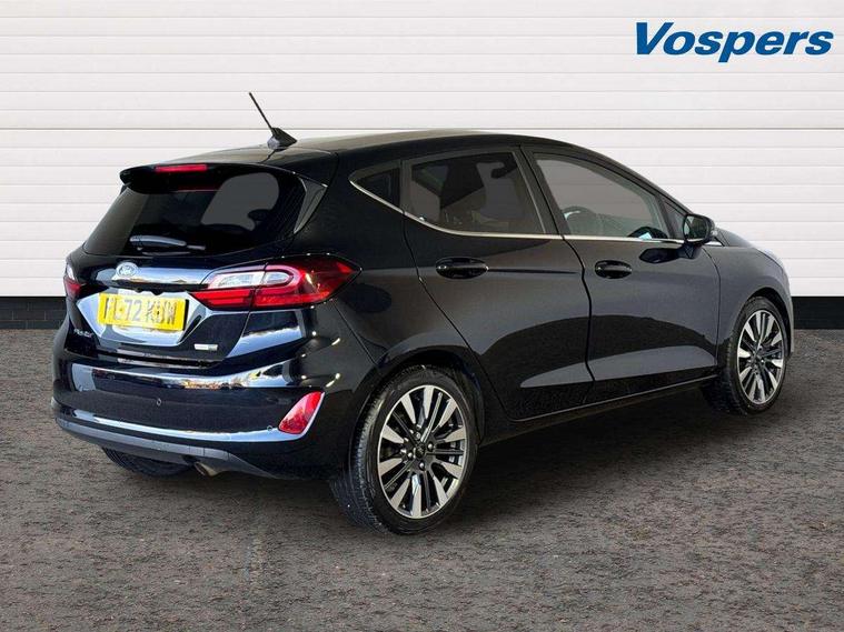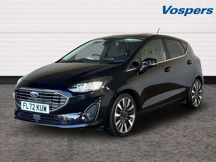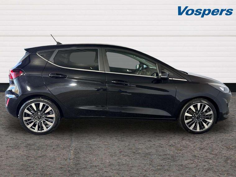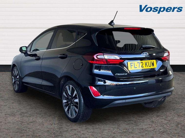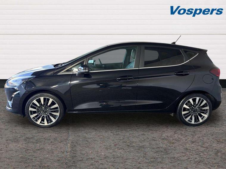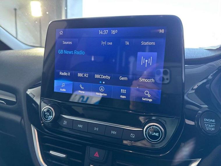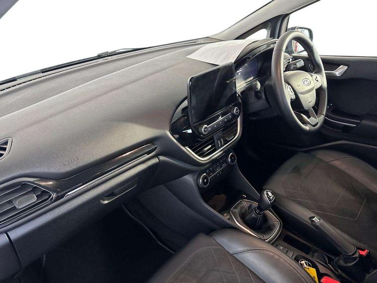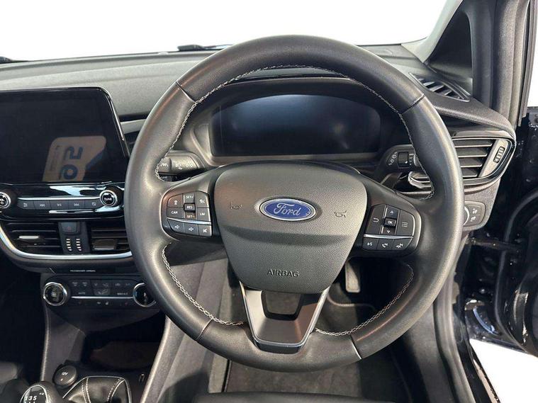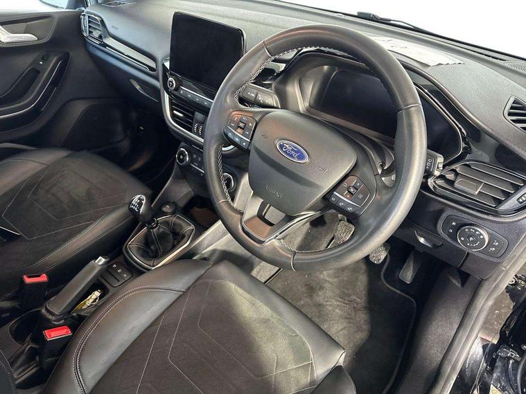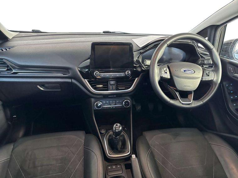 4.2" TFT instrument cluster screen, Bluetooth system, Electric power steering, Ford easy fuel, Rear parking distance sensors, Selectable drive modes (Normal, Sport, Track), Traffic sign recognition, Trip computer, 2 USB ports, Auxiliary input socket, B&O Premium audio system with 8" touchscreen, 10 speakers, 360 degree sound system, Ford SYNC 3 navigation system and Ford pass connect, DAB Digital radio, Steering wheel mounted controls, Auto high beam, Body colour bumpers, Body colour door handles, Body colour rear spoiler, Body coloured electrically operated and heated door mirrors with side indicators, Chrome beltline trim, Chrome front grille, Chrome lower window surround, Cornering front fog lights, Electric front windows/one touch facility, Electric rear windows, LED Night signature to rear lights, Power foldable door mirrors with puddle lights, Quickclear heated windscreen, Rain sensing wipers and auto dimming rear view mirror, Rear privacy glass, Rear wiper, 3 spoke leather trimmed steering wheel with audio control, 60/40 split folding rear seat, Adjustable head restraints, Boot carpet, Centre console with opening armrest, 2x cupholders, 12v and USB, Chrome inner door handles, Drivers and Passenger lumbar support, EATC - Electronic Auto Temperature control, Footwell illumination, Front floor mats in velour, Front map reading lights, Front seat and rear pockets, Height adjustable passenger seat, Illuminated glovebox, Leather gaiter, LED ambient lighting, Load area light, Luxury woven headliner, Manual 4-way driver seat adjust, Overhead console with sunglasses holder, Pollen filter, Rake/reach adjustable steering wheel, Sensico partial premium upholstery, Sensico wrapped steering wheel, NCAP Pack - Fiesta, 3 point seatbelts on all rear seats, ABS+EBA, Curtain airbags, Driver and passenger airbags, Drivers knee airbag, Electronic stability control with hill start assist, Front passenger airbag deactivation, Front side airbags, Seatbelt warning, Two tone horn, Tyre pressure monitoring system, Ford keyfree system with Keyless entry and keyless start, MyKey system, Remote central locking & engine immobiliser, Thatcham Cat.1 alarm, 17" 8 spoke alloy wheels,