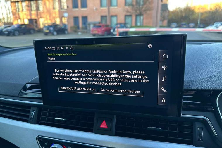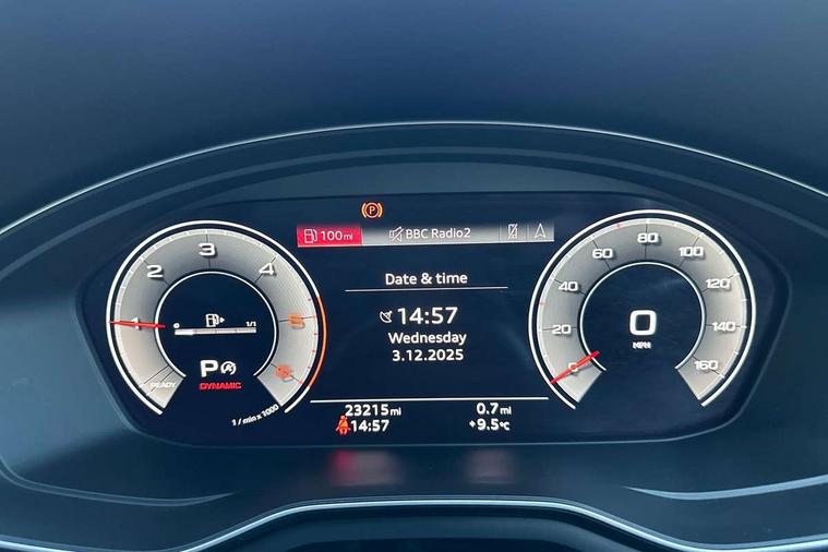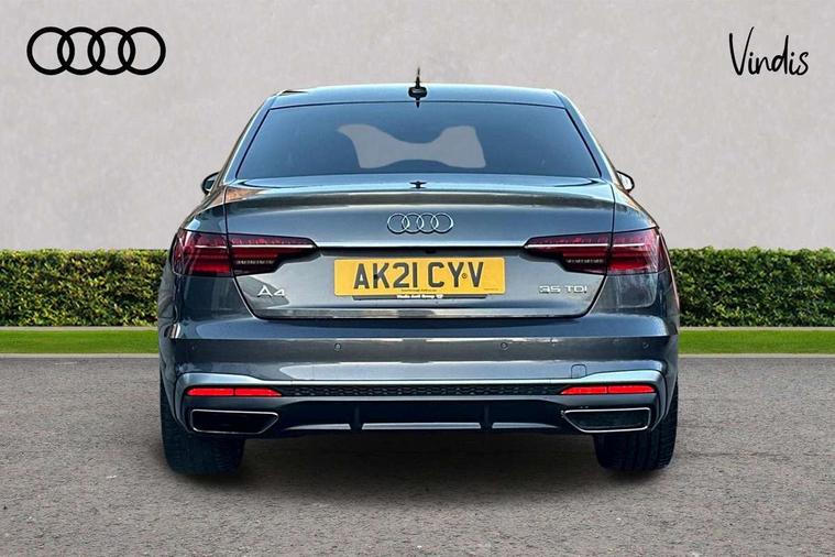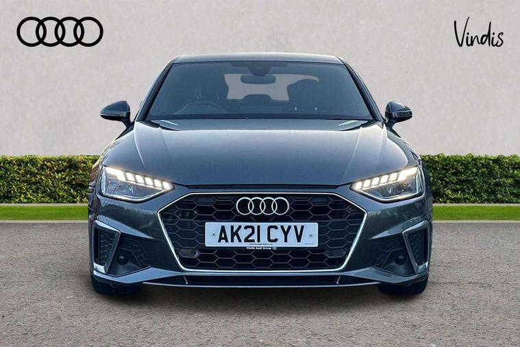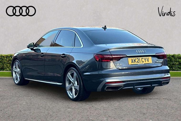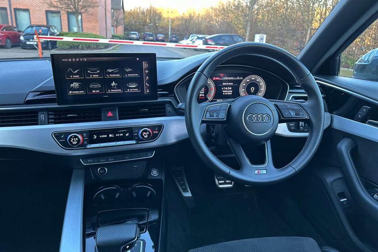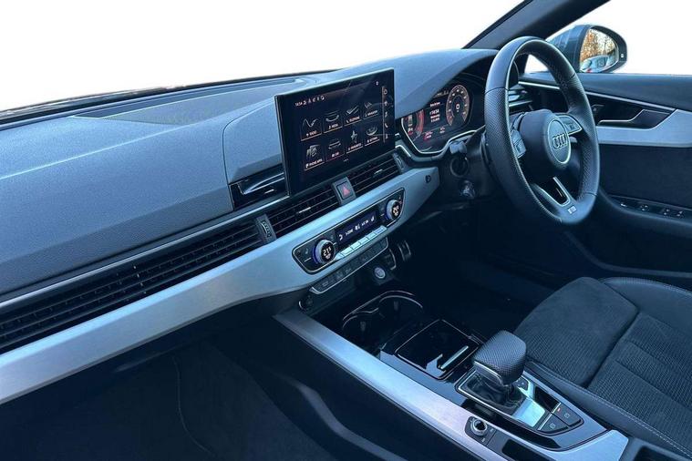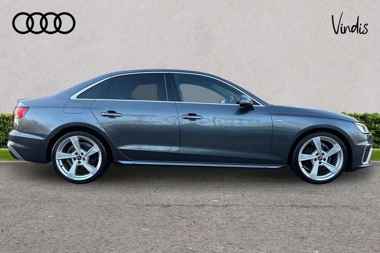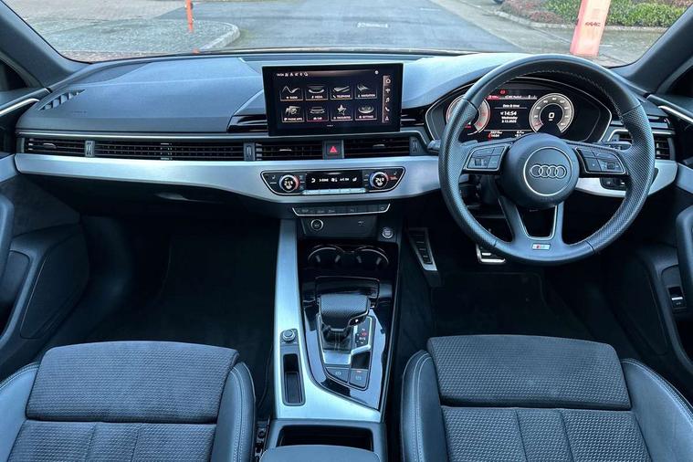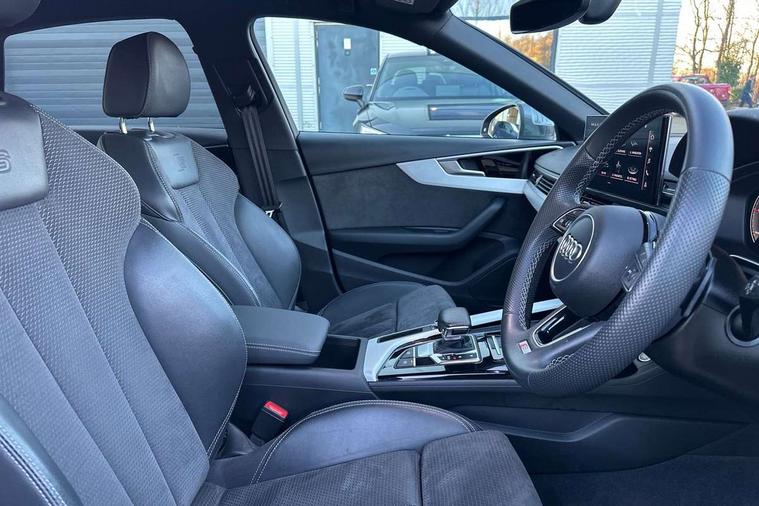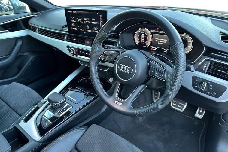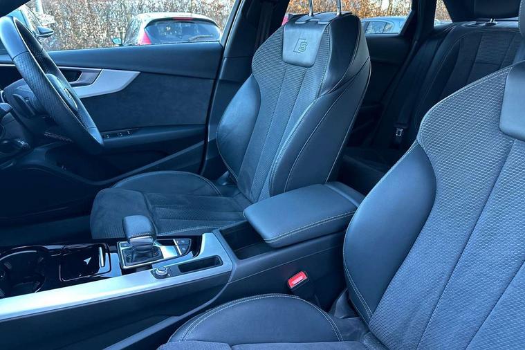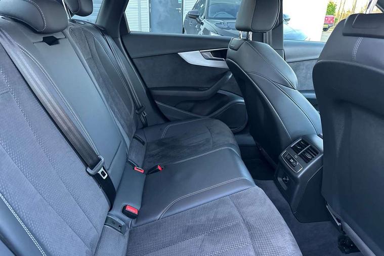 Matt brushed aluminium inlays, High gloss package - A4, LED Interior light pack - A4/S4, 3 rear seatbelts, 6 airbags - Driver, front passenger, curtain and side windows, Electronic Stabilisation Control (ESC) including ABS, ASR and EDL, Hill hold assist, Multi collision brake assist, Pop-up bonnet for pedestrian protection, Pre sense city, Seatbelt monitoring, Warning triangle and first aid kit, Tyre repair kit, Anti theft alarm, Anti theft wheel bolts, Keyless Go, Sports suspension lowered by 23mm, 2 USB charging ports, 8 passive loudspeakers, DAB digital radio reception, Auto dimming rear view mirror, Body colour door handles, Body colour front spoiler lip, Body colour side sill trim, Body coloured door mirrors, Electrically folding auto dimming/adjustable/heated door mirrors with LED side indicators and kerb view function for passenger side, Grained matt black side air inlets with matt aluminium silver inlay, High beam assistant, Honeycomb structure radiator grille in grained matt black, LED headlights with LED rear lights + dynamic rear indicators + headlight adjustment and high beam, turning light + LED daytime running lights, Matt aluminium silver tailpipe trim, Rain and light sensors, S Line badges on the front wings, S line front and rear bumpers with side skirts, S Line rear diffuser in matt titanium black with trim strip in matt aluminium silver, Windscreen with acoustic glazing, 4 way electric lumbar support for driver and front passenger, 40/20/40 split folding 3 rear seat bench in 3 parts with rear centre armrest, Black cloth headlining, Black perforated leather gearknob, Contrast stitching on seats, steering wheel and gear lever gaiter, Deluxe 3 zone electronic climate control, Door sill trims with aluminium inlay, Front and rear head restraints, Front centre armrest, Heated front seats, Illuminated door sill trims with S logo, ISOFIX child seat mounting and top tether, Manual seat adjustment, Stainless steel pedals and foot rest, Tool kit, Audi connect safety and service (e-call), Audi drive select, Audi parking system plus with front and rear sensors, Audi smartphone interface, Audi virtual cockpit, Automatic start-stop system with coasting functionality and efficiency programme, Bluetooth interface, Electric boot lid release, Electromechanical power steering, MMI Navigation plus with MMI touch includes 10.1" high resolution colour MMI display, 3D map, Rear view camera, Voice control system,