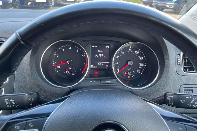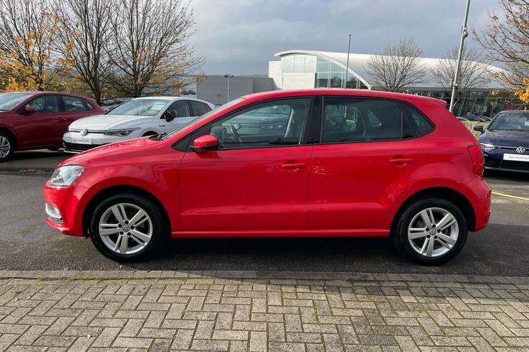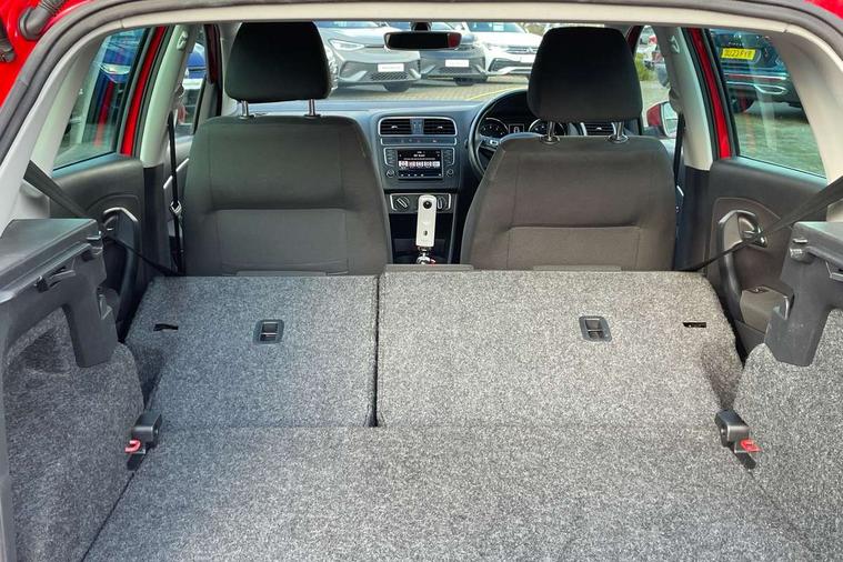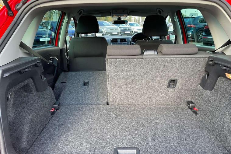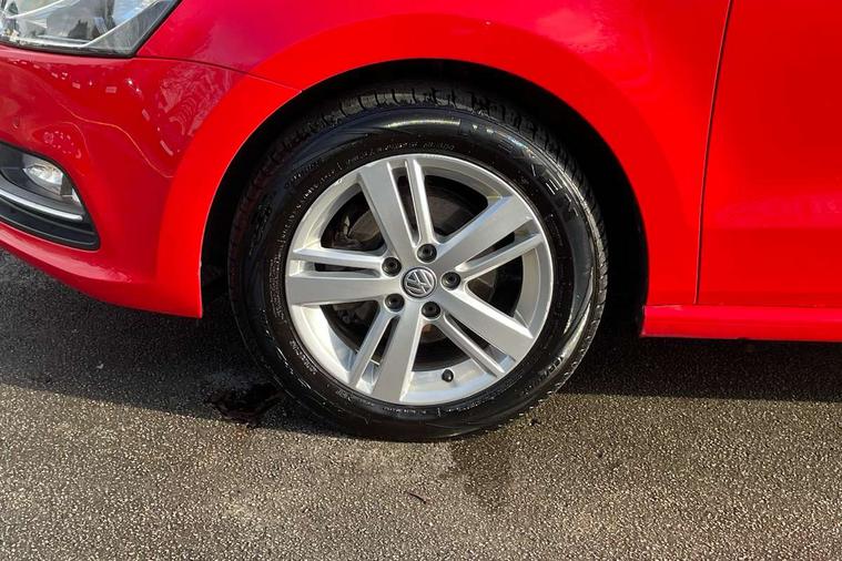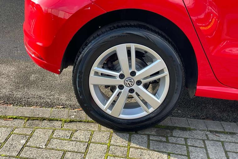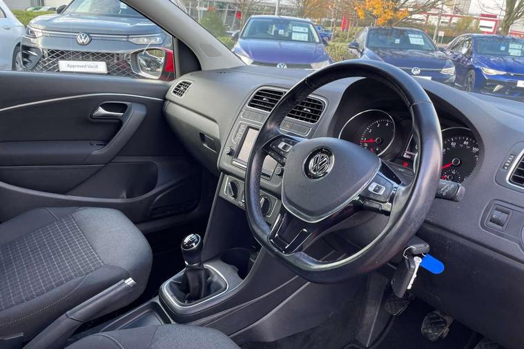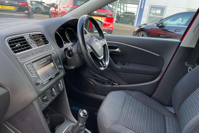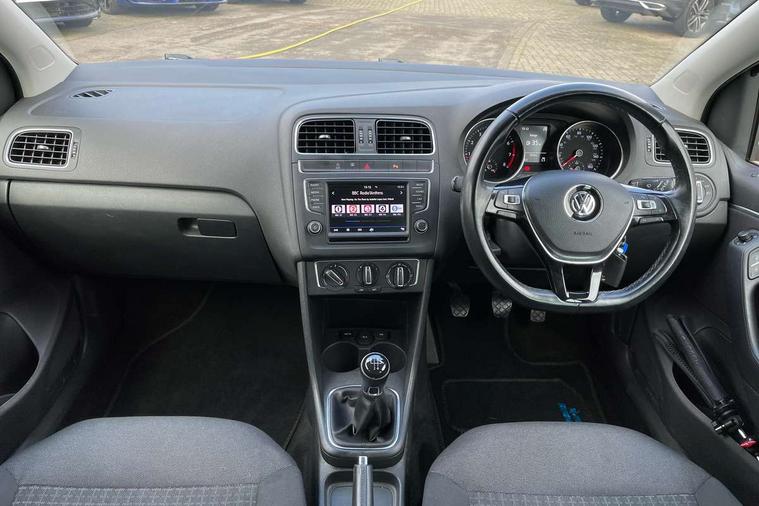 App-Connect, Bluetooth Telephone preparation, Driver alert system, Multi function display, Multifunction computer, PAS - speed related, Service interval indicator, Ultrasonic front and rear optical and audible parking sensors, Warning buzzer and light for front seatbelts unfastened, 6 speakers, Composition media system with radio, glovebox mounted CD, colour touch screen, SD card, aux-in, USB, multimedia interface, DAB Digital radio, Black grille with chrome surround, Body colour bumpers, Body colour door handles, Body colour door mirrors, Body coloured side sills, Chrome trimmed front air intake surrounds, Electric folding door mirrors, Electric front windows, Electric operated/heated door mirrors, Front fog lights with static cornering function, Front wash/wipe with interval delay, Heat insulated tinted glass 65% light absorbing from B pillar back, Heated rear window with auto timer, Rear electric windows, Rear windscreen washer and wiper with interval delay, 12V power socket in centre console, 2 bag hooks in luggage compartment, 2 cupholders, 3 rear head restraints, 3 spoke steering wheel, 4 grab handles, 60/40 split folding rear seat, Centre console storage, Chrome interior door handles, Driver and passenger sunvisors, Driver seat height adjust, Dust/pollen filter, Front door pockets, Front passenger seat height adjust, Front seat backrest storage nets, Front/rear reading lights, Glovebox, Height/reach adjustable steering column, Illuminated vanity mirror, Interior light with delay, Isofix Preparation 2 Rear child seats, Luggage compartment cover, removable, Luggage compartment lighting, Matt chrome gear lever gaiter surround, Multifunction leather steering wheel with leather gear knob/handbrake grip, Storage compartment in front doors, Storage compartment in rear doors, Sunglasses holder, Variable boot floor, Light and sight pack - Polo, 3 point height adj front seatbelts + pretensioners, 3x3 point rear seatbelts, ABS, Automatic post collision braking, Driver/front passenger airbag, Driver/Passenger whiplash optimised head restraints, ESC - Electronic Stability Control + traction control, ESP with EDL + ASR, Hill hold control, Hydraulic Brake Assist (HBA), Tyre pressure monitoring system, Alarm with remote central locking and interior protection, Electronic engine immobiliser, Air vents in Matt chrome, Matt chrome interior trim, 15" steel spare wheel,