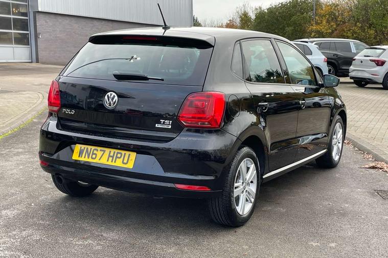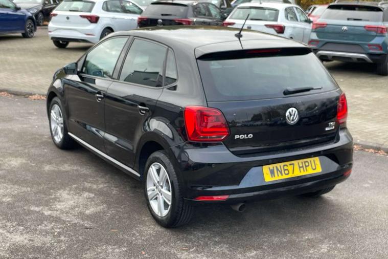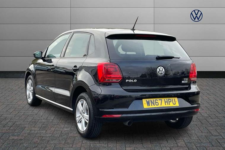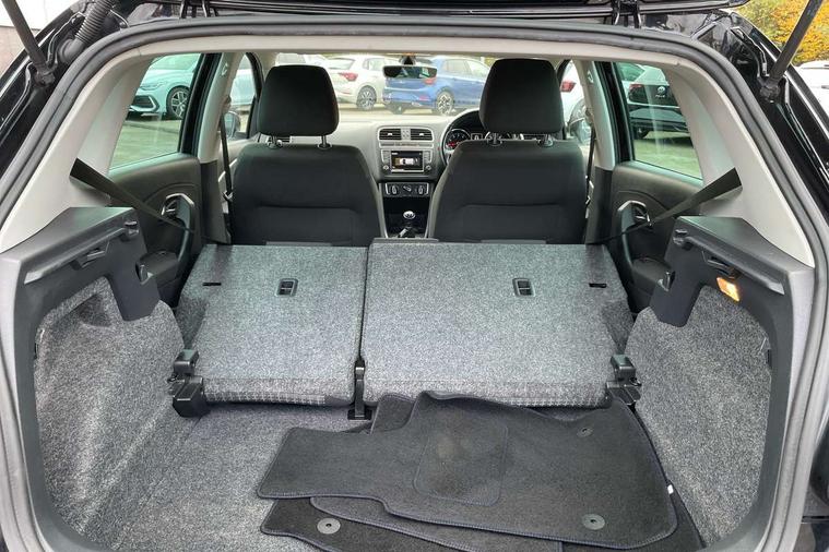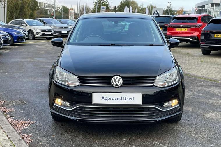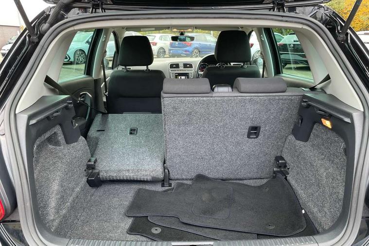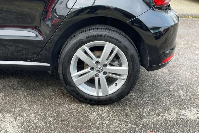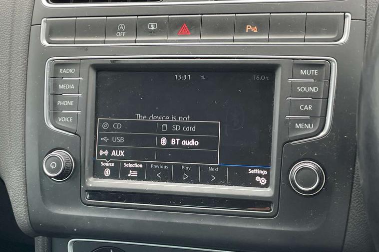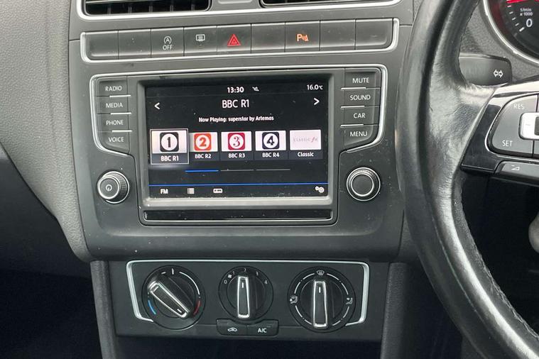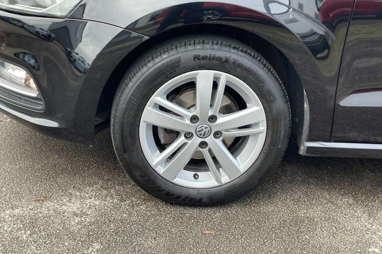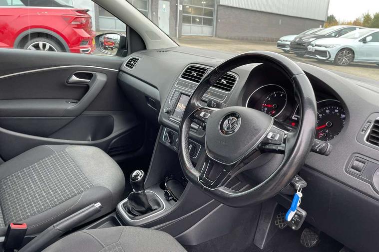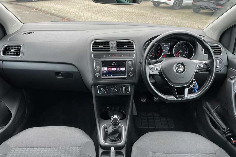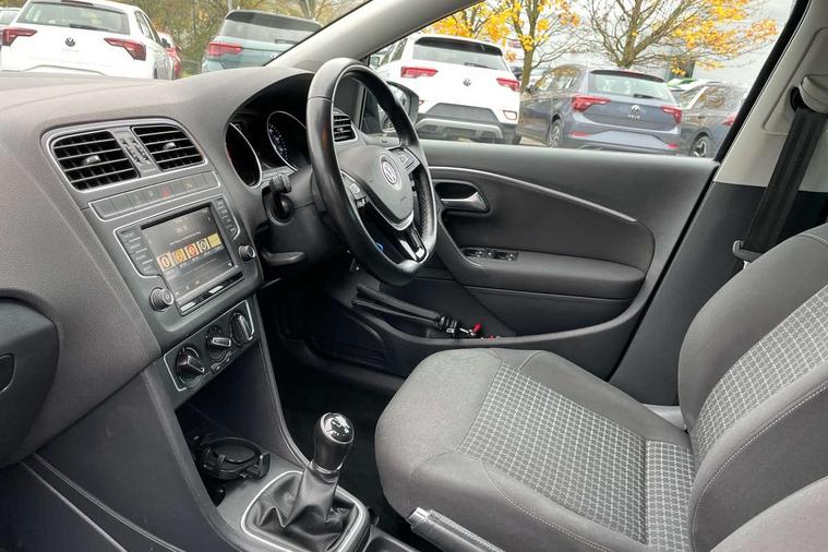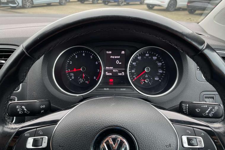 App-Connect, Bluetooth Telephone preparation, Driver alert system, Multi function display, Multifunction computer, PAS - speed related, Service interval indicator, Ultrasonic front and rear optical and audible parking sensors, Warning buzzer and light for front seatbelts unfastened, 6 speakers, Composition media system with radio, glovebox mounted CD, colour touch screen, SD card, aux-in, USB, multimedia interface, DAB Digital radio, Black grille with chrome surround, Body colour bumpers, Body colour door handles, Body colour door mirrors, Body coloured side sills, Chrome trimmed front air intake surrounds, Electric folding door mirrors, Electric front windows, Electric operated/heated door mirrors, Front fog lights with static cornering function, Front wash/wipe with interval delay, Heat insulated tinted glass 65% light absorbing from B pillar back, Heated rear window with auto timer, Rear electric windows, Rear windscreen washer and wiper with interval delay, 12V power socket in centre console, 2 bag hooks in luggage compartment, 2 cupholders, 3 rear head restraints, 3 spoke steering wheel, 4 grab handles, 60/40 split folding rear seat, Centre console storage, Chrome interior door handles, Driver and passenger sunvisors, Driver seat height adjust, Dust/pollen filter, Front door pockets, Front passenger seat height adjust, Front seat backrest storage nets, Front/rear reading lights, Glovebox, Height/reach adjustable steering column, Illuminated vanity mirror, Interior light with delay, Isofix Preparation 2 Rear child seats, Luggage compartment cover, removable, Luggage compartment lighting, Matt chrome gear lever gaiter surround, Multifunction leather steering wheel with leather gear knob/handbrake grip, Storage compartment in front doors, Storage compartment in rear doors, Sunglasses holder, Variable boot floor, Light and sight pack - Polo, 3 point height adj front seatbelts + pretensioners, 3x3 point rear seatbelts, ABS, Automatic post collision braking, Driver/front passenger airbag, Driver/Passenger whiplash optimised head restraints, ESC - Electronic Stability Control + traction control, ESP with EDL + ASR, Hill hold control, Hydraulic Brake Assist (HBA), Tyre pressure monitoring system, Alarm with remote central locking and interior protection, Electronic engine immobiliser, Air vents in Matt chrome, Matt chrome interior trim, 15" steel spare wheel,