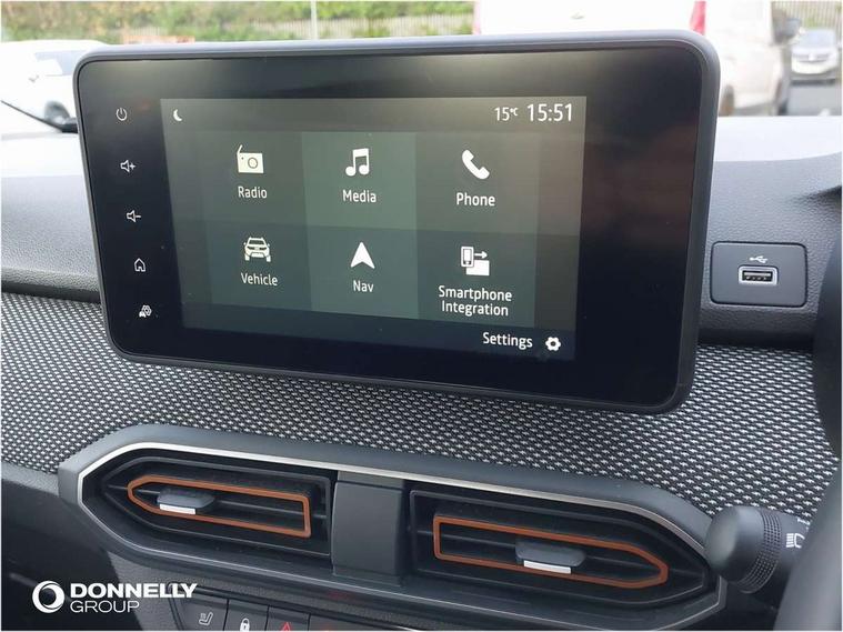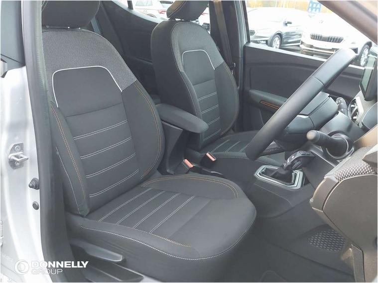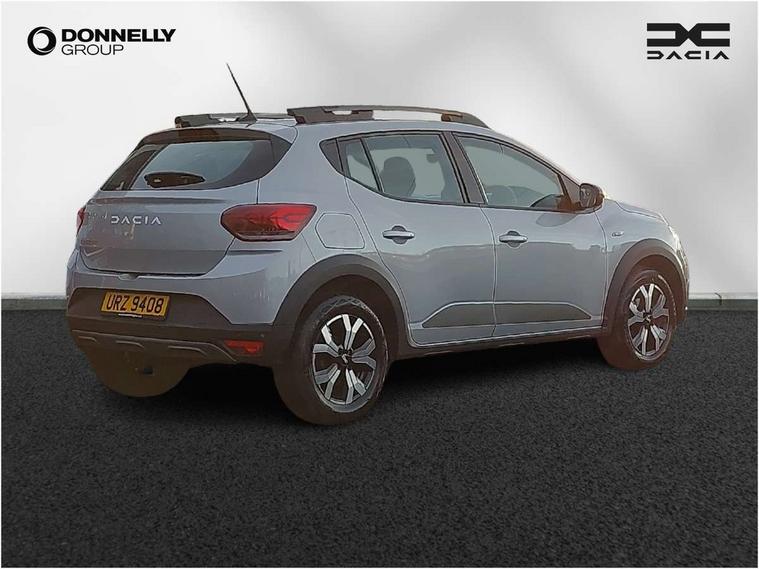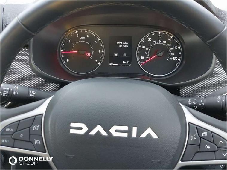 3.5" TFT instrument panel with on-board computer, Blind spot warning, Cruise control with speed limiter, eCall emergency call system, Eco mode, Electric power assisted steering, Front parking sensors, Rear parking sensors, Rev counter, Reversing camera, Stop/start system, 8" MediaNav - DAB Radio, Wifi smartphone replication, Bluetooth, 6 speakres, Apple CarPlay and Android Auto, USB connection for data transfer and charging, USB socket, 3 speed windscreen wipers, Auto lighting, Automatic wipers, Body colour door handles, Body colour door mirrors, Body coloured bumpers, Chrome longitudinal roof bars, Chrome modular roof bars, Chrome radiator grille, Chrome stepway inscription on radiator grille and roof bars, Drivers one touch electric windows, Electrically adjustable and heated door mirrors, Front electric windows, Front fog lights, Heated rear window, High level third brake light, LED automatic daytime running lights, LED Y-shape Dacia signature lighting, Rear electric windows, Rear side wing doors, Rear wash/wipe, Tinted windows, 1/3 to 2/3 split folding rear seats, 12 volt front socket, 12 volt rear socket, 3 height adjustable rear headrests, 3 seat rear bench, Automatic air conditioning, Driver and passenger vanity mirror with cover, Fabric upholstery, Fixed smartphone holder on dashboard, Height adjustable drivers seat with armrest, Height adjustable front headrests, Height/depth adjustable steering wheel, High central armrest with console storage, Isofix points for child seats in both outer rear seats, Satin chrome interior door handles, Satin Chrome/Copper orange air vents, Single front passenger seat, Soft feel steering wheel, Steering wheel controls, 3x3 point rear seatbelts, ABS and Emergency brake assist, Automatic emergency braking system, Child locks on rear doors, Door open visual and audible warning, Driver airbag, Electronic parking brake, ESC (Electronic Stability Control), ESP + Hill Start Assist, Front curtain airbags, Front seatbelt pretensioners, Front side airbags, Height adjustable front seatbelts, Passenger airbag, Seatbelt reminder for driver and front passenger, Tyre pressure monitor, Automatic central locking, Immobiliser, Keyless entry, Remote central locking, Decopart on instrument panel and door with textile, 16" Diamond-effect alloy wheels,