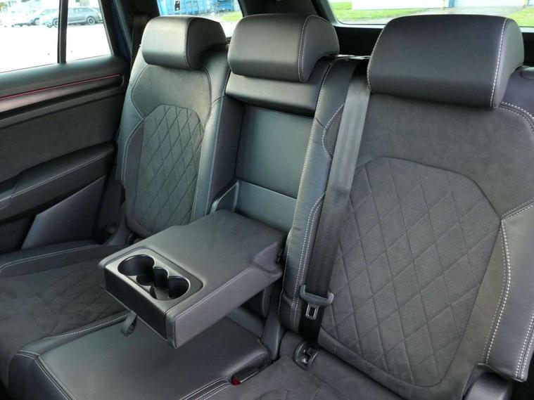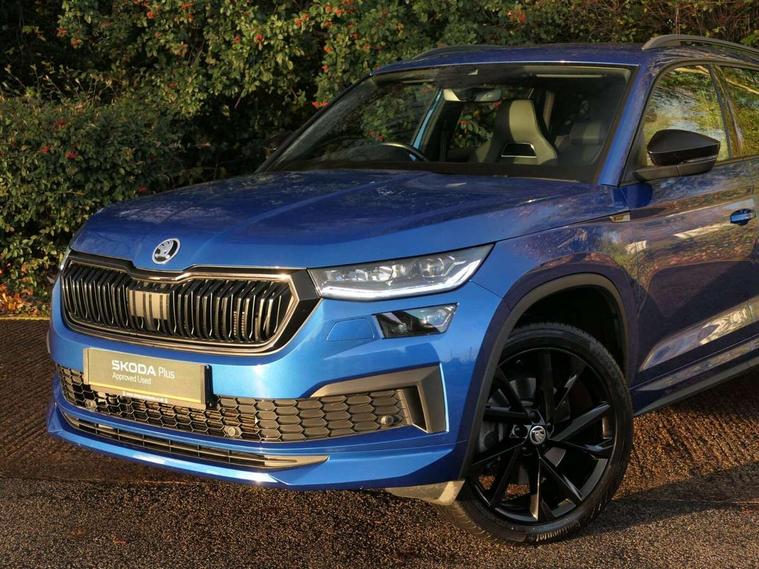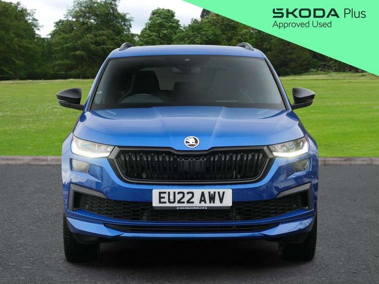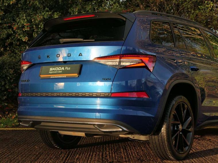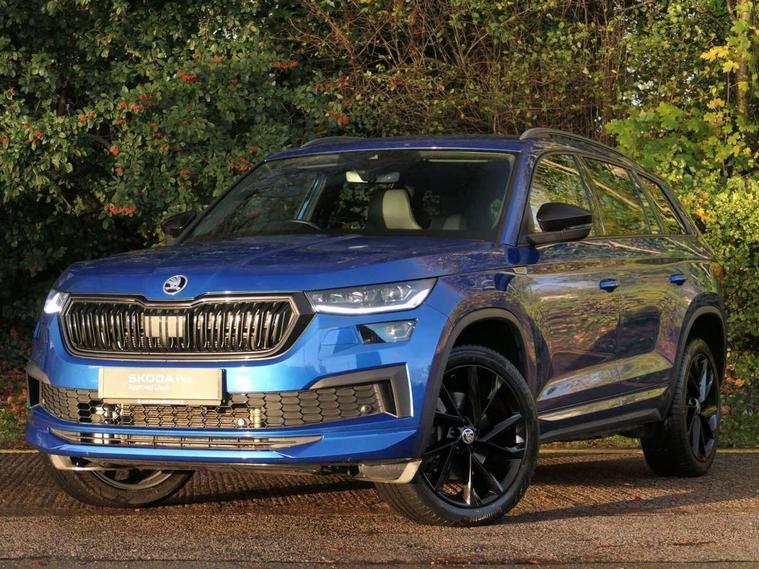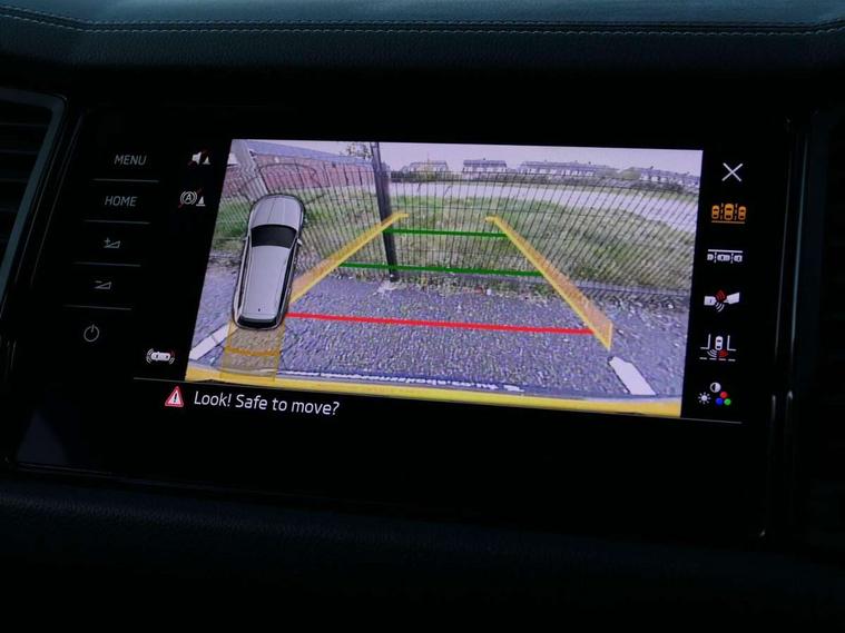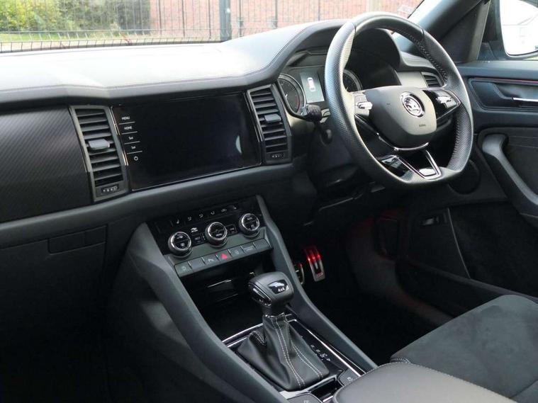 Black air vent surround, Carbon finish dashboard and door inserts, Grey stitching in dashboard, LED Interior light pack - Kodiaq, 20" Vega Anthracite alloy wheels, Temporary spare wheel (space saver), Alarm with interior monitoring and tilt sensor with safe function, Anti-theft wheel bolts, Immobiliser, Keyless entry and start system (KESSY), Remote central locking with 2 keys, 8 speakers, DAB Digital radio, Auto door release and activation of warning lights, Child locks on rear doors, Driver and front passenger airbag with knee airbag and front passenger airbag deactivation, Electronic parking brake with hill start assist, Emergency rear braking signal, ESC (incl. ABS+MSR+ASR+EDS+HBA+DSR+RBS+MKB), Front assist with autonomous emergency braking, Front side airbags with curtain airbags, Fuel cut off safety device, Height adjustable front 3 point seatbelts + pretensioners, Hill hold control, Rear disc brakes, Safety vest holder in door, Seat belt reminder for all seats, Tailgate unlocking from outside, Three point rear seat belts, Two tone horn, Tyre pressure monitor, Aero front windscreen wipers with intermittent function, Aero rear window wiper, Auto dimming rear view mirror, Black roof rails, Black sports styling including front grille and window surrounds, Black wheel arch surrounds, Body colour bumpers, Body colour door handles, Electric adjustable/heated/folding door mirrors, driver side auto dimming with boarding sports and memory function, Electric front and rear windows, Extended rear spoiler with finlets in gloss black, Front fog lights, Full LED matrix headlights with AFS (adaptive front light system), cornering function and AWL (all weather lighting system), Gloss black door mirrors, Headlight washers, Heated rear window, Invisible tailpipe, LED daytime running lights, LED rear fog light, LED third brake light in rear spoiler, Light assistant (coming/leaving home/tunnel light), Off-road style lower front bumper element, Privacy glass, Rain and light sensors, Rear diffuser, Rear LED lights (high functionality) with welcome effect and dynamic indicators, Rear side wing doors, Safety reflectors on front and rear doors, Sportline badge on front fender, Sports front and rear bumpers including lower rear chrome strip, Tailgate lettering in Black, Window control switches with black trim, Without engine designation, 12V socket in boot, 2 rails with 2 hooks, 2 seat bench in 3rd row, 3 seat bench in 2nd row, 4 foldable roof handles with rear coat hooks, 60:40 foldable rear seat with sliding adjustment and backrest angle adjustment, Aluminium pedals, Black roof headlining, Bottle holders in door panel in the 1.5 litre front and 1 litre rear, Cargo storage compartments, Chrome headlight control button, Chrome interior door handles, Coat hooks on B pillar, Covered storage compartment on driver side, Decorative door sills in the front and rear, Front centre armrest with storage compartment, cup holder and 12V socket, Front courtesy lights, Gear shift lever with chrome frame and black gloss insert, Grey stitching in front and rear armrests and door armrests + door inserts, Height adjustable front headrests, Illuminated and cooled glovebox, Illuminated luggage compartment, Isofix child seat fittings in outer rear seats with top tether, Manually adjustable steering column, Microsuede door panels, Net programme in boot (1x horizontal Net, 2x vertical Nets), Overhead glasses storage compartment, Pollen filter, Rear centre armrest with cupholders, Single front passenger seat, Sliding trunk cover, Small Bags on the inner sides of the front backrests, Sports seats, Sunvisors with illuminated vanity mirrors, Three rear height adjustable headrests, Ticket holder on A Pillar, Umbrella in door panel, Variable boot floor, Bluetooth system, Columbus satellite navigation with 9.2" touchscreen, integrated Wi-Fi, web radio, E-call, ECO Stop/start function, Exterior temperature indicator, Progressive steering, Rear view camera, Smartlink wireless for apple carplay and wired for android auto, Speed limiter, USB C Port x 2 in front centre console, Wireless charging,