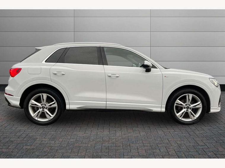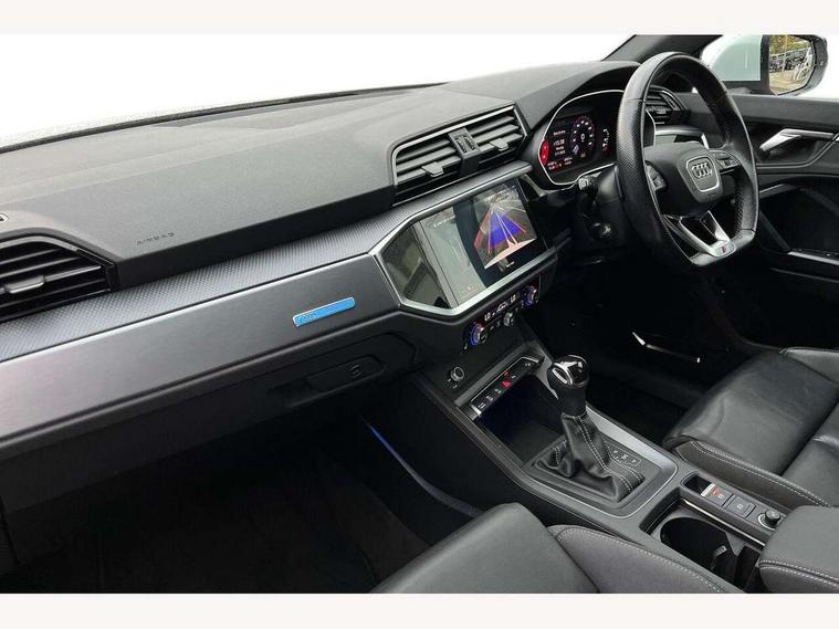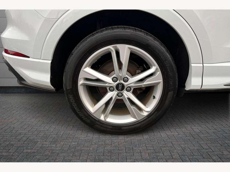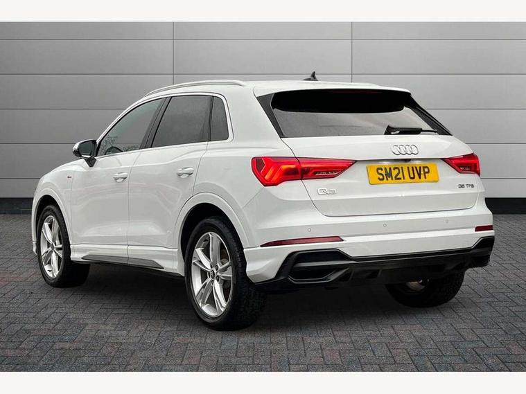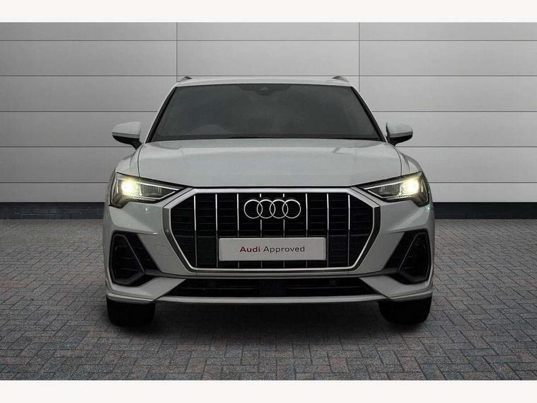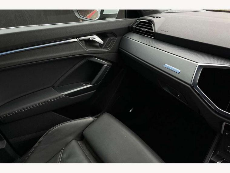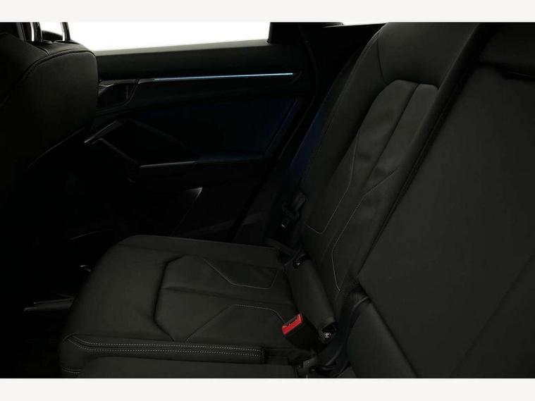Audi connect safety and service (e-call), Audi drive select, Audi lane departure warning, Audi smartphone interface includes wireless Apple carplay/Android Auto, Audi Virtual Cockpit - 10.25" display, Bluetooth interface, Camera based traffic sign recognition, MMI Navigation Plus with high resolution 10.1 inch touchscreen colour display, Power operated tailgate, Progressive steering, Reversing camera, Service interval indicator, Start stop system with recuperation, Voice control system with natural language interaction, 48V Mild hybrid technology, Sports suspension, 2 USB-C ports with charge and data functions, Bang + Olufsen 3D sound system, DAB digital radio module, Acoustic windscreen, Aluminium roof rails, Aluminium window trim, Auto dimming frameless rear view mirror, Body coloured bumpers, Electrically folding, adjustable and heated door mirrors with integrated LED side indicators and kerb view function for passenger side, Front and rear electric windows, Front fog lights, Front side air inlets in matt platinum grey, Front spoiler blade in matt platinum grey, Grille vertical bars in aluminium silver/Matt, High gloss black finish B and C pillars, LED headlights with LED daytime running lights and dynamic rear indicator, LED rear lights, Privacy glass dark tinted rear and rear-side windows (from B-pillar backwards), Rain and light sensors, Rear diffuser strip in matt titanium black, S line badges on front wings, S Line front and rear bumpers, Side skirt insert in matt Platinium grey, Silver chrome grille surround, Titanium black radiator grille, 12V socket in rear centre console, 40:20:40 folding with manual adjustment for 60:40 forwards/backwards position and backrest angle, Adjustable rear seat bench/backrest with centre armrest and cupholder, Black cloth headlining, Dual zone electronic climate control, Front and rear black floor mats with contrast stitching in rock grey, Front and rear headrests, Front and rear roof module including reading lights, Front centre armrest, Glove compartment lighting, Heated front seats, Height and reach adjustable steering wheel, Illuminated door sill trims with S logo, ISOFIX child seat mounting for front passenger with airbag deactivation and outer rear seat including top tether attachment point for outer rear seats, Luggage compartment light, Manual front seats with height adjustment, Perforated leather gearknob, Stainless steel luggage compartment sill finisher, Stainless steel pedals, Tool kit, Non smoking pack - Q3, 3x3 point rear seatbelts, 6 airbags - Driver, front passenger, curtain and side windows, Electrically operated child locks on rear doors, Electromechanical parking brake, Electronic stabilisation control including ABS, ASR and EDL, Hill descent control, Hill hold assist, Pre sense basic, Seatbelt monitoring, Tyre pressure warning, Warning triangle and first aid kit, Anti theft alarm, Anti theft wheel bolts, Audi pre-sense front with pedestrain and cyclist recognition, Remote central locking, Dark matt brushed aluminium inlay, Leatherette door armrest, MMI touch colour display in glass look, black with surround in aluminium look, Tyre repair kit,