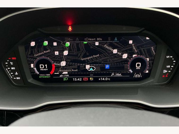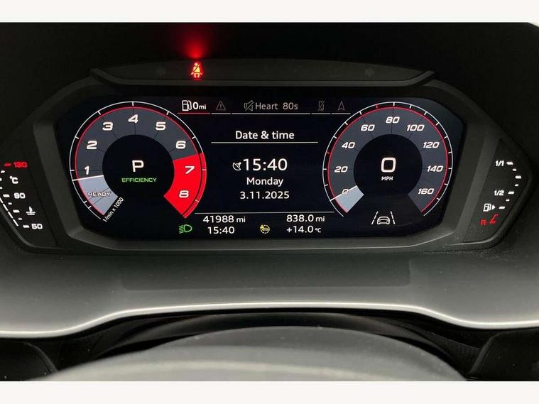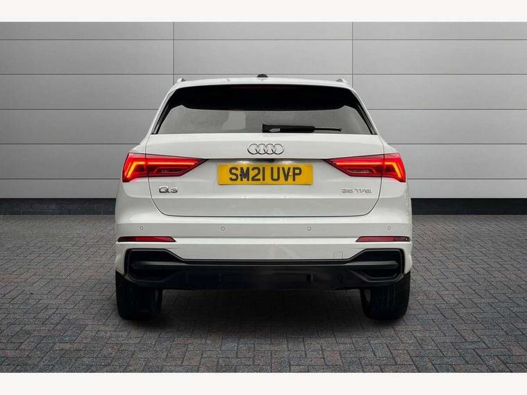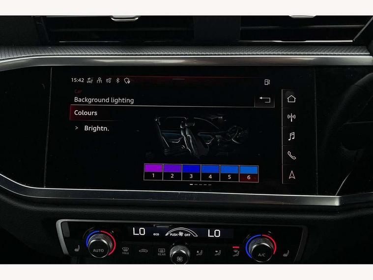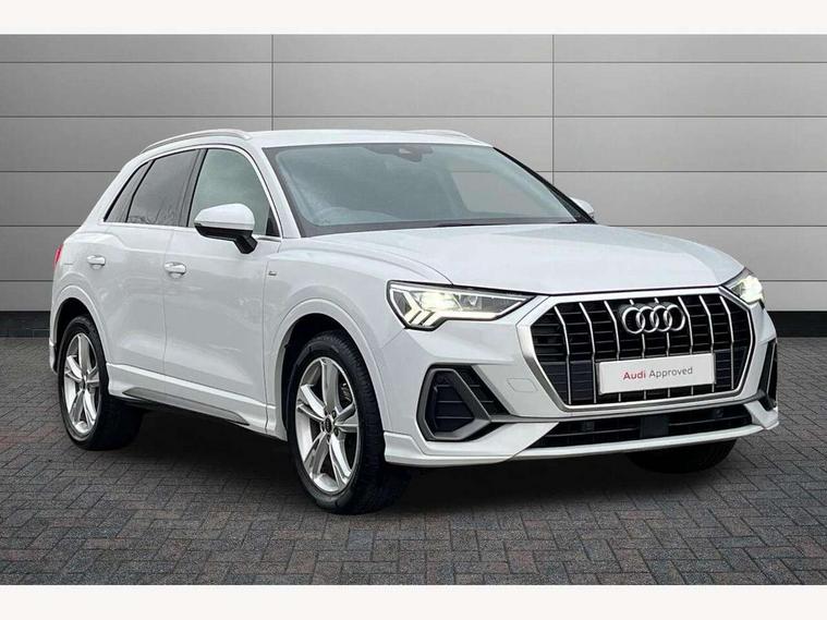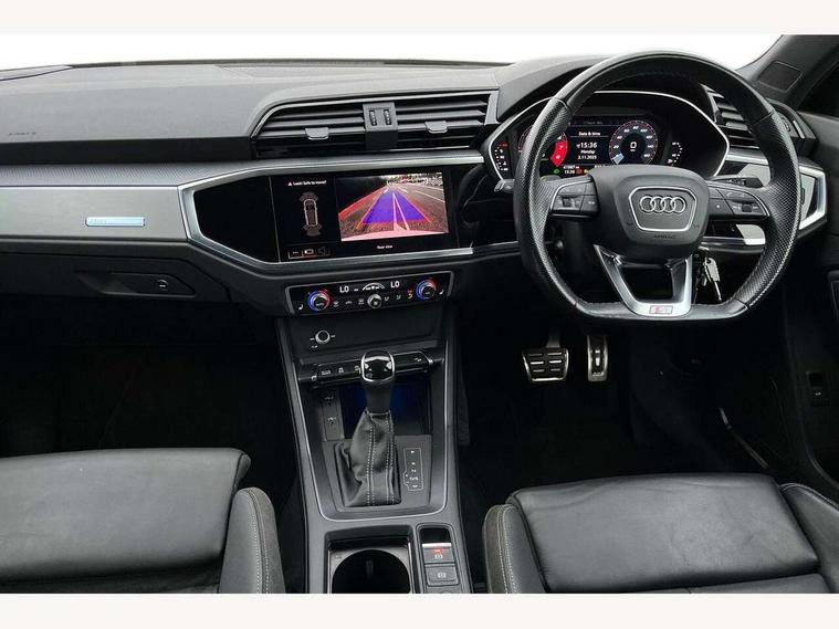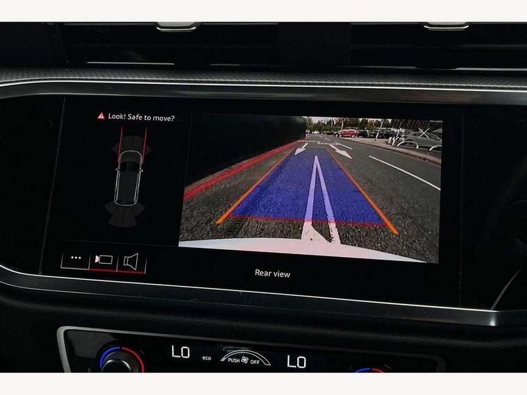 Audi connect safety and service (e-call), Audi drive select, Audi lane departure warning, Audi smartphone interface includes wireless Apple carplay/Android Auto, Audi Virtual Cockpit - 10.25" display, Bluetooth interface, Camera based traffic sign recognition, MMI Navigation Plus with high resolution 10.1 inch touchscreen colour display, Power operated tailgate, Progressive steering, Reversing camera, Service interval indicator, Start stop system with recuperation, Voice control system with natural language interaction, 48V Mild hybrid technology, Sports suspension, 2 USB-C ports with charge and data functions, Bang + Olufsen 3D sound system, DAB digital radio module, Acoustic windscreen, Aluminium roof rails, Aluminium window trim, Auto dimming frameless rear view mirror, Body coloured bumpers, Electrically folding, adjustable and heated door mirrors with integrated LED side indicators and kerb view function for passenger side, Front and rear electric windows, Front fog lights, Front side air inlets in matt platinum grey, Front spoiler blade in matt platinum grey, Grille vertical bars in aluminium silver/Matt, High gloss black finish B and C pillars, LED headlights with LED daytime running lights and dynamic rear indicator, LED rear lights, Privacy glass dark tinted rear and rear-side windows (from B-pillar backwards), Rain and light sensors, Rear diffuser strip in matt titanium black, S line badges on front wings, S Line front and rear bumpers, Side skirt insert in matt Platinium grey, Silver chrome grille surround, Titanium black radiator grille, 12V socket in rear centre console, 40:20:40 folding with manual adjustment for 60:40 forwards/backwards position and backrest angle, Adjustable rear seat bench/backrest with centre armrest and cupholder, Black cloth headlining, Dual zone electronic climate control, Front and rear black floor mats with contrast stitching in rock grey, Front and rear headrests, Front and rear roof module including reading lights, Front centre armrest, Glove compartment lighting, Heated front seats, Height and reach adjustable steering wheel, Illuminated door sill trims with S logo, ISOFIX child seat mounting for front passenger with airbag deactivation and outer rear seat including top tether attachment point for outer rear seats, Luggage compartment light, Manual front seats with height adjustment, Perforated leather gearknob, Stainless steel luggage compartment sill finisher, Stainless steel pedals, Tool kit, Non smoking pack - Q3, 3x3 point rear seatbelts, 6 airbags - Driver, front passenger, curtain and side windows, Electrically operated child locks on rear doors, Electromechanical parking brake, Electronic stabilisation control including ABS, ASR and EDL, Hill descent control, Hill hold assist, Pre sense basic, Seatbelt monitoring, Tyre pressure warning, Warning triangle and first aid kit, Anti theft alarm, Anti theft wheel bolts, Audi pre-sense front with pedestrain and cyclist recognition, Remote central locking, Dark matt brushed aluminium inlay, Leatherette door armrest, MMI touch colour display in glass look, black with surround in aluminium look, Tyre repair kit,