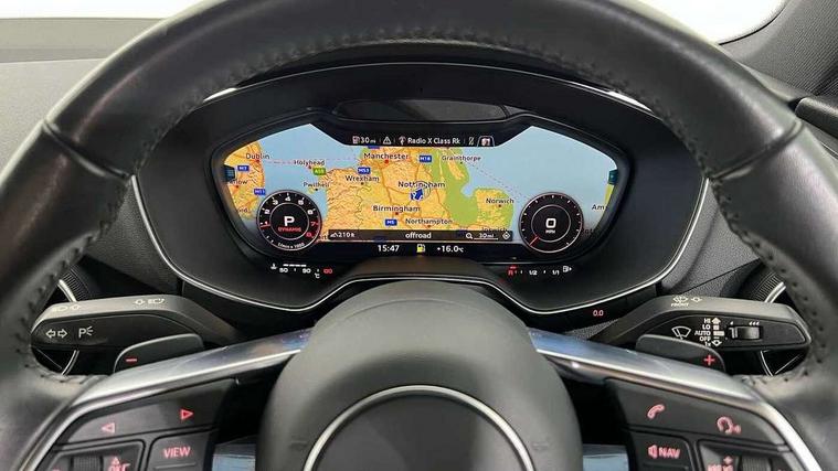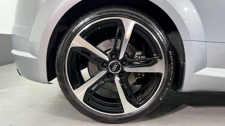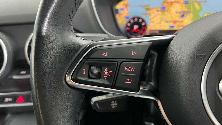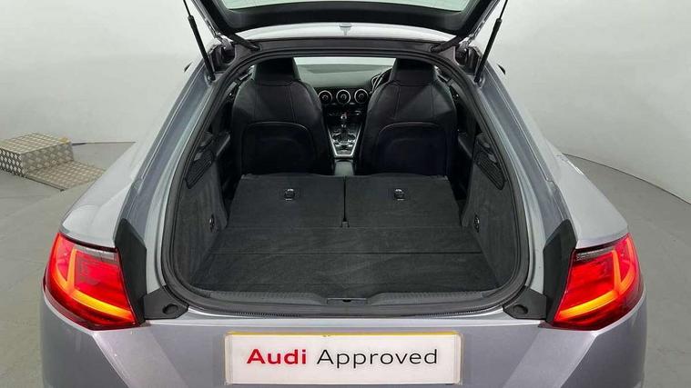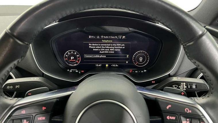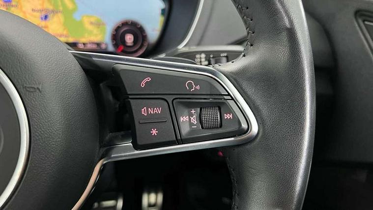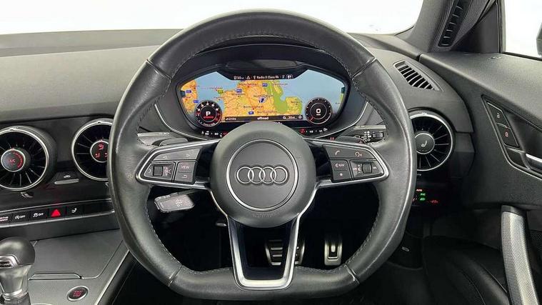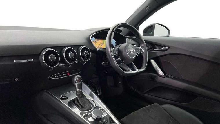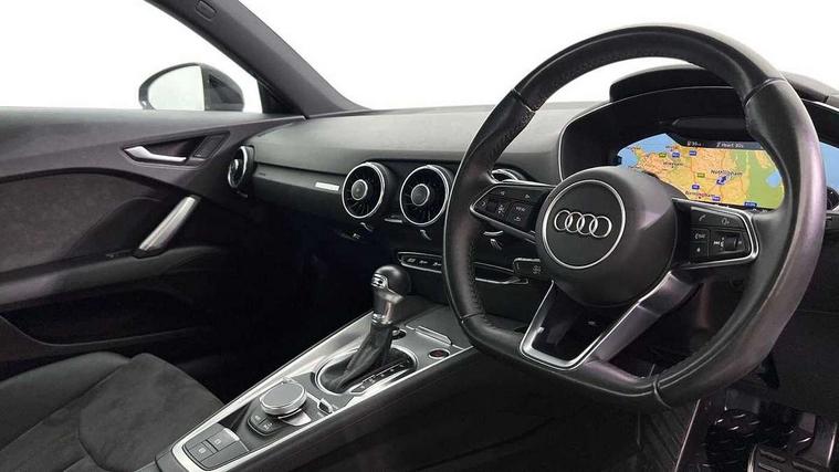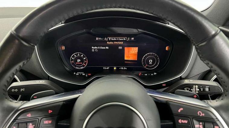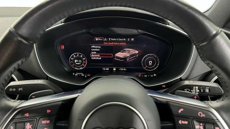 Audi drive select with 4 Pre configured modes, Audi smartphone interface, Audi virtual cockpit - 12.3" high-resolution LCD display with fully customisable instrument cluster, Cruise control + speed limiter, MMI touch panel, Mobile phone preparation with bluetooth interface, Progressive power assisted steering, Service interval indicator, Start/Stop system with energy recuperation, TP memo, Sports suspension, AM/FM radio, Bluetooth audio streaming, DAB Digital radio, MMI Radio with CD player and SD/XC card slot, Auto dimming rear view mirror, Electric folding door mirrors, Electric front windows, Electrically adjustable and heated door mirrors with integrated LED side indicators, Front fog lights, Green tinted heat insulating glass, Light and rain sensors, Retractable rear boot spoiler, Sunband for windscreen, Xenon headlights with LED daytime running lights with automatic headline range control + LED rear lights, brake lights and rear indicators, 12V socket, 3 spoke flat bottomed high multi-function leather sport steering wheel with gearshift paddles, Alcantara/Leather upholstery includes seat centre panels, door trim inserts in black Alcantara with side bolsters, head restraints in black leather, Aluminium door sill trims, Front centre armrest, Front sports seats, Heated front seats, Height adjustable driver's seat, Height adjustable front head restraints, Height/reach adjust steering wheel, ISOFIX child seat mounting for front passenger seat with airbag deactivation, Rear head restraints, Rear top tether child seat ISOFIX attachment, Split folding rear seat, Tool kit, Black styling pack - TT, Non smoking pack - TT/TT RS, 3 point front seat belts, ABS, ASR traction control, Curtain airbags, Driver and front passenger airbag with front passenger airbag deactivation, EDL traction control, Electromechanical parking brake, ESP, First aid kit, Front side airbags, Head airbags, Hill hold assist, Seatbelt warning, Tyre pressure loss indicator, Warning triangle, Anti theft alarm, Anti theft wheel bolts, Immobiliser, Keyless Go, Remote central locking, Aluminium design inlays, Tyre repair kit,