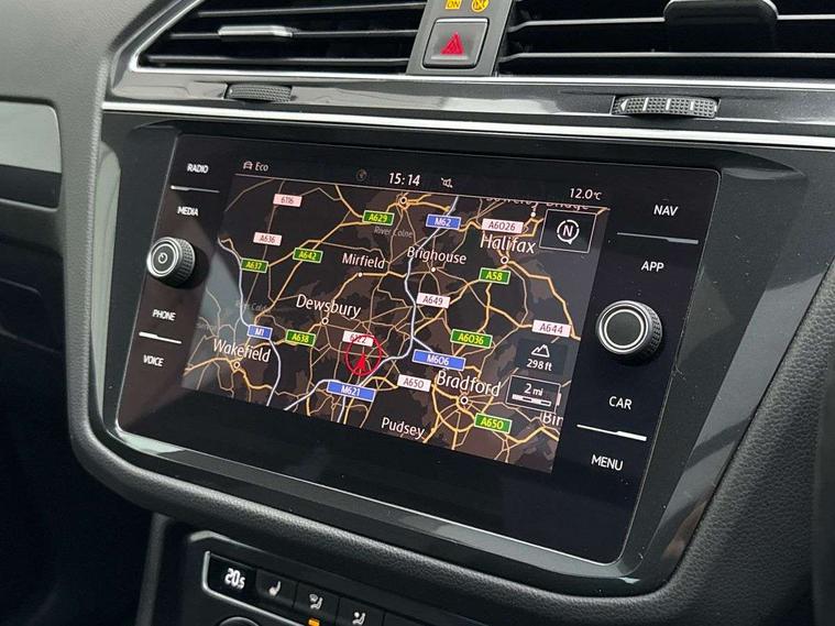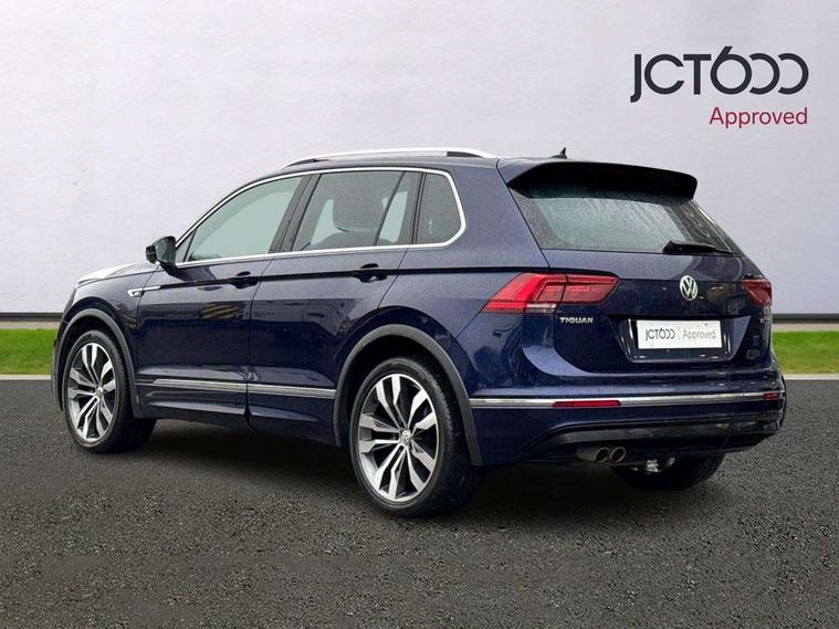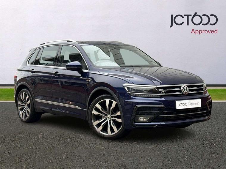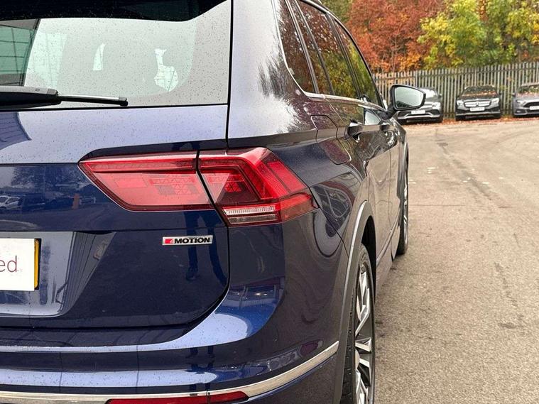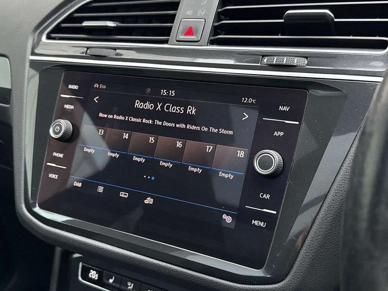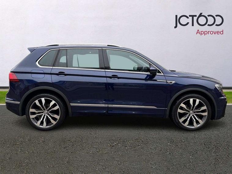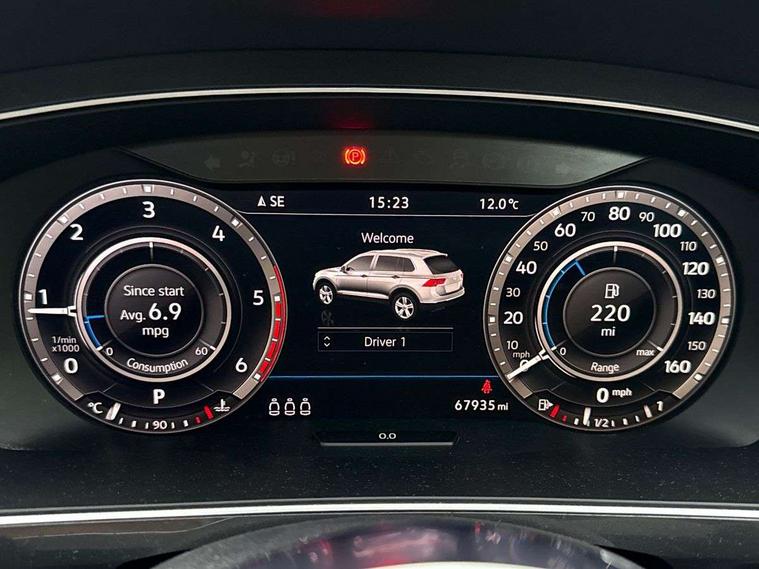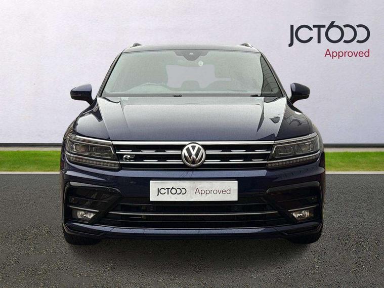 Active information display, Adaptive cruise control, App-Connect, Bluetooth phone integration system, Distance control assist, Drive mode selector, Driver profile selection, Fatigue detection system, Instrument cluster, Lane assist, Low washer fluid warning light, Outside temperature display, Progressive power assisted steering, Service interval indicator, Speed limiter, Warning lights, Diesel particulate filter, XDS electronic differential lock, 2x USB sockets in front, Aux-in socket, DAB Digital radio, MP3 compatible single CD player, SD card slot, Auto dimming interior mirror, Automatic activation of hazard warning lights, Body colour door handles, Body colour door mirrors, Body colour rear spoiler, Body colour side skirt, Body coloured bumpers, Chrome side window surrounds, Chrome trimmed radiator grille, Coming/leaving home lighting function, Dusk sensor + auto driving lights, Electric folding door mirrors, Electric heated + adjustable door mirrors, Electric panoramic sunroof with sunblind, Front and rear electric windows, Heated rear window, LED headlights with dynamic light assist daytime running lights and cornering front fog lights, LED rear lights, Piano black rear diffuser, R Line body kit, Rain sensor windscreen wipers, Rear windscreen washer and wiper with interval delay, Silver roof rails, Silver under body guard, Tinted windows (B pillar backwards), Twin trapezoid chrome exhaust pipes, Windscreen wipers/ intermittent wipe + 4 position delay, 12V Accessory socket in centre console, 3 rear headrests, 3 zone climate control, 4 load lashing points, 40:20:40 split folding rear seats, Bag hook in luggage compartment, Black headlining, Driver + front passenger lumbar support, Foldable passenger seatback, Front + rear carpet mats, Front centre armrest with 12v socket, Front centre armrest with storage + rear 2 air vents + cupholders, Front seatback folding tables, Height/reach adjust steering wheel, Illuminated driver/passenger vanity mirrors, Illuminated scuff plates, Interior light with delay, Isofix Preparation 2 Rear child seats, Leather gear knob, Leather multifunction steering wheel with paddle shift, Load through provision with 2 cupholders when folded, Lockable cooled glovebox, Luggage compartment lighting, Luggage compartment side storage, Map pockets on front seats, Passenger seat height adjuster, Rear cupholders, Removable luggage cover, Sliding/reclining rear seats, Stainless steel pedals, Storage compartment in driver's door, Storage compartment in passenger's door, Storage compartment in rear doors, Storage tray on dashboard, Sunglasses storage, Variable boot floor, Ambient lighting pack - Tiguan, 3 rear 3 point seatbelts, ABS+EBD+Brake assist, Active bonnet, Active pedestrian safety system, Curtain airbags, Driver/Front Passenger airbags, Driver/Passenger whiplash optimised head restraints, Drivers knee airbag, DTC - Drag torque control, Electronic parking brake with auto hold, ESP with EDL + ASR, First aid kit, Front assist including city emergency braking, Front side airbags, Head airbag system, Height adjustable front 3 point seatbelts + pretensioners, Hill hold control, Passenger airbag deactivate switch, Passenger knee airbag, Pre crash system, Rear side airbags, Seatbelt warning lamp and buzzer, Two tone horn, Warning triangle, Alarm with interior protection, Electronic engine immobiliser, Remote central locking with 2 remote folding keys, Aluminium decorative inserts, Chrome door trim inserts, 20" Suzuka alloy wheels + anti theft wheel bolts, Steel space saver spare wheel,