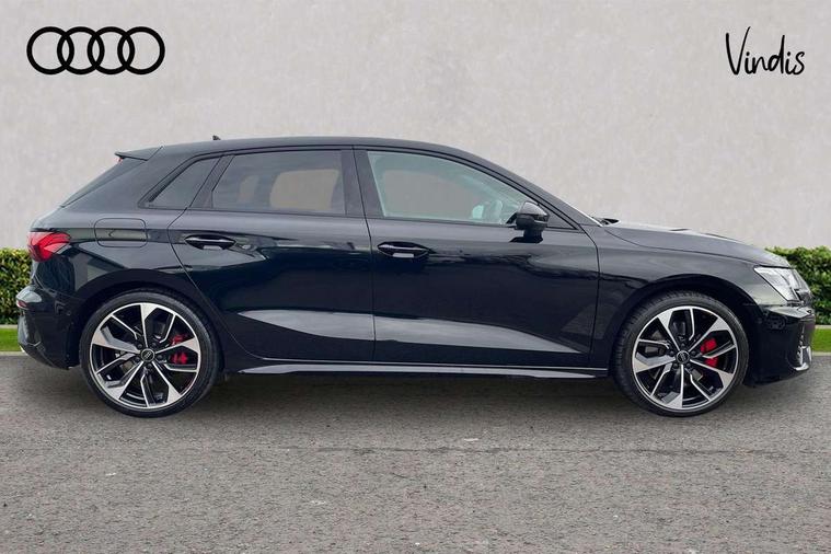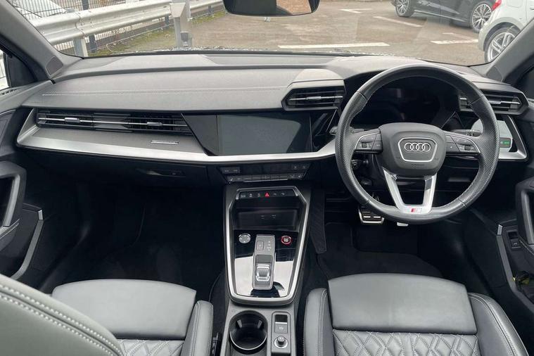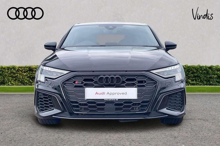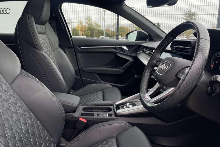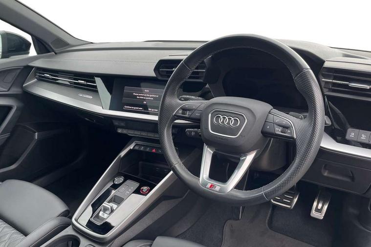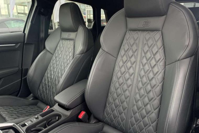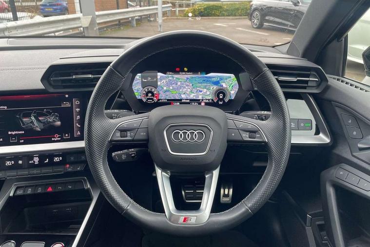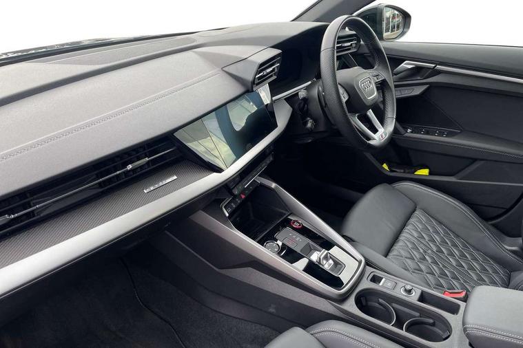 Adaptive cruise assist, Audi drive select (Auto, Comfort, Dynamic, Efficiency and Individual), Audi smartphone interface, Audi virtual cockpit plus - 12.3" full HD resolution dynamic digital instrument cluster, Automatic start/stop system with recuperation, Bluetooth interface, Collision avoidance assistant, e-Call (emergency call), Head up Display, Lane change assistant with exit warning system and rear cross traffic alert, Lane departure warning system, MMI Navigation Plus with high resolution 10.1" colour touch screen display, Power operated tailgate - Luggage compartment lid opens/closes electrically, Progressive steering, Service indicator, Trip computer, Voice control system with natural language interaction, Quattro permanent all wheel drive, S suspension with damper control, 2xUSB-C connection with data and charging functions, DAB Digital radio, 3rd brake light, Acoustic glass windscreen, Audi Beam uses LEDs to project Vorsprung onto the ground as you exit your S3, Auto dimming frameless rear view mirror, Carbon door mirror housings, Dual branch oval twin tailpipes in chrome plated finish, Electrically adj heated/folding + automatically dimming exterior mirrors with memory + automatic kerb side function for passenger side exterior mirror, Front electric windows, Headlight washers, Heat insulating glass windscreen, Illuminated door sills with aluminium inserts at the front with S logo, Integrated LED indicators in door mirrors, LED daytime running lights, Light and rain sensors, Privacy glass - dark tinted rear window, rear door and side windows, Rear electric windows, Rear side air outlets in grained matt black, Rear side wing doors, Rear wiper, 12V socket and storage compartment in front centre console, 3 seat bench in 2nd row, 3 spoke leather multifunction steering wheel with gear shift paddles, 4 way electrically adjustable lumbar support for driver and front passenger, 60/40 split folding rear seat bench, Black cloth headlining, Dual zone electronic climate control, Fine Nappa leather upholstery with front sports seats S embossed logo, Front and rear centre armrest in artificial leather, Front and rear headrests, Front/rear floor mats, Height and reach adjustable steering wheel, Interior lighting - glove compartment light and right hand side, Luggage compartment floor covering, Seat side bolsters, Single front passenger seat, Stainless steel pedals and front footrest in black, Aluminium interior elements pack - A3 Sportback, Black styling pack - A3 Sportback/S3, Body styling design pack - S3, Extended ambient lighting pack - A3 Sportback, Storage pack - A3 Sportback, Technology pack pro with 360 camera - A3 Sportback/Voursprung, 3x3 point rear seat belts, Driver and front passenger airbag with passenger airbag deactivation, Electronic Stabilisation Control (ESC) including ABS, ASR and EDL, First aid kit with warning triangle and 2 safety vests, Front side airbags with head airbags and interaction airbag, Pre-sense front with pedestrian and cyclist detection, Seatbelt monitoring, Tyre pressure loss indicator, Anti theft alarm, Anti-theft wheel bolts, Electronically operated child locks, Immobiliser, Remote control central locking, Carbon inlays, accent surfaces in the dashboard and centre console in platinum grey silk effect paint finish,
