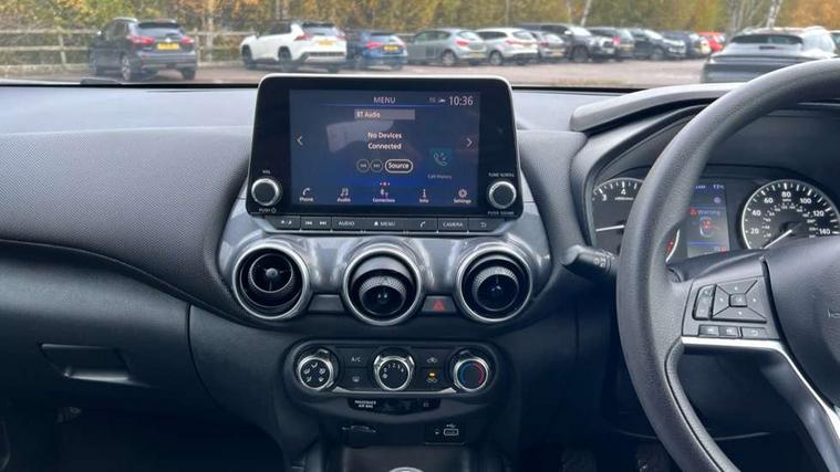 4.2" full colour TFT screen combimeter, 8" infotainment colour display with touch screen, Apple CarPlay and Google Android auto, Cruise control + speed limiter, Emergency and breakdown call, Idle start/stop system, Intelligent lane intervention, Lane departure warning system, Nissan connect services and Wifi connection, Outside temperature sensor, Power Steering, Rear view camera, Traffic sign recognition, Trip computer, Gasoline particulate filter, 4 speakers, Bluetooth system, USB, Aux-in and 12V socket, DAB Digital radio, Automatic hazard signal with emergency stop signal, Body colour bumpers, Body colour door handles, Electrically adjustable door mirrors with integrated indicators, Follow me home headlights, Front and rear electric window with one touch driver window, High beam assist, LED daytime running lights, LED headlamps, LED rear fog lamp, LED rear lamps, Manual dimming interior rear view mirror, Pearl black door mirrors, Rear privacy glass, Rear spoiler, Rear wiper, Three blink turn signal, 3 height adjustable rear headrests, 60/40 split folding rear seat, Cloth upholstery, Driver and passenger sliding and reclining seats, Driver side rear coat hanger, Driver/passenger sunvisors and vanity mirrors, Front and rear cabin lighting, Front door pockets with bottle holders, Front head restraints, Front/rear passenger grab handles, Height adjustable driver's seat, Internal chrome door handles, Luggage board, Luggage space lighting, Monoform sporty seats, Multifunction steering wheel, Rear door bottle holders, Telescopic steering wheel adjustment, Two cupholders in front centre console, Two rear isofix child seat anchorage points with top tether, Voice recognition switch on steering wheel, Welcome light and console tray ambient lighting, ABS with EBD and brake assist, Active ride control, Active Trace Control, Driver and passenger airbags, Driver and passenger side airbags, Electronic Stability Programme (ESP), Front and rear curtain airbags, Height adjustable seatbelts, Hill start assist, Intelligent emergency braking with pedestrian and cyclist recognition, Rear drum brakes, Seatbelt reminder for driver/front passenger and rear seats, Single tone horn, Three 3 point rear seatbelts, Traction control, Tyre pressure monitoring system, VDC Dynamic Vehicle Control, Alarm, Immobiliser, Remote central locking, 17" alloy wheels,
