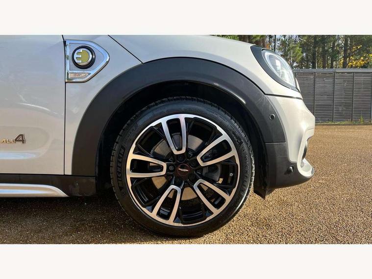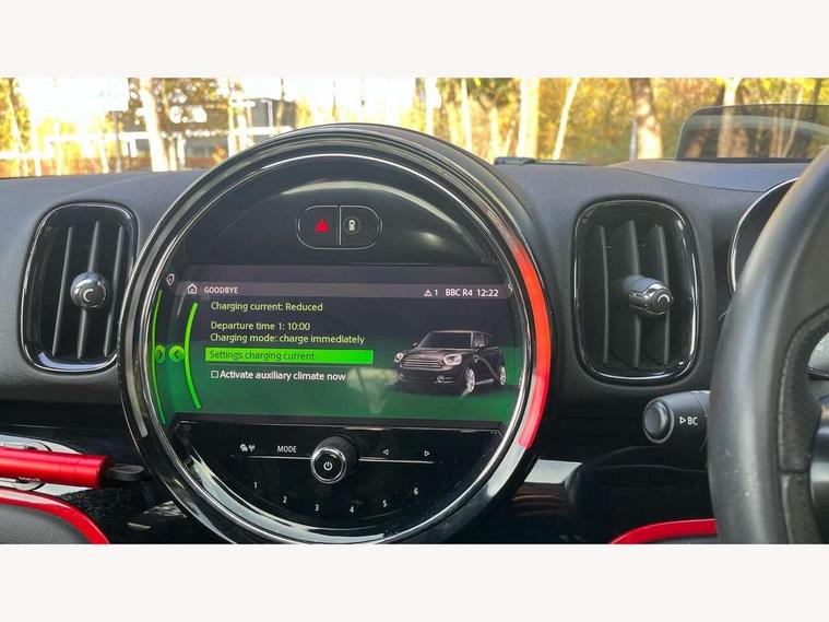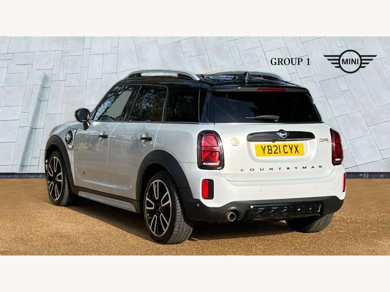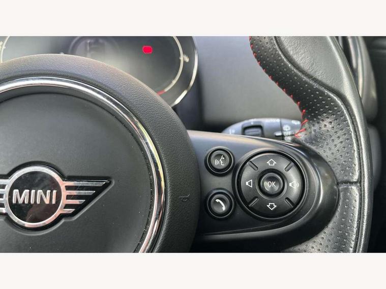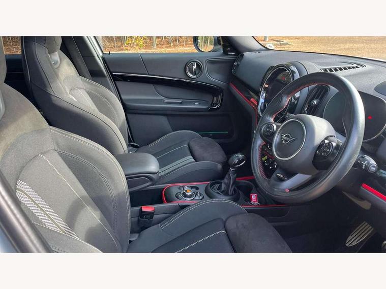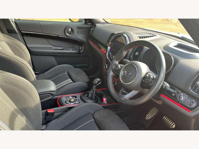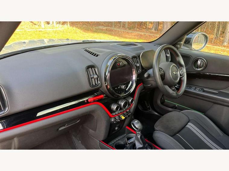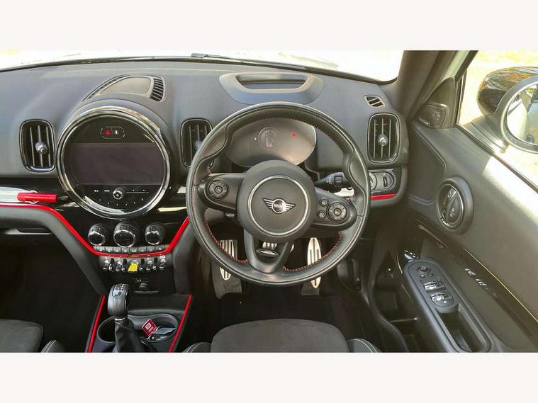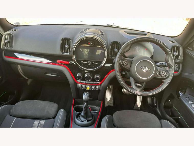 Active Guard incl speed limiting and lane departure functions with auto steering, and front collision warning with brake intervention, Automatic start/stop function with brake energy recuperation, Compatible mobile phone bluetooth with audio streaming, eDrive button, Electro-mechanical speed dependant steering assistance, Instrument cluster, On board computer, Rear parking distance control, 36L fuel tank, Automatic transmission, Charging flap on front left lower A-panel, Double Vanos system, Fully variable valve control, High precision injection, Home charging cable, Performance Control, Public charging cable, Sports suspension, FM tuner and DAB digital radio, Bonnet scoop, Chrome fuel filler cap, Day time driving lights, Dynamic brake lights, Electric windows, Heated rear window, Heated windscreen washer jets, John Cooper Works - aerodynamic kit (front and rear apron, spoiler), front and rear sport bumpers and part-painted side sills with door sill finishers, John Cooper Works Logo, LED fog lights, LED Headlights, Metal door sill strips with Cooper S imprint, Model logo, Model logo on Tailgate, Rain sensor with auto headlights, Rear fog lights, Rear window wiper, Side scuttle panel with integrated indicator, Split rear doors, Sun/heat protection glass, White indicator lenses, 12V socket in centre console, 360L luggage compartment capacity, 4 lashing eyes in luggage compartment, 40:20:40 split folding rear seats, Anthracite headlining with grab handles and clothes hooks, Chrome interior highlights, Colour line - Carbon black, Cupholders, English handbook, Floor mats, Front headrests, Glove compartment, Height and length steering column adjustment, Interior lighting with 12 basic colours selectable via toggle switch in roof, Isofix rear child seat preparation, LED reading lights, vanity mirror lights, front foot well light and spotlight on front seats, Manual air conditioning, Mini John Cooper Works leather gearshift lever and handbrake gaiters, Multifunction steering wheel, Nappa leather steering wheel with MINI Yours logo, Rear headrests, Stainless steel pedals and foot rest, Storage compartments in doors, Sunvisors with vanity mirrors, Excitement pack - Countryman, Navigation pack - Countryman, Piano black exterior pack - Countryman Cooper S/SD/SE/Boardwalk, 2 tone horn, 3 point seatbelts on all seats, 6 Airbags - front, side, head and seat belt tensioners, Acoustic pedestrian protection, Anti-lock braking system (ABS), DSC - Dynamic Stability Control, Electronic handbrake, Front and rear disc brakes, Hill start assist, Tyre pressure monitoring system, Alarm system with tilt sensor, monitoring doors, bonnet interior and tailgate, Auto drive away locking, Deadlocking function, Electronic vehicle immobiliser, Locking wheel bolts, Start/stop toggle with keyless go, Piano black JCW interior trim, Tool kit,