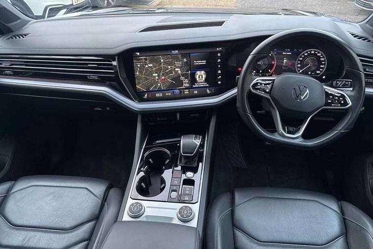 2D/3D map view, ACC - Adaptive cruise control with front assist, forward collision warning, distance monitoring, city emergency brake and speed limiter, Apple car play/Android Auto, Audible and visual fatigue detection system, Bluetooth hands free telephone connection, Car information display, Drive select with Damper control, Driver alert system, Driver profile selection, Dynamic road sign display camera controlled system with visual warning for traffic and road signs, eCall emergency system, Fully electric tailgate + keyless entry and start, Instrument cluster, MirrorLink, Multifunction camera, Multifunction computer premium with 7" colour display, One touch indicators with repeat function, Service interval indicator, Speed sensitive power steering, Start/stop system with regenerative braking, Tailgate power latch, Think blue trainer driver tips and journey analysis, Traffic sign recognition, Voice control system, Wireless Smartphone charger, 24 litre AdBlue tank, Torsen limited slip differential, DAB Digital radio, Dynamic navigation based on TMC+, Gesture control for infotainment system, Multi device interface (MDI) with illuminated USB-C connection, Music playback - MP3, WMA and AAC files, SD card slot, Simultaneous pairing of 2 compatible mobile devices, SMS functionality - read, compose and send SMS messages using touch-screen display, Title and cover art display, Volkswagen media control, Adaptive low beam for urban and motorway use, Auto dimming rear view mirror, Automatic coming/leaving home lighting function, Automatic headlights, Black anodised roof rails, Black door mirrors, Black rear diffuser, Black side window surrounds, Black upper and lower grille louvres extending into headlights and radiator grille, Body colour door handles, Body coloured wheel arches, C signature gloss black front air intake, Chromed tailpipe on the left and right integrated in the bumper with trapezoid design, Dusk sensor, Dynamic headlight range control, Electric front tilt/slide panoramic sunroof and fixed rear sunroof, Electrically power adjustable, heated, folding, auto dimming, front passenger exterior door mirror lowering function, Front and rear electric windows, Galvanised body, Gloss black finish B pillar, Gloss black rear diffuser, Headlight washers, Heat insulating darkened glass in side and rear windows, Heated windscreen washer jets, IQ.Light-LED matrix headlight, daytime running light with dynamic cornering light and indicator, LED 3rd brake light, LED rear fog light, LED rear number plate lights, Plastic scuff plates in door apertures, Poor weather light, Puddle lights, Rain sensor, Rear side wing doors, Rear wiper, 12V socket in front and rear centre console and boot, 2 Coat hooks on B pillar, 3 rear head restraints, 3 seat bench in 2nd row, 3 spoke sport heated leather multi-function sports steering wheel with gear shift paddles - generation 2, 4 way adjustable front head restraints, 4 way electric lumbar support for driver and front passenger, 4 zone climate control, 40:20:40 split folding slide/recline rear seat, B pillar vents, Black lower edge of door extending sills, Branded points of interest, Double sun visor for drivier and passenger with LED illuminated vanity mirrors, Electric luggage compartment cover, Folding rear centre armrest with 2 cupholders, Front + rear carpet mats, Front centre armrest with storage box, Gear shift indicator, Height/reach adjust steering wheel, Illuminated air conditioned glovebox, Isofix preparation for 2 rear child seats, Jack and tool kit, Leather trimmed gear knob with gloss black inlay/aluminum trim, Leatherette door trim, LED luggage compartment lighting, Load through provision, Luggage compartment with load lashing rings, Plastic loading edge protection, Rear seat remote release levers, Single front passenger seat, Soul black headlining, Stainless steel pedals, Innovision cockpit pack - Touareg, 3 point front seatbelts with pre-tensioners, ABS, Active bonnet, Automatic post collision braking system, Curtain airbags, Driver/Front Passenger airbags, EBD + Brake Assist, EDL, Electronic parking brake with auto hold, ESC with ASR, Front seat side impact airbags, Hill descent control, Hill start assist, Passenger airbag deactivate switch, Seatbelt warning lamp and buzzer, Three 3 point rear seatbelts, Two tone horn, Volkswagen roadside assistance, Warning triangle and first aid kit, Alarm with interior monitoring in cab, backup horn and towing protection, Child security locks for front and rear doors, Electronic engine immobiliser, Remote central locking, Black decorative trims on the side windows, High gloss black centre console,
