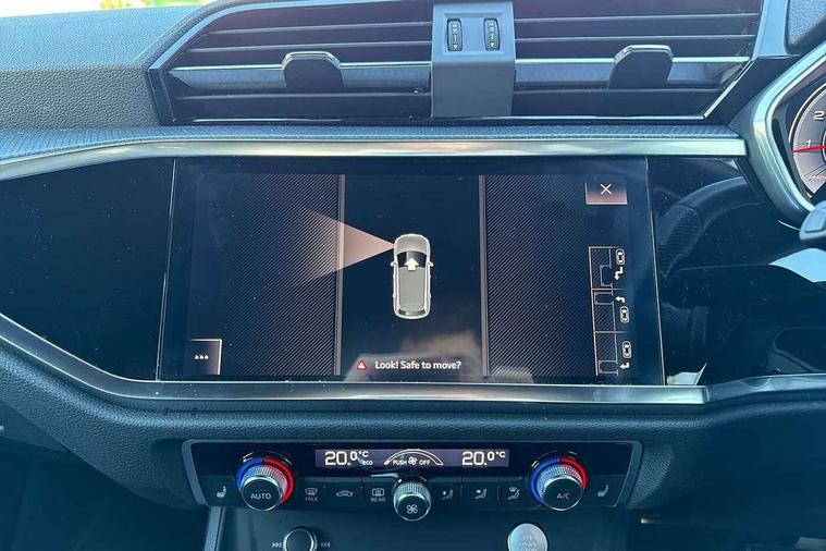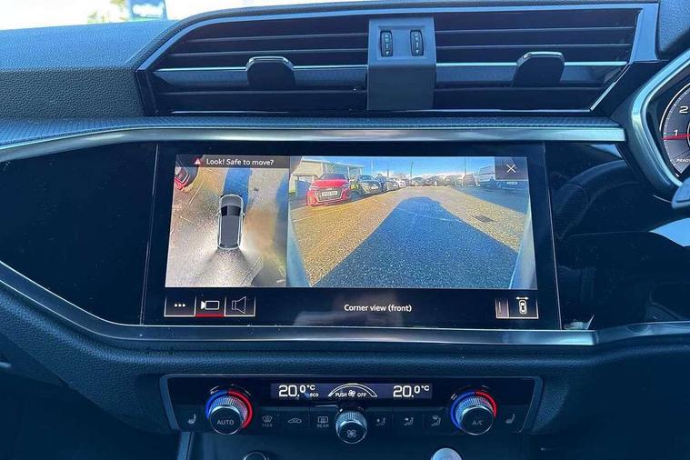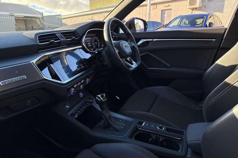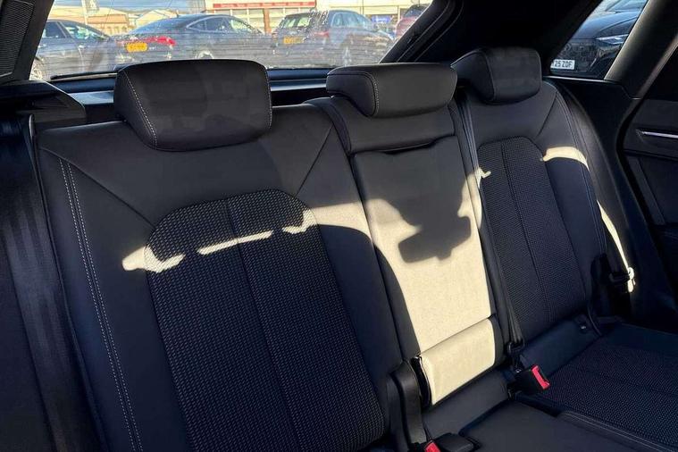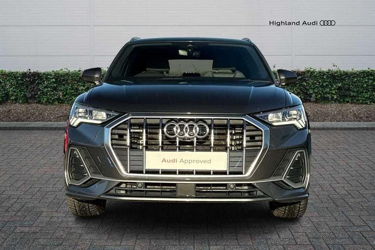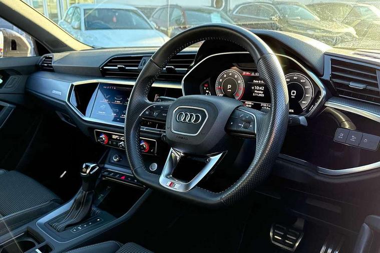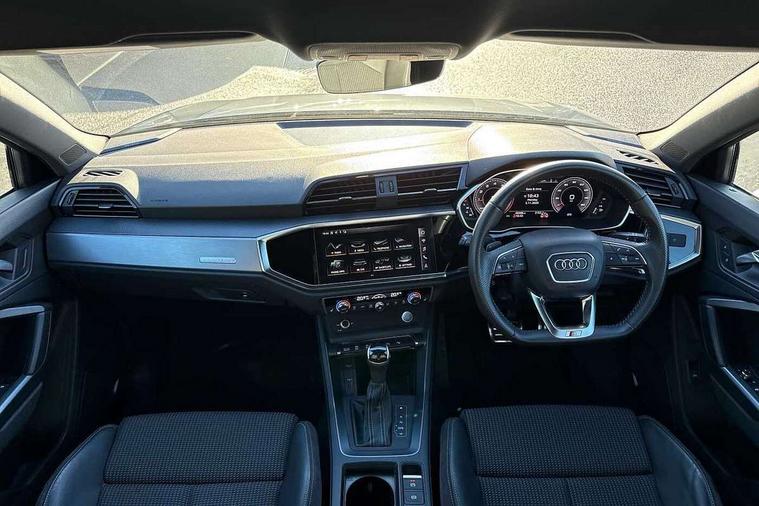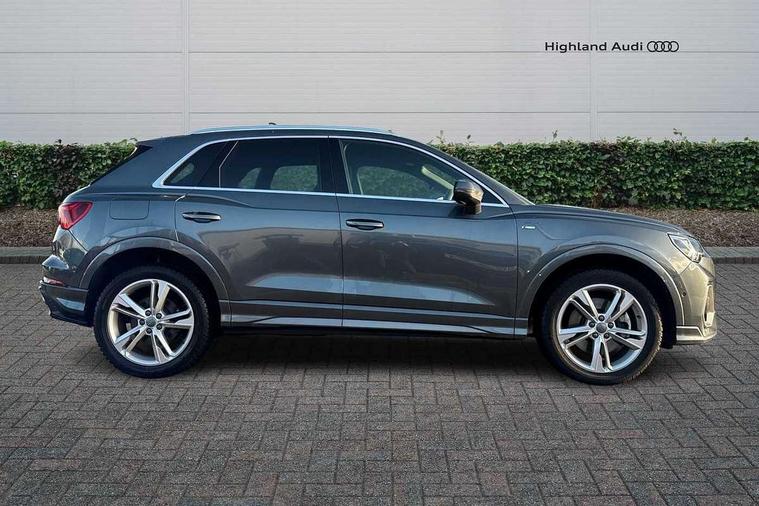 Audi connect safety and service (e-call), Audi drive select, Audi lane departure warning, Audi side assist, Audi smartphone interface, Bluetooth interface, Camera based traffic sign recognition, MMI navigation plus with MMI touch, Power opening/closing tailgate, Progressive steering, Rear parking sensors, Service interval indicator, Stop/start system, Voice control system, Sports suspension, 1 x USB type C and 1 USB type A charging points, 6 speakers, DAB digital radio module, Acoustic windscreen, Aluminium roof rails, Aluminium window trim, Auto dimming rear view mirror, Body coloured bumpers, Diffuser in matt Platinum grey, Electrically adjustable and heated door mirrors with integrated LED side indicators, Front and rear electric windows, Front fog lights, Front side air inlets in matt platinum grey, Front spoiler blade in matt platinum grey, Grille vertical bars in aluminium silver/Matt, High gloss black finish B and C pillars, LED headlights with LED daytime running lights and dynamic rear indicator, LED rear lights, Privacy glass, Rain and light sensors, Rear diffuser strip in matt titanium black, S Line badge on wings, S Line front and rear bumpers, Side skirt insert in matt Platinium grey, Titanium black radiator grille, 12V socket in rear centre console, 40:20:40 split folding rear bench seat, Adjustable rear seat bench/backrest with centre armrest and cupholder, Aluminium door sill trims, Black cloth headlining, Dual zone climate control, Front and rear black floor mats with contrast stitching in rock grey, Front and rear headrests, Front centre armrest with storage compartment and angle adjustment, Illuminated door sill trims with S logo, ISOFIX child seat mounting and Top Tether with front passenger airbag deactivation, Manual front seats with height adjustment, Perforated leather gearknob, Stainless steel luggage compartment sill finisher, Stainless steel pedals, Non smoking pack - Q3, 3x3 point rear seatbelts, 6 airbags - Driver, front passenger, curtain and side windows, Electrically operated child locks on rear doors, Electromechanical parking brake, Electronic stabilisation control including ABS, ASR and EDL, Hill hold assist, Pre sense basic, Seatbelt monitoring, Tyre pressure warning, Warning triangle and first aid kit, Anti theft alarm, Anti theft wheel bolts, Audi pre-sense front with pedestrain and cyclist recognition, Remote central locking, Dark matt brushed aluminium inlay, MMI touch colour display in gloss black with aluminium surround,