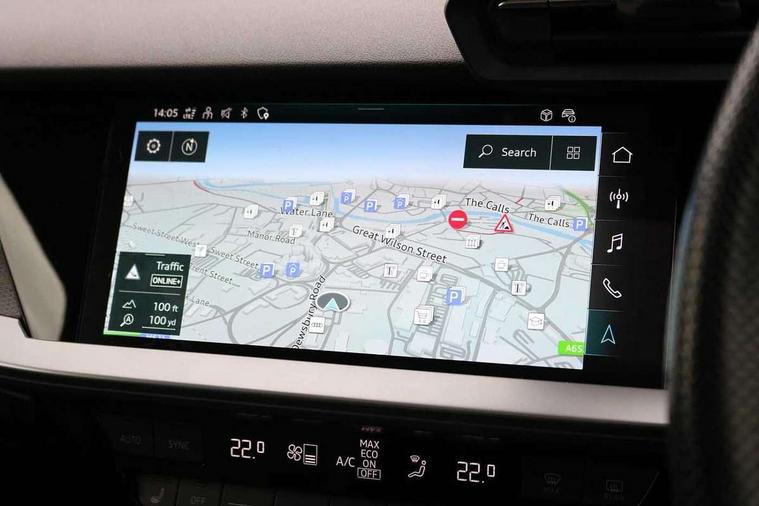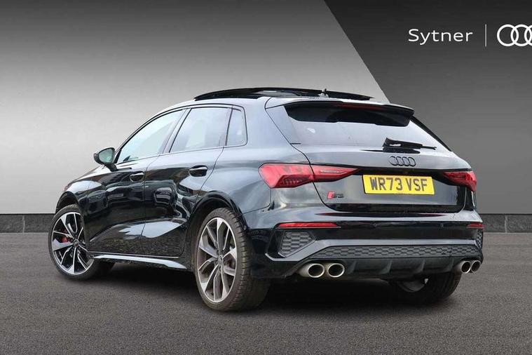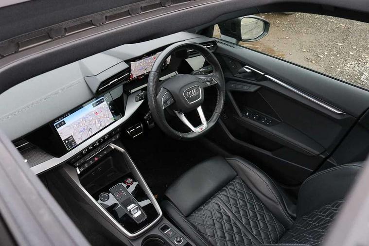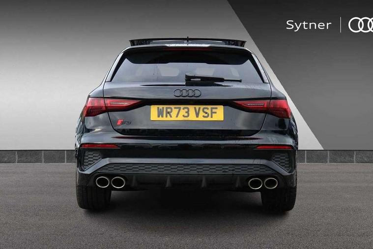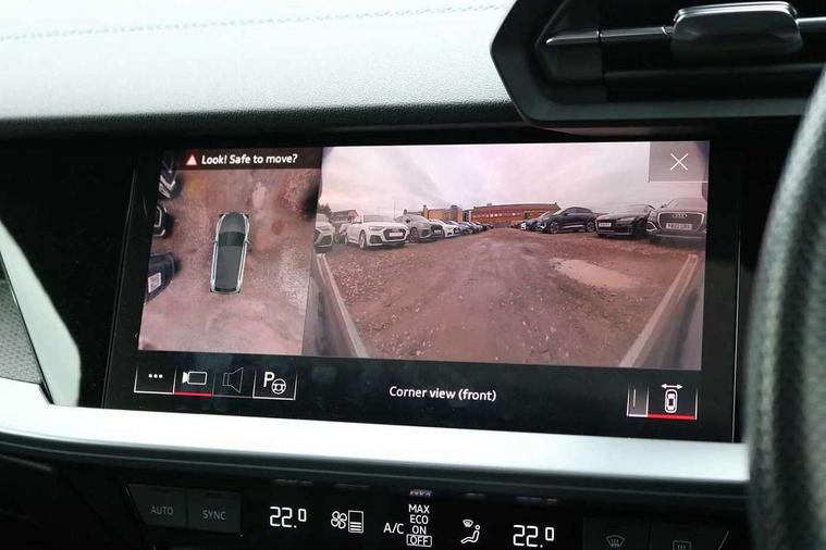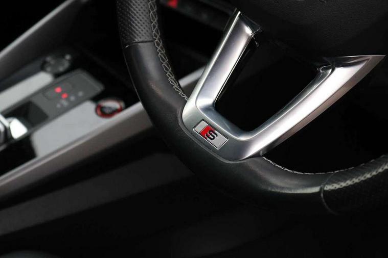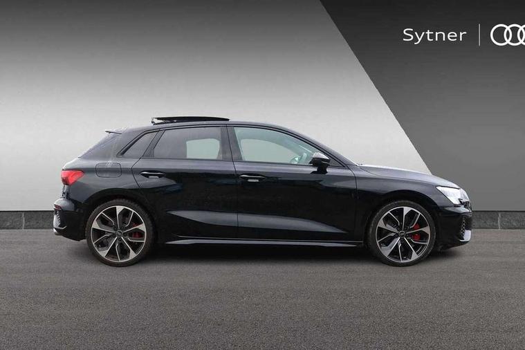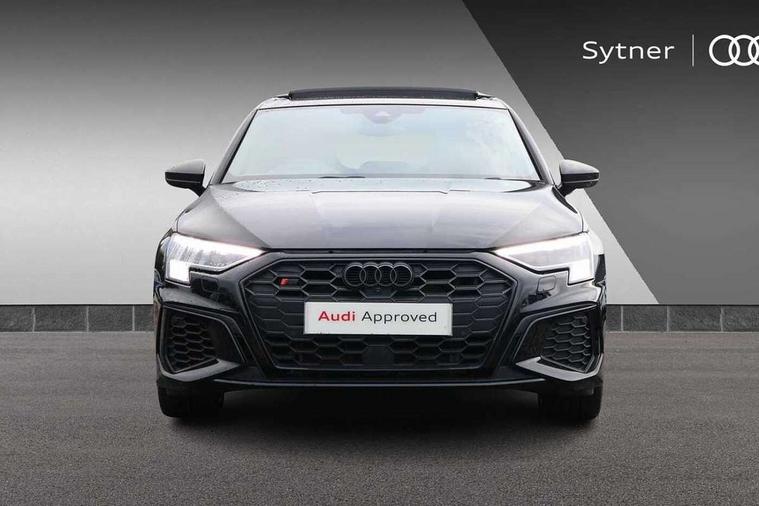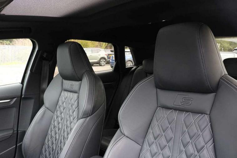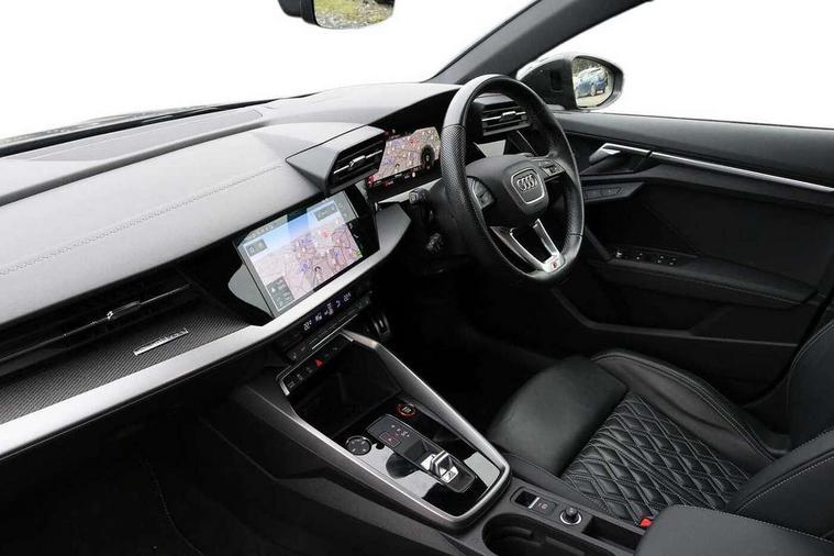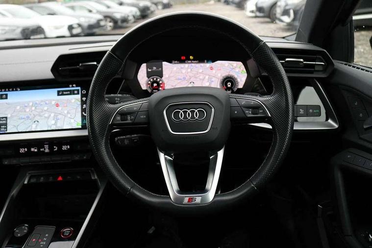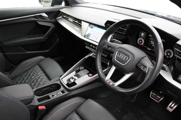 Adaptive cruise assist, Audi drive select (Auto, Comfort, Dynamic, Efficiency and Individual), Audi smartphone interface, Audi virtual cockpit plus - 12.3" full HD resolution dynamic digital instrument cluster, Automatic start/stop system with recuperation, Bluetooth interface, Collision avoidance assistant, e-Call (emergency call), Head up Display, Lane change assistant with exit warning system and rear cross traffic alert, Lane departure warning system, MMI Navigation Plus with high resolution 10.1" colour touch screen display, Power operated tailgate - Luggage compartment lid opens/closes electrically, Progressive steering, Service indicator, Trip computer, Voice control system with natural language interaction, Quattro permanent all wheel drive, S suspension with damper control, 2xUSB-C connection with data and charging functions, DAB Digital radio, 3rd brake light, Acoustic glass windscreen, Audi Beam uses LEDs to project Vorsprung onto the ground as you exit your S3, Auto dimming frameless rear view mirror, Carbon door mirror housings, Dual branch oval twin tailpipes in chrome plated finish, Electrically adj heated/folding + automatically dimming exterior mirrors with memory + automatic kerb side function for passenger side exterior mirror, Front electric windows, Headlight washers, Heat insulating glass windscreen, Illuminated door sills with aluminium inserts at the front with S logo, Integrated LED indicators in door mirrors, LED daytime running lights, Light and rain sensors, Privacy glass - dark tinted rear window, rear door and side windows, Rear electric windows, Rear side air outlets in grained matt black, Rear side wing doors, Rear wiper, 12V socket and storage compartment in front centre console, 3 seat bench in 2nd row, 3 spoke leather multifunction steering wheel with gear shift paddles, 4 way electrically adjustable lumbar support for driver and front passenger, 60/40 split folding rear seat bench, Black cloth headlining, Dual zone electronic climate control, Fine Nappa leather upholstery with front sports seats S embossed logo, Front and rear centre armrest in artificial leather, Front and rear headrests, Front/rear floor mats, Height and reach adjustable steering wheel, Interior lighting - glove compartment light and right hand side, Luggage compartment floor covering, Seat side bolsters, Single front passenger seat, Stainless steel pedals and front footrest in black, Aluminium interior elements pack - A3 Sportback, Black styling pack - A3 Sportback/S3, Body styling design pack - S3, Extended ambient lighting pack - A3 Sportback, Storage pack - A3 Sportback, Technology pack pro with 360 camera - A3 Sportback/Voursprung, 3x3 point rear seat belts, Driver and front passenger airbag with passenger airbag deactivation, Electronic Stabilisation Control (ESC) including ABS, ASR and EDL, First aid kit with warning triangle and 2 safety vests, Front side airbags with head airbags and interaction airbag, Pre-sense front with pedestrian and cyclist detection, Seatbelt monitoring, Tyre pressure loss indicator, Anti theft alarm, Anti-theft wheel bolts, Electronically operated child locks, Immobiliser, Remote control central locking, Carbon inlays, accent surfaces in the dashboard and centre console in platinum grey silk effect paint finish,