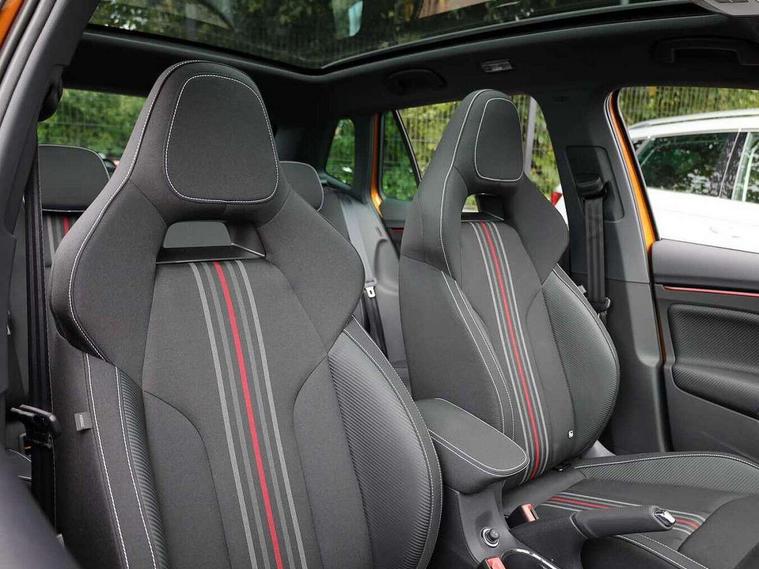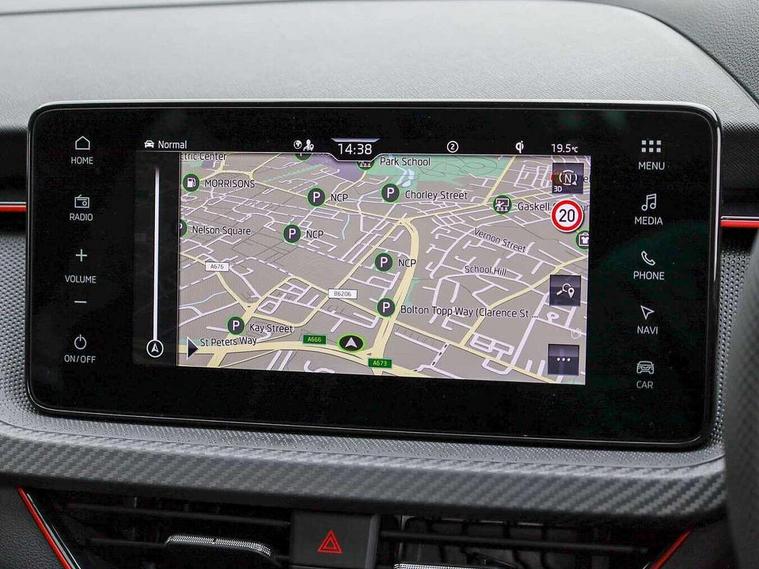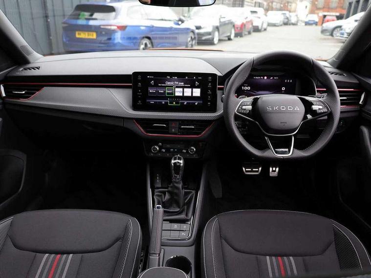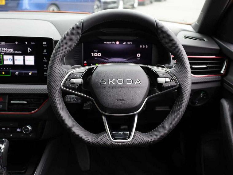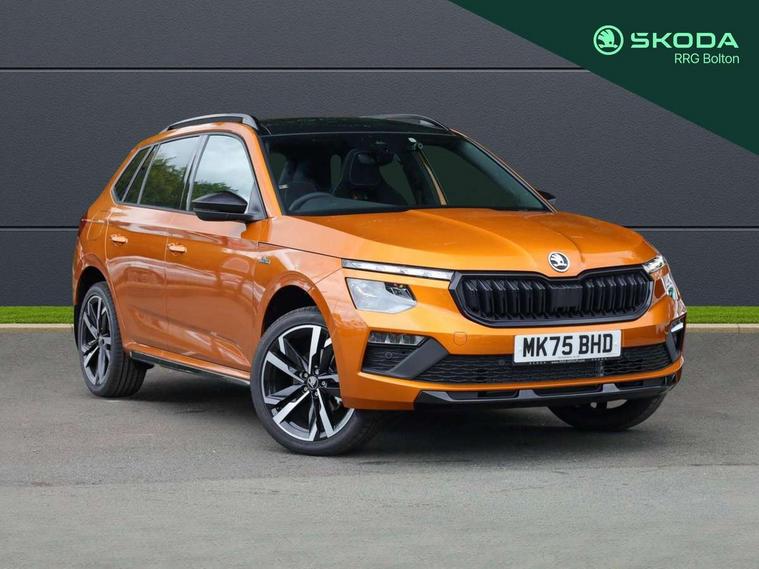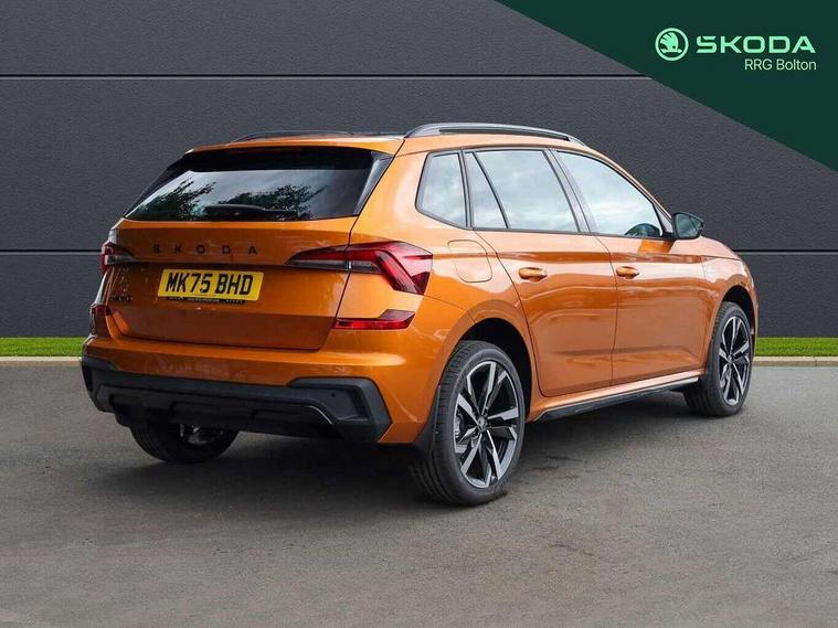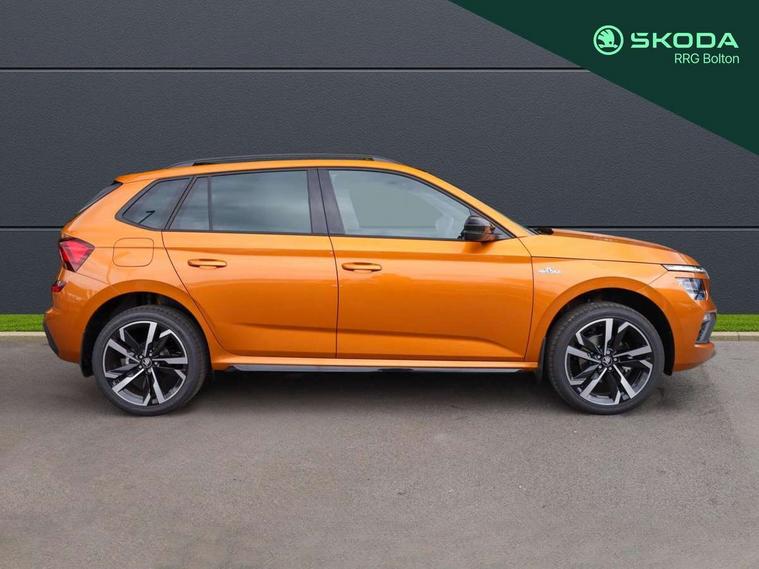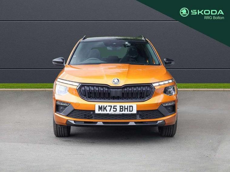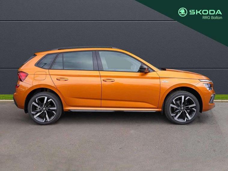 Advanced driver attention and drowsiness monitor, Bluetooth system, E-call, Front assist system, PAS, Rear parking sensors, Rear view camera, Service indicator, Speed limiter, Traffic sign recognition, Virtual cockpit with 10.25" display, Voice control system, Wireless smartlink, 4 USB C ports, 8 Speakers, 9.2" Skoda navigation display, DAB Digital radio, Auto dimming rear view mirror, Automatic headlight control with coming home and leaving home feature, Black door mirrors, Black radiator grille, Black rear diffuser, Black roof spoiler, Body colour bumpers, Body colour door handles, Boot lettering in black, Extended tailgate glass, Fixed panoramic sunroof with black roof rails, Front and rear electric windows, Heated rear window, LED daytime running lights, LED high beam, LED low beam, LED third brake light, Light sensors, Monte carlo plaque, Privacy glass, Rear side wing doors, Rear wiper, Ticket holder inside windscreen, 12V socket in luggage compartment, 3 seat bench in 2nd row, Aluminium pedals, Ambient lighting in white/red, Art leather carbon decor inserts, Art leather carbon door inserts, Black roof lining, Cargo elements, Chrome inner door handles, Driver and passenger sun visors with vanity mirror, Dual zone climate control, Front and rear roof lights, Front centre armrest, Front head restraints, Glove compartment with illumination, Height adjustable driver seat, Height adjustable front passenger seat, Ice scraper, Inner circulation control with pollen filter, ISOFIX on front passenger seat, Isofix preparation for back seats, Leather gearknob and handbrake lever, Manual lumbar support for front seats, Monte Carlo cloth upholstery, Net package and top tether hooks in boot space, Net under rear shelf, Pocket on the back of both front seats include mobile phone pockets, Rake/reach adjustable steering wheel, Reading lights, Rear centre armrests, Red hotstamping, Single front passenger seat, Sports seats, Textile floor mats, Third rear headrest, Top tether for front passenger seat, Umbrella in driver's door, Light and view plus package - Kamiq, 3x3 point rear seatbelts, Airbags - driver and front passenger, Disc brakes, ESP, Extended and predictive pedestrian/cyclist protection, Front passenger airbag deactivation switch, Front side airbags with curtain airbags, Hill hold control, Manual leather parking brake, Manual rear child locks, One tone horn, Seatbelt reminder for driver an co-driver, Traction control, Tyre pressure monitor, Anti-theft alarm system with interior monitoring, backup horn, towing protection and remote central locking with SAFE system, Anti-theft wheel bolts, Electronic engine immobilizer, 18" Ursa black diamond cut alloy wheels,