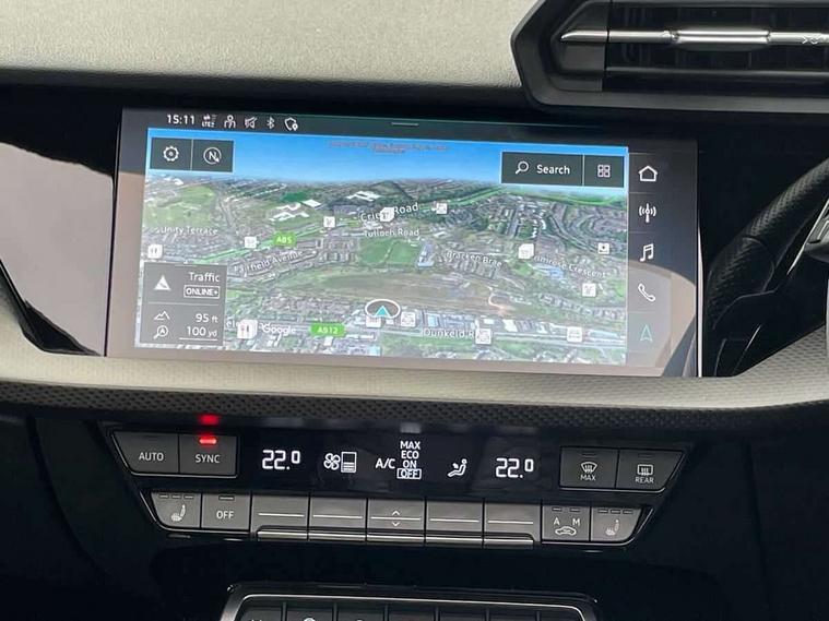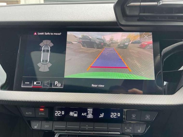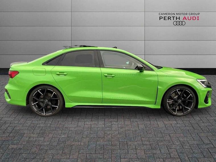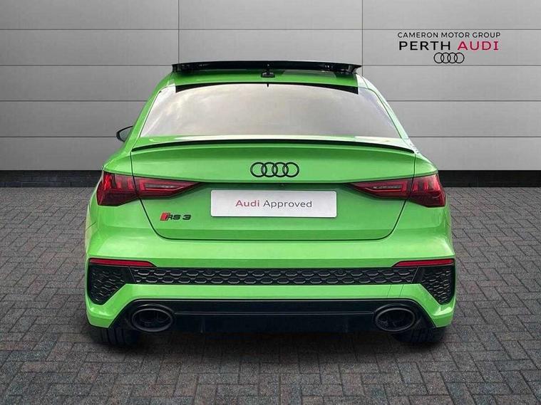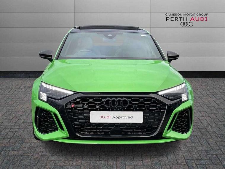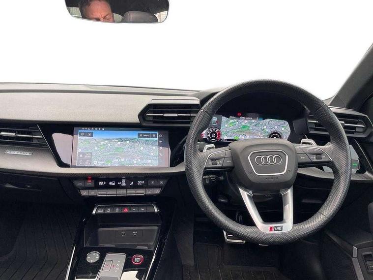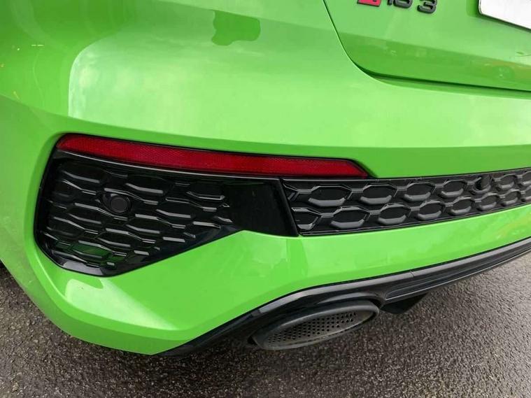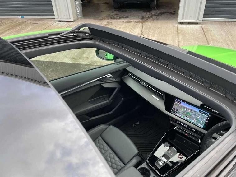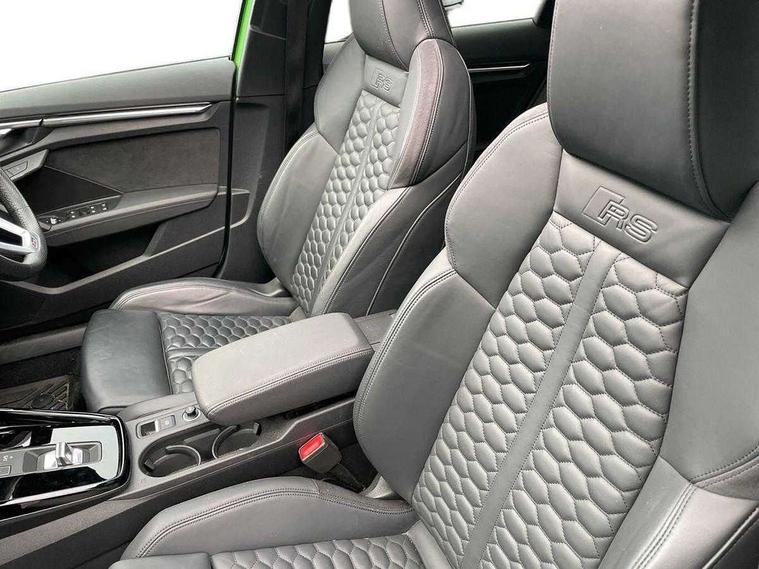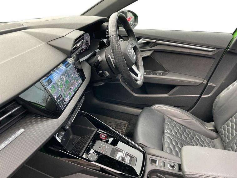 Audi smartphone interface, Audi virtual cockpit with RS specific display 12.3" full colour digital instrument cluster, Automatic start/stop system with recuperation, Bluetooth interface, Collision avoidance assistant, Emergency e-call, Head up Display, Lane departure warning system, Legal emergency call, Parking assist with parking system plus, Power operated tailgate - Luggage compartment lid opens electrically, Progressive power assisted steering, Reversing camera, Quattro permanent four wheel drive, Rear suspension, DAB Digital radio, 3rd brake light, Acoustic glass windscreen, Audi beam uses LEDs to project the Audi sport logo onto the ground as you exit your RS 3, Audi matrix LED headlights, LED rear lights, dynamic front and rear indicators and headlight cleaning system, Auto dimming rear view mirror, Black side skirts, Body colour roof, Carbon fibre engine cover, Electric adj heated/folding + auto dimming exterior mirrors with memory + LED indicator + auto kerb side function for passenger side exterior mirror, Front spoiler in high gloss black, Heat insulating glass windscreen, LED daytime running lights, Light and rain sensors, Panoramic glass sunroof, Privacy glass - dark tinted rear and rear side windows from B-pillar backwards, Rear boot, Rear side wing doors, RS exterior features in gloss black, RS sports exhaust system, 3 seat bench in 2nd row, 3 spoke leather multifunction steering wheel with gear shift paddles, 4 way lumbar support for front seats, 40/20/40 split folding rear seat bench, Black cloth headlining, Dual zone electronic climate control, Electrically adjustable front seats with memory function for driver's side, Front and rear headrests, Front centre armrest, Front sports seats RS embossed logo, Front/rear floor mats, Heated front seats, Honeycomb stitching and RS embossing, Illuminated door sill trims inlays in aluminium with RS 3 logo, RS emblems, Single front passenger seat, Stainless steel pedals and front footrest in black, Aluminium interior elements pack - RS3, Ambient lighting pack - RS3, Comfort and sound pack - RS3, Driver assistance pack with 3 spoke leather multi function steering wheel - RS3, MMI navigation plus with MMI touch - RS3, RS bodystyling - RS3, Storage Pack - RS3, 3x3 point rear seat belts, ABS/EBD, ASR, Audi pre sense front, Driver/Front Passenger airbags, EDL, ESC - Electronic Stability Control + traction control, Front passenger airbag deactivation, Front side airbags with head airbags and interaction airbag, Hill hold assist, Seat belt reminder with passenger presence detection in rear, Tyre pressure loss indicator, Warning triangle and first aid kit, Anti theft alarm, Anti-theft wheel bolts, Electronically operated child lock, Remote control central locking, Full decorative carbon trim, 19" 5 Y spoke black with graphic print alloy wheels, Tool kit, Tyre repair kit,