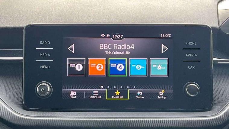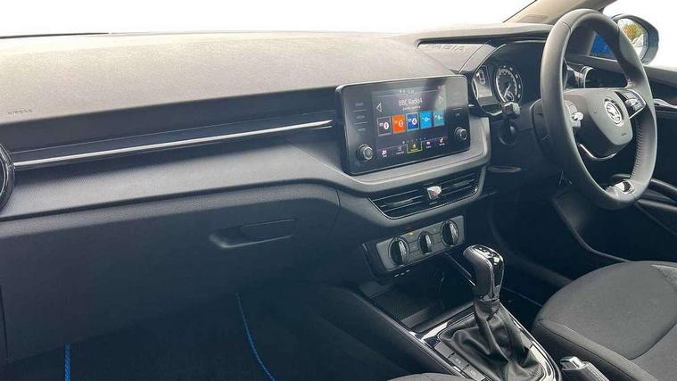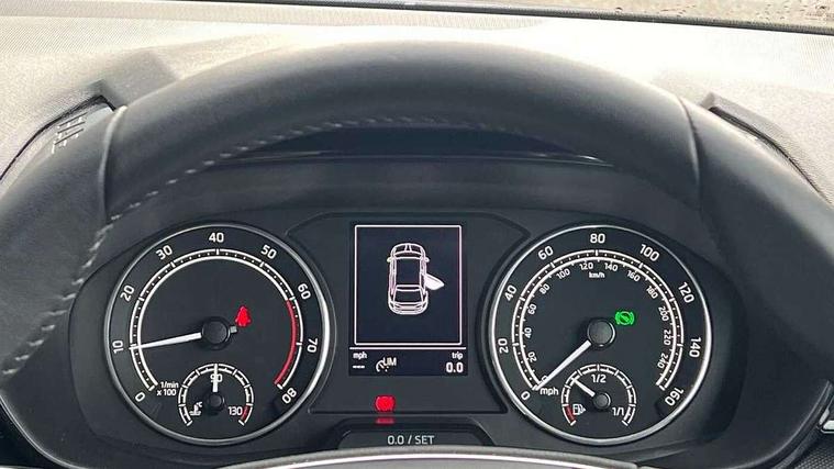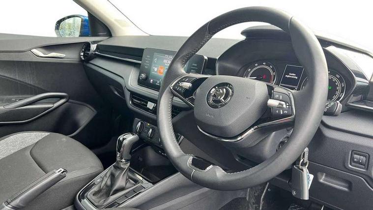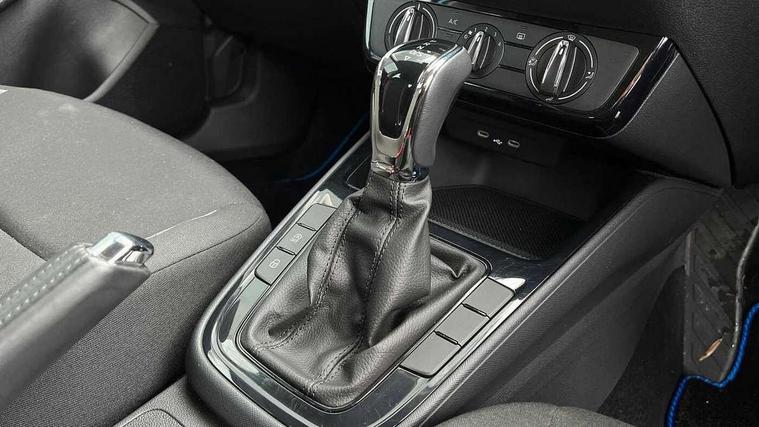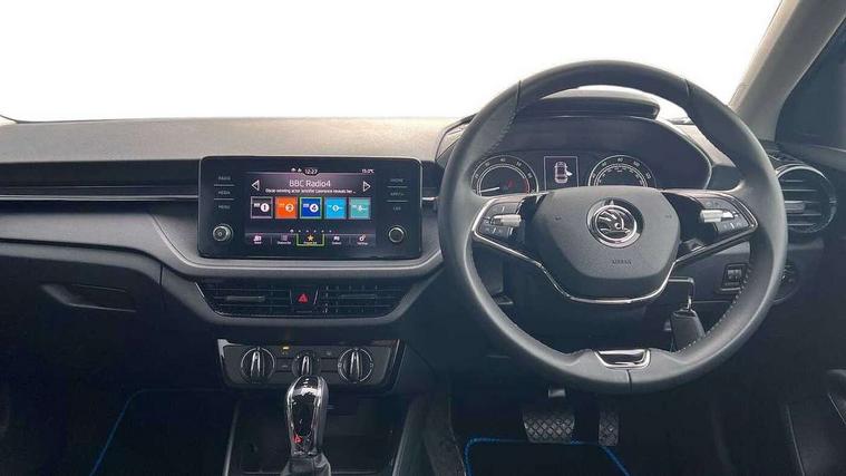 Bluetooth connection, Driver alert system - DAS, Electromechanical power steering, Exterior temperature gauge, Lane assist including road edge detection, Multifunction trip computer in black and white, Rear parking sensors, Service interval indicator, Speed limiter, 2x USB-C in the front (for data transmission and charging), 4 speakers in front, Auxiliary socket for external MP3 player, DAB digital radio reception, Radio Swing with 6.5" colour display, Basic LED Headlights, Basic rear lights, Body colour door mirrors, Body coloured bumpers, Dimming rear view mirror with black frame, Door mirror integrated indicators, Electrically adjustable and heated door mirrors, Electrically adjustable front windows with function auto up/down, Front fog lights, Front window wiper intermittent control, Headlight range control - Automatic, Ice scraper in fuel cap, LED daytime running lights with coming and leaving home feature, Mechanical adjustable rear windows, Rain sensor, Rear LED fog light, Rear side wing doors, Rear window wiper with washing nozzles, Roof mounted spoiler, SKODA tailgate lettering in chrome, Third brake light, 2 reading lights in front and 2 reading lights in rear, 2 spoke leather multifunction steering wheel, 3 rear headrests, Backrest split and folding, Central console with fixed cup holder and storage box, Chrome handbrake release button, Fabric upholstery, Gearshift knob/handle in leather, Grain satin black interior door handles, Hand brake lever handle in leather, Height adjustable front headrests, Height adjustable front seats, Height adjustable steering wheel, ISOFIX and TopTether anchorage points to the outer rear seats, ISOFIX and TopTether on the front passenger seat, Luggage compartment lighting, Manual air conditioning, Manually adjustable lumbar support in front seats, Pollen filter, Rear seat bench unsplit, Single front passenger seat, Storm grey headlining, Sun visors with mirror and airbag label on passenger side, Ticket holder, 3-point height adjustable front seats belts with pretensioner and force limiter, Automatic warning lights in case of crash, Driver and passengers airbag with switch off function, e-Call+, ESC including ABS, MSR, ASR, EDS, HBA and XDS, Front and rear seat belt warning, FRONT ASSIST (AEB City and AEB Inter Urban), Front side airbags, Head airbags, Hill hold assist, One tone horn, Pedestrian protection, Three rear 3-points safety seat belts with pretensioner and force limiter including stop function for outer rear seat belts, Tyre pressure monitoring system, Anti-theft alarm system including immobiliser, interior monitoring, backup horn, and towing protection, Central locking with radio remote control, interior controls, SAFE function and 2 foldable keys, Black painted air vents, Glossy black decorative trim, Grain satin black central console cover, Grain satin black lower decorative trim, Satin black door and side trim panel in front, Anti-theft wheel bolts protection, Super-low rolling resistance tyres,