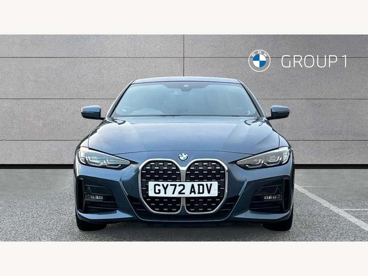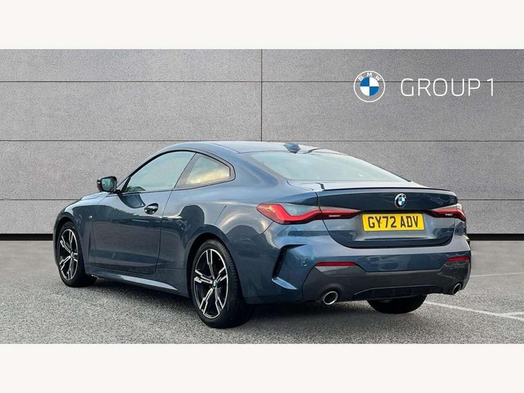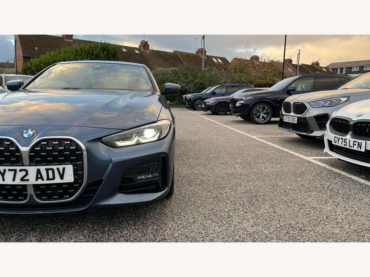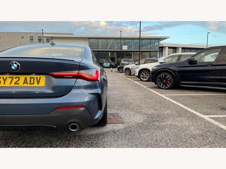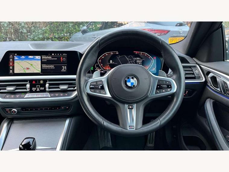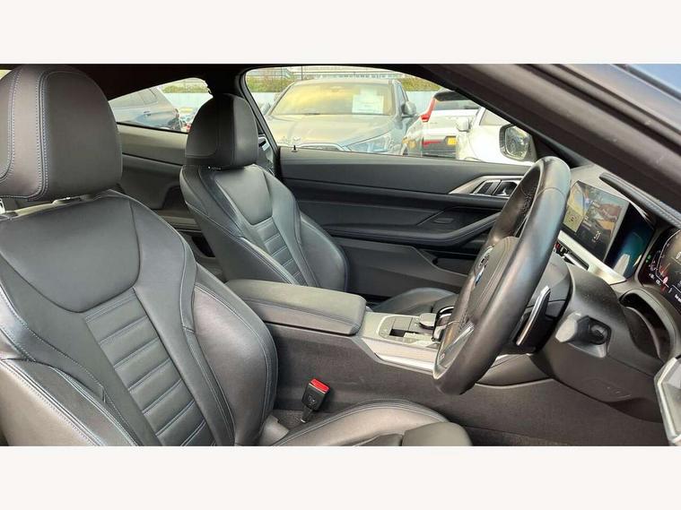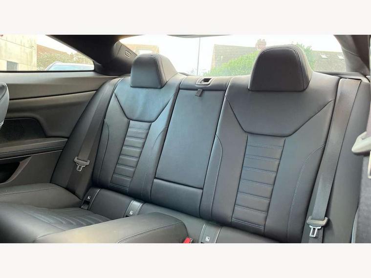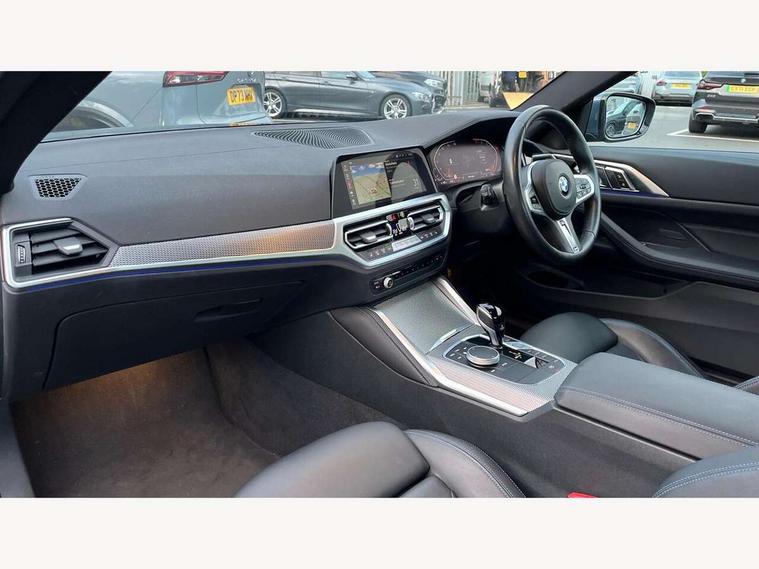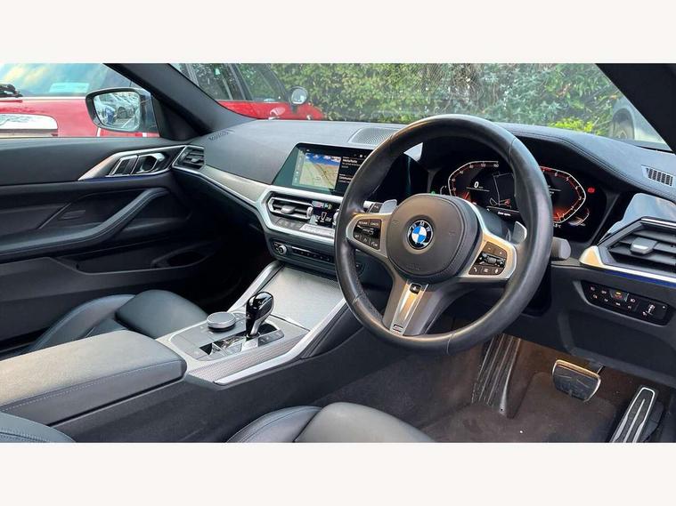 Active guard plus, Attentiveness assist, Auto start-stop, BMW ConnectedDrive online services, BMW iDrive controller on centre console, BMW Live Cockpit Professional Nav with 12.3" instrument display + 10.25" display, Intelligent Voice Assist, BMW OS 7, HDD, 2USB, 4G LTE connect, BMW service history, BMW Teleservices, Brake pad wear indicator in front and rear, Check Control warning system for monitoring of lights and door/luggage compartment open warning, Condition based service, Cruise control with speed limit function, Electric power steering with Servotronic steering optimised at all speed ranges, Gearshift time display in manual mode, Instrument cluster with speedometer with mph readout, tachometer, fuel gauge and oil temperature gauge, Integrated owners handbook, Oil sensor for level and grade, warning by check control system, On board computer - average speed, fuel consumption, outside temp display with acoustic warning, clock/date, service interval, odometer/trip meter, Optimum shift indicator, Run flat indicator, Shifting point display, Touch control functionality for BMW Live Cockpit Professional Nav, Variable sport steering, 8 speed automatic steptronic transmission with gearshift paddles, Balanced 50/50 weight distribution, Double joint spring strut front axle, Double VANOS, Drive performance control - ECO PRO, comfort and sport modes, High precision injection, Low centre of gravity, M sport suspension, Petrol Particulate Filter, Stroke dependent dampers, VALVETRONIC engine management, 2x USB Type C ports in front centre console for charging and data transfer, 2x USB Type C ports in rear centre console for charging, DAB tuner, Electronic service booklet, Acoustic glazing, Automatic headlight beam throw control with load dependent regulating reaction, dynamic compensation of braking dive and acceleration squat, Automatic windscreen wipers and automatic headlight, Automatically dimming electrochromatic rear view mirror, BMW emblem on engine compartment lid and tailgate, BMW kidney grille with mesh grille front side of the nuggets in matt aluminium and frame in chrome high gloss, Body colour fuel filler flap, Body colour roof fin, Brushed aluminium inserts in the front door sill finishers with BMW designation, Door sill strips, Dynamic brake lights, Electric windows - front and rear, with open/close fingertip control, anti trap facility and comfort closing function all round, Exterior mirrors - electrically folding with anti-dazzle, Fading support, Follow me home headlights, Front and rear bumper system, Front apron plastic in body colour, Green tinted heat protection glazing, High gloss shadow line exterior trim, Illuminated bow type door handles in body colour drivers side with door lock, Interior rear view electrochromatic mirror with automatic anti dazzle function, LED daytime running lights, LED front fog lights, LED front indicators, Licence plate panel integrated into front bumper and tailgate, Lightweight engineering, M designation on front side panels, left and right, M rear boot spoiler, Model designation on right side of tailgate, One piece front bumper cover including towing eye cover in body colour, Preparation for high beam assistant, Rear boot, Reversing light, Side frame decorative moulding black matt, Two part LED tailights in L-shape with components in smoked glass, brake light, LED turn indicator and rear fog light, Visible exhaust tailpipe finisher, Visible VIN plate, Welcome lights in interior and door handle area, Widened track and increased camber values for max transverse dynamics, agility and steering precision, Window recess cover black high gloss, Windscreen wipers with integrated heated washing jets, 12V power socket in front centre console, 2 front cupholder in centre console with clamping elements and matt black inlay, 2 Rear seat headrests, 2 seat bench in second row, 3 spoke M sport leather multifunction steering wheel, 3 zone automatic air conditioning, 4 pieces lashing eyelets in luggage compartment, 40:20:40 split folding rear seat and rear centre armrest with two cupholders, Anthracite headlining, Armrest integrated in front and rear door trim + front centre console armrest, BMW ID, Driver seat backrest width adjustment, Four grab handles integrated in roof lining, Front and rear door pockets, Front and rear reading lights, Front sport seats, Heated driver and front passenger seats, Height adjustable front headrests, Height adjustable mechanically and infinitely variable steering column, Illuminated armrest storage compartment, Illuminated glove compartment with separate small compartment, Make-up mirror lights, Single front passenger seat, Storage compartment in rear centre console, Sunvisors with illuminated vanity mirrors and ticket pocket, Toolkit located in luggage compartment, Velour front floor mats, Vernasca leather upholstery, Ambient lighting pack - 4 Series, Connected professional pack - 4 Series, M sport exterior styling pack - 4 Series, 2 x 3-point rear seatbelts, Battery safety cut-off, BMW emergency call, Brake energy regeneration, Braking pre-tensioning, Child seat ISOFIX attachment for the two outer rear seats, Coasting in idle in ECO PRO mode, Cornering brake control (CBC), Crash sensor activating of airbags, Unlocking doors, hazard warning lights, interior light, safety battery terminal, Driver and front passenger side airbags, integrated in the door side seat backrest bolsters for all seat variants, Driver/Front Passenger airbags, Dry braking, Dynamic brake control, Dynamic stability control + (DSC+) - Anti-lock Braking System (ABS) with brake assist and cornering brake control + Automatic Stability Control (ASC), Dynamic Traction Control - DTC, Electric parking brake including automatic hold function and automatic release of the parking brake when driving off, Electronic differential lock control (EDLC), Front and rear ventilated brake disc, Front passenger manual airbag deactivation, Head airbags for all 4 outer seats, Hil