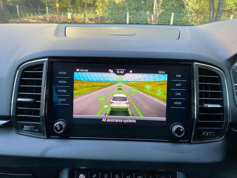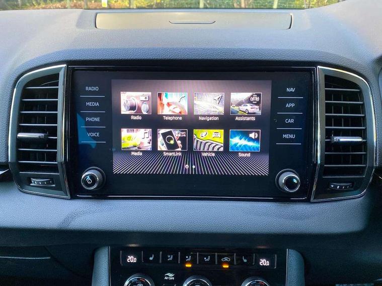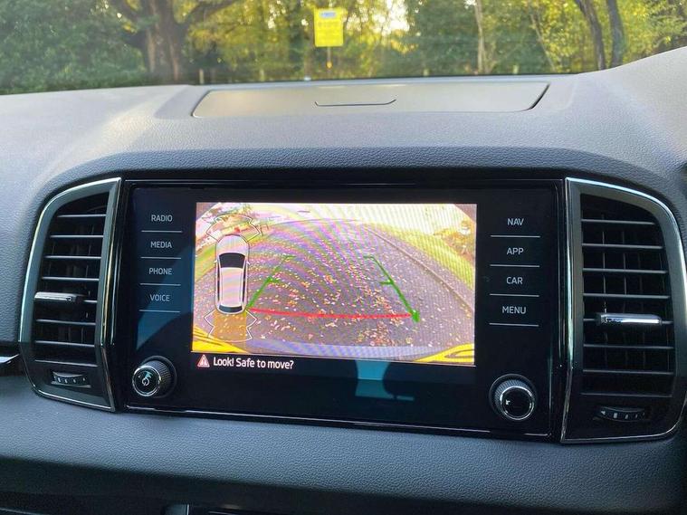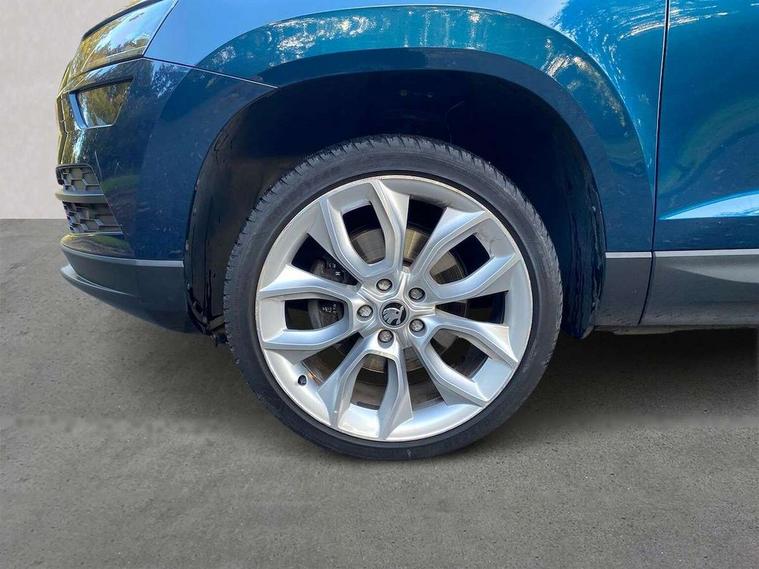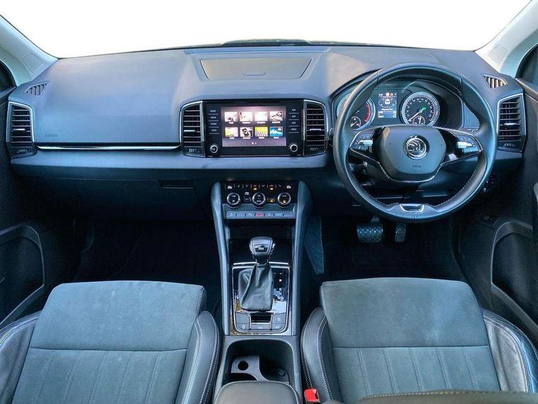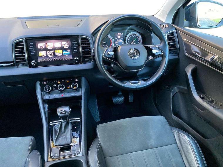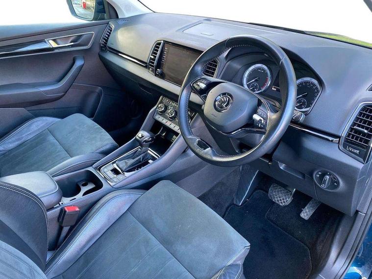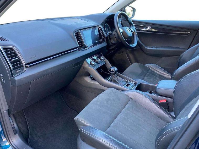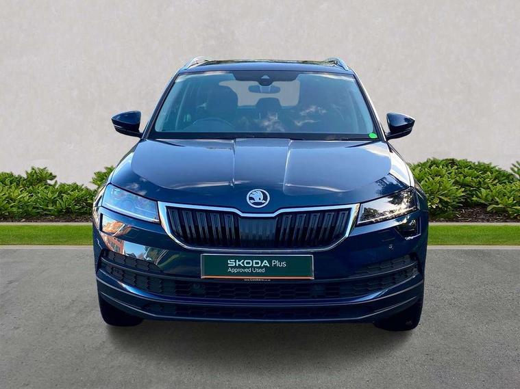 Care connect, Drive mode selector, Driver alert system, Driver fatigue sensor, Driver profile selection, Multifunction colour trip computer, Outside temperature gauge, Rear view camera, Service interval indicator, SmartLink + wireless for Apple and wired for Android, Start/stop system with regenerative braking, USB C Port x 2 in front centre console, DAB radio with Bluetooth, SD card slot, USB connection, Acoustic glass, Aero front windscreen wipers with intermittent function, Automatic headlight control system, Black electric window control buttons, Body colour door mirrors and handles, Body coloured bumpers, Electric front and rear windows with child proof lock, Full LED headlights + adaptive front light system + LED daytime running lights and front cornering fog lights, Headlight washers, Heated rear windscreen, LED rear lights with high functionality, Light assistant (coming/leaving home/tunnel light), Privacy glass, Safety reflectors on front doors, Third brake light, 1.5 litre bottle holders in driver and front passenger door panels, 12V socket in boot, 12v socket in front centre armrest with storage compartment and rear air vents, 2 Folding hooks and nets in boot, 2 Front readings lights for driver and passenger, 3 rear height adjustable headrests, 4 foldable roof handles with rear coat hooks, 4 lashing points on luggage floor, Backrest release, Cargo elements in boot, Chrome inner door handles, Folding tables on the front seat backrests, Front head restraints, Front seat and rear pockets, Height adjustable front three point seats belts with tensioners, Height adjustable passenger seat, Height/reach adjust steering wheel, Ice scraper, Illuminated and cooled glovebox, Illuminated luggage compartment, Isofix child seat preparation outer rear, Net programme in boot, Pen holder, Pollen filter, Rear boot cover, Rear reading lights, Rear seats fixed folding and divided 60:40, Retractable parcel shelf attachable to tailgate, Safety vest holder, Storage box in upper central dashboard closed, Storage compartment below the passenger seat, Sunvisors with illuminated vanity mirrors, Textile floor mats, Umbrella under passenger seat, VarioFlex seats with retractable parcel shelf, Chrome roof rails + chrome pack - Karoq, Airbags - Front side, head, knee and curtain, Automatic door unlocking in case of crash, Automatic fuel cut off in case of crash, Driver airbag, Electronic parking brake with auto hold function, Emergency rear braking signal, ESC including ABS, MSR, ASR, EDS, HBA, DSR, RBS, MKB and traction control, Front assist radar scanning of the space in front of the car with automatic braking, Hill hold control, Passenger airbag with switch-off function, Pedestrian monitor, Seatbelt reminder signalisation and pretensioner for all seats, Three point seatbelts rear, Two tone horn, Tyre pressure display, Tyre pressure monitor, Alarm with interior monitoring, back up horn and tilt sensor with safe function, Electronic engine immobiliser, Keyless entry and keyless start with safe system, Remote central locking with 2 remote folding keys, Chrome framed air vents, 19" Crater alloy wheels with anti theft wheel bolts, Storage on wheel cover,