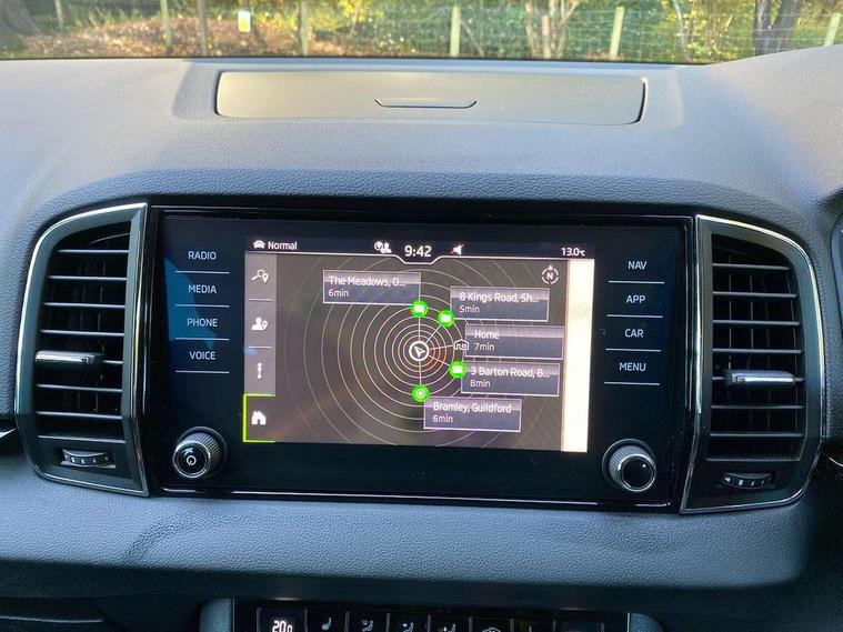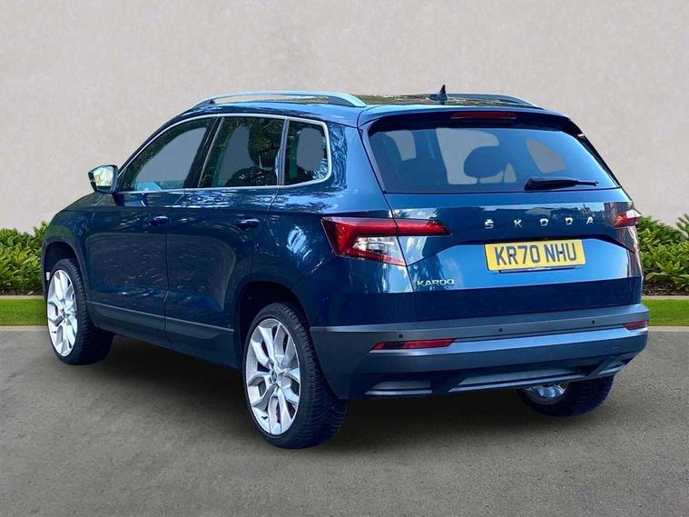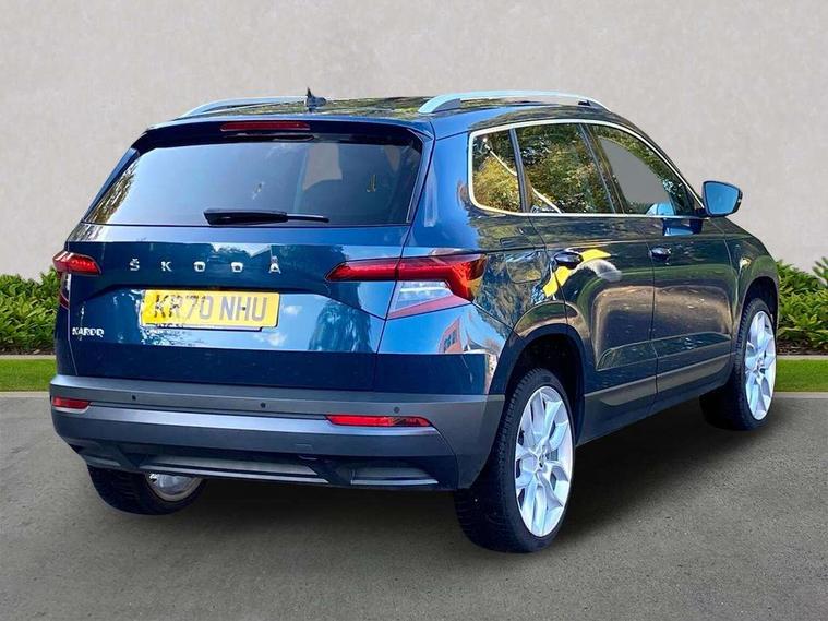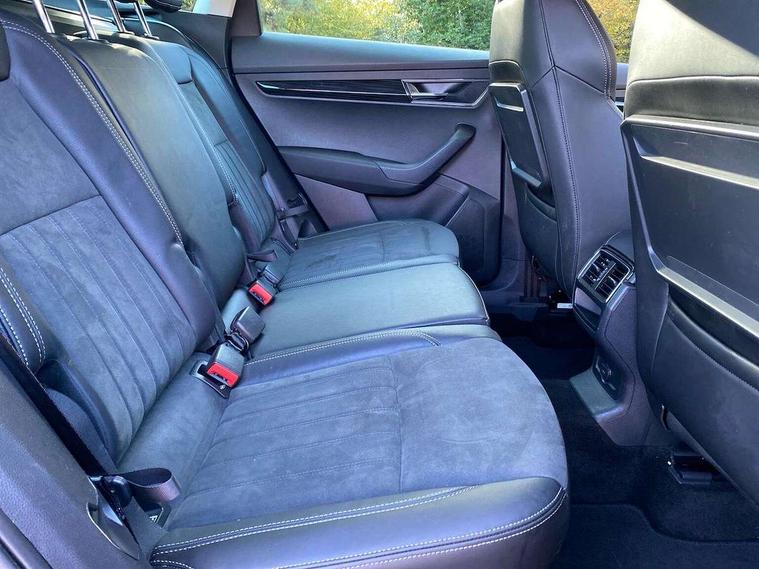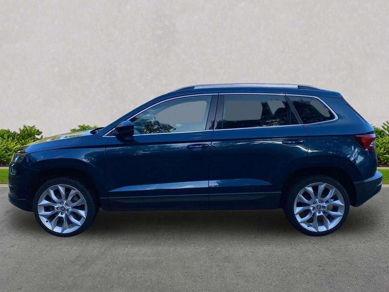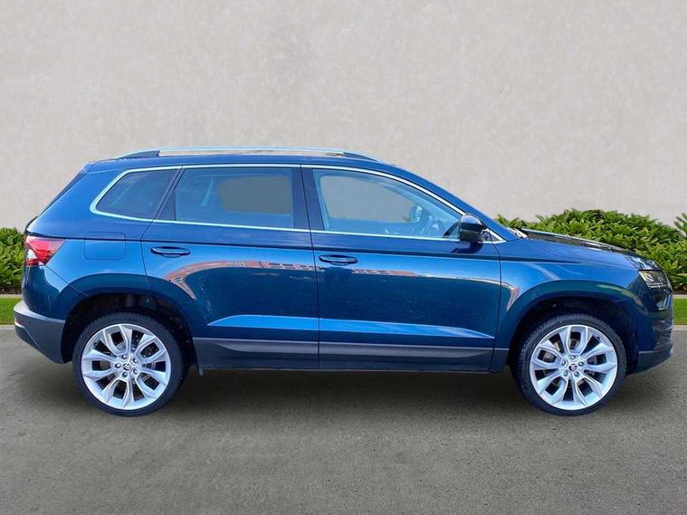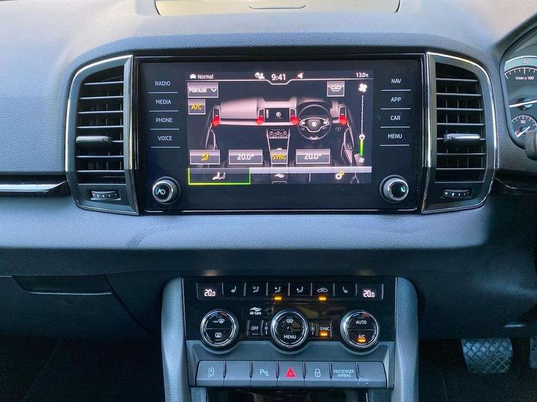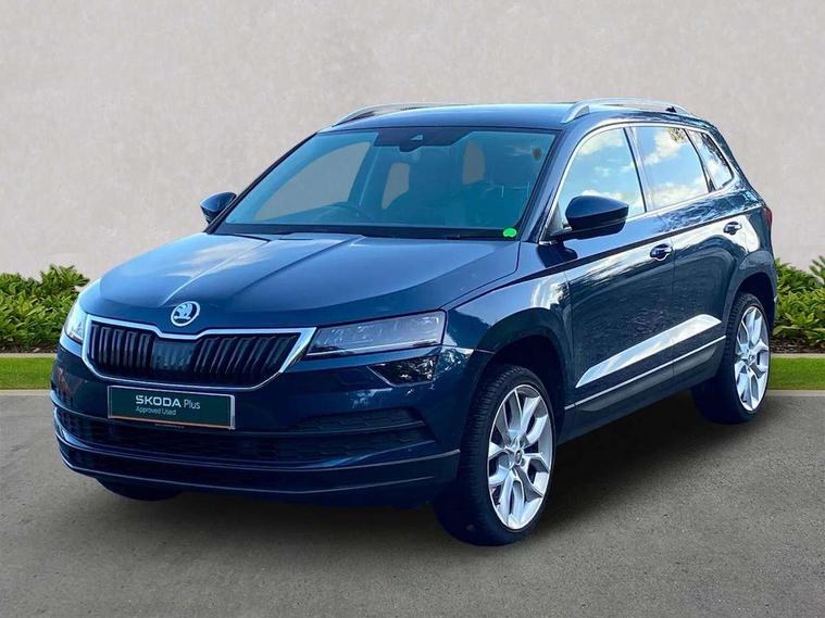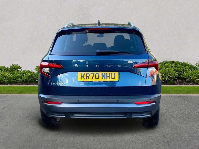 Care connect, Drive mode selector, Driver alert system, Driver fatigue sensor, Driver profile selection, Multifunction colour trip computer, Outside temperature gauge, Rear view camera, Service interval indicator, SmartLink + wireless for Apple and wired for Android, Start/stop system with regenerative braking, USB C Port x 2 in front centre console, DAB radio with Bluetooth, SD card slot, USB connection, Acoustic glass, Aero front windscreen wipers with intermittent function, Automatic headlight control system, Black electric window control buttons, Body colour door mirrors and handles, Body coloured bumpers, Electric front and rear windows with child proof lock, Full LED headlights + adaptive front light system + LED daytime running lights and front cornering fog lights, Headlight washers, Heated rear windscreen, LED rear lights with high functionality, Light assistant (coming/leaving home/tunnel light), Privacy glass, Safety reflectors on front doors, Third brake light, 1.5 litre bottle holders in driver and front passenger door panels, 12V socket in boot, 12v socket in front centre armrest with storage compartment and rear air vents, 2 Folding hooks and nets in boot, 2 Front readings lights for driver and passenger, 3 rear height adjustable headrests, 4 foldable roof handles with rear coat hooks, 4 lashing points on luggage floor, Backrest release, Cargo elements in boot, Chrome inner door handles, Folding tables on the front seat backrests, Front head restraints, Front seat and rear pockets, Height adjustable front three point seats belts with tensioners, Height adjustable passenger seat, Height/reach adjust steering wheel, Ice scraper, Illuminated and cooled glovebox, Illuminated luggage compartment, Isofix child seat preparation outer rear, Net programme in boot, Pen holder, Pollen filter, Rear boot cover, Rear reading lights, Rear seats fixed folding and divided 60:40, Retractable parcel shelf attachable to tailgate, Safety vest holder, Storage box in upper central dashboard closed, Storage compartment below the passenger seat, Sunvisors with illuminated vanity mirrors, Textile floor mats, Umbrella under passenger seat, VarioFlex seats with retractable parcel shelf, Chrome roof rails + chrome pack - Karoq, Airbags - Front side, head, knee and curtain, Automatic door unlocking in case of crash, Automatic fuel cut off in case of crash, Driver airbag, Electronic parking brake with auto hold function, Emergency rear braking signal, ESC including ABS, MSR, ASR, EDS, HBA, DSR, RBS, MKB and traction control, Front assist radar scanning of the space in front of the car with automatic braking, Hill hold control, Passenger airbag with switch-off function, Pedestrian monitor, Seatbelt reminder signalisation and pretensioner for all seats, Three point seatbelts rear, Two tone horn, Tyre pressure display, Tyre pressure monitor, Alarm with interior monitoring, back up horn and tilt sensor with safe function, Electronic engine immobiliser, Keyless entry and keyless start with safe system, Remote central locking with 2 remote folding keys, Chrome framed air vents, 19" Crater alloy wheels with anti theft wheel bolts, Storage on wheel cover,