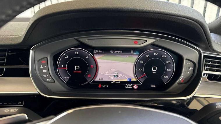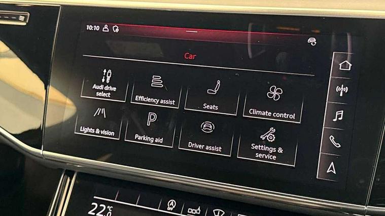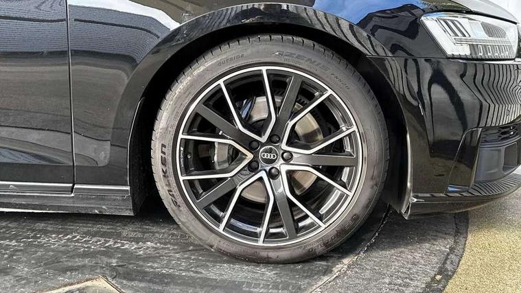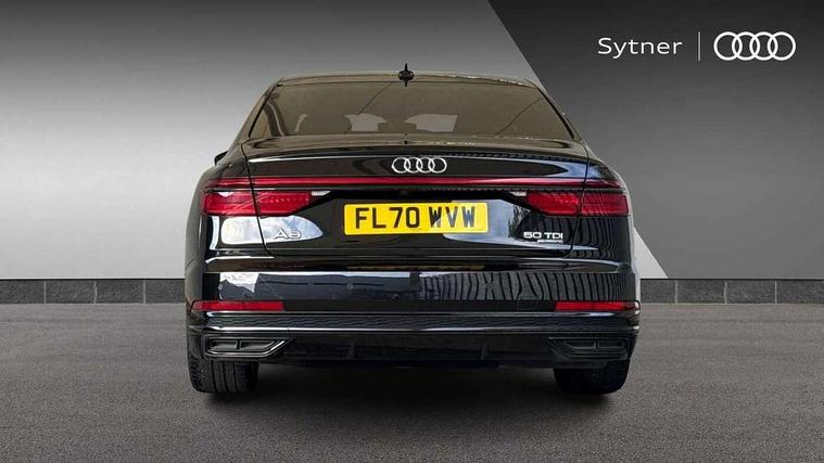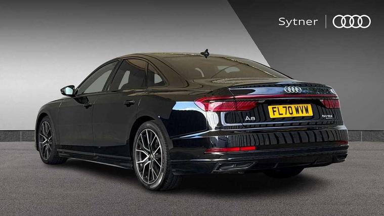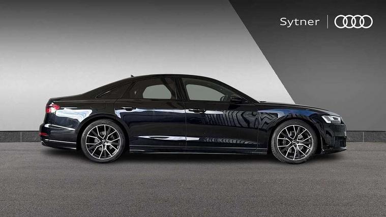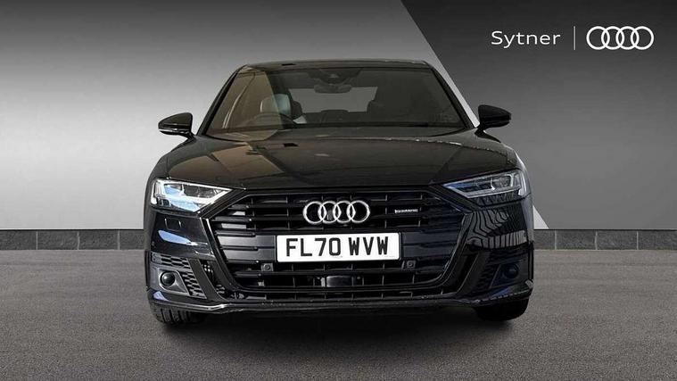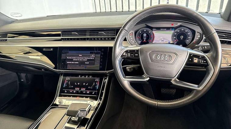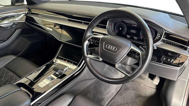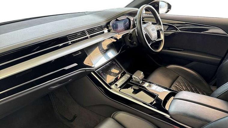 'Lights On' Reminder warning buzzer, Adaptive cruise control with speed limiter, Audi connect safety and service (e-call), Audi drive select, Audi parking system plus with front and rear sensors, Audi phone box with wireless charging, Audi virtual cockpit, Audi wireless smartphone interface, Camera based traffic sign recognition, Colour driver's information system display, Electro - mechanical power assisted steering, Head up Display, Lane departure warning including emergency assist, MMI navigation plus with MMI touch + Twin touch screens with haptic feedback, Operating buttons in black, glass look with haptic feedback including extended aluminium look, Power door closure, Power operated tailgate, Rear view camera, Remote fuel filler release, Service interval indicator, 24 litre AdBlue tank, 48V Mild hybrid technology, 8 speed transmission with hill hold assist, Adaptive air suspension, Diesel particulate filter, Quattro all wheel drive with self locking centre differential, Audi music interface, Audi sound system, DAB digital radio module, DVD System, Premium MMI radio plus, USB connection, Acoustic double glazing, Audi space frame, Auto dimming rear view mirror, Automatic headlight control system, Body colour bumpers, Body colour door handles, Body colour side protection with aluminium trim strips, Electric front windows, Electric rear windows with isolation switch, Electrically adjustable heated folding + automatically dimming exterior mirrors with memory function and integrated LED indicators, HD matrix healights with LED rear lights + dynamic rear indicators, Heat insulating darkened glass in side and rear windows, Heated rear window, Heated windscreen washer jets, High beam assist, LED brake lights, LED daytime running lights, Privacy glass, Reverse activated kerb-view adjustment on passenger's door mirror, Side skirts, Sports bumpers, 2 zone automatic air conditioning, 3 seat rear bench with centre armrest in 2nd row, 3 seater rear seat system, 4 way electric lumbar support for driver and front passenger, Centre console with cupholders, Climate controlled seats, Comfort centre armrest, Door armrest with storage, Door pockets with bottle holder, Driver and front passenger side sunvisors with illuminated vanity mirrors, Dust/pollen filters, Electric adj front seatbelt height + memory, Electric auxiliary air heater, Electric front seats with memory function, Front/rear floor mats, Glove compartment cooling, Heated front seats, Height/reach electric steering column with easy exit function, Isofix child seat mounting points on outer rear seats, Leather gearknob, Passenger footwell storage net, Reading lights, Rear headrests, Roof mounted sunglasses holder, Twin spoke leather multifunction steering wheel with gearshift paddles, Valcona leather upholstery with front sports seats in diamond quilted with S embossed logo, Black exterior styling pack - A8, Connect package plus - A8, High gloss styling pack - A8, LED ambient interior lighting pack - A8, 3 point seatbelts on all rear seats, ABS/EBD, Active front headrest system, ASR traction control, Audi pre sense basic, Audi pre sense front, Driver/Front Passenger airbags, EDL traction control, Electromechanical parking brake, ESP, Extended pedestrian protection measures, Front and rear side airbags with head airbag system, Front brake discs, callipers painted black, Front passenger airbag deactivation, Rear brake discs, callipers painted black, Rear child proof door locks, Seatbelt reminder + electric contact in buckle + advanced safety equipment, Tyre pressure warning light, Warning triangle and first aid kit, Advanced key, Anti theft alarm tow away protection, Anti-theft wheel bolts and wheel loosening detection, Locking wheel bolts, Remote central locking, Dark matt brushed aluminium lower inlays, Piano black finish upper inlays,