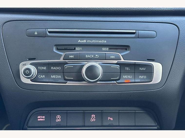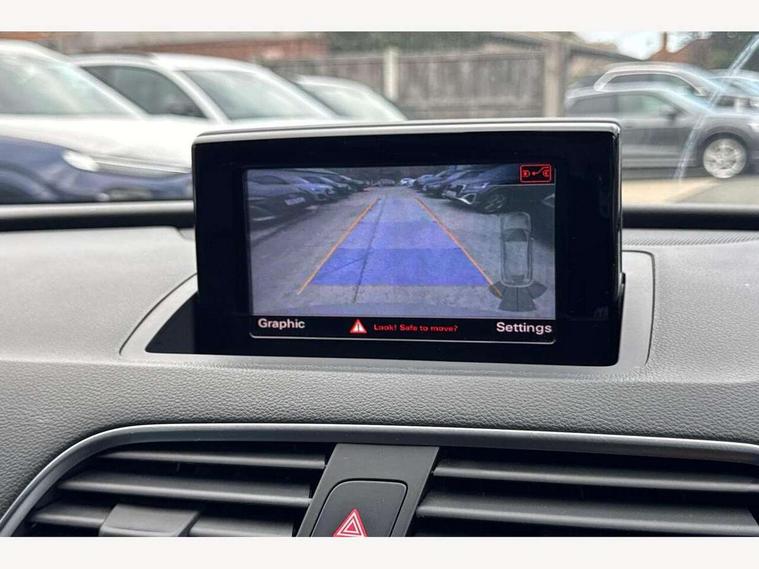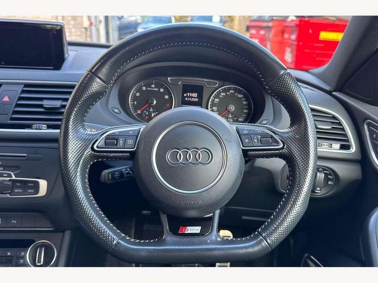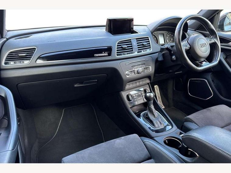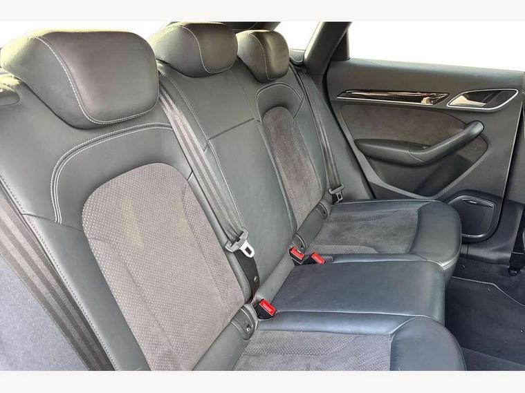6.5" colour display screen, Audi drive select, Cruise control, Electro-mechanical PAS, Low washer fluid indicator, MMI - Multi Media Interface control system, On board computer, Remote electric boot opening/closing, Service interval indicator, Voice control system, Sports suspension, Audi music interface, BOSE sound system, DAB digital radio module, Acoustic windscreen, Aluminium window surround, Auto dimming rear view mirror, Black exhaust tailpipes, Black high gloss door mirrors, Black roof rails, Coming home function, Door mirror integrated indicators, Front and rear electric windows, Front fog lights, Front lip spoiler, Heated windscreen washer jets, High Gloss Black Contrast Bumpers, High Gloss Black rear spoiler, LED daytime running lights, LED headlights with headlight washers, LED rear lights, Light and rain sensor for auto activation of lights and windscreen wipers, Loading sill protector in stainless steel, Privacy glass, Rear diffuser with platinum insert, Rear wiper, S Line body styling, Sunband for windscreen, 12V socket in rear centre console, 3 spoke flat bottom multi-function perforated leather steering wheel with contrast stitching and aluminium gearshift paddles, Aluminium door sill trims, Aluminium gear knob, Black cloth headlining, Door sill trim strips, Dual zone climate control, Electric front lumbar adjustment, Front and rear headrests, Front and rear velour floor mats, Front centre armrest with storage compartment and angle adjustment, Front sports seats, Height/reach adjust steering wheel, ISOFIX on front passenger and rear outer seats, Jack and tool kit, Retractable luggage cover, Reversible boot floor, Split fold rear seat, Stainless steel pedals, Storage compartment and 12V socket, Under floor storage in luggage area, Audi Exclusive black styling pack - Q3, LED interior light pack - Q3, 3x3 point rear seatbelts, ABS+Electronic Brake force Distribution, Curtain airbags, Driver and passenger airbags, Driver and passenger side airbags, EDL + ASR, Electrically operated child locks on rear doors, Electromechanical parking brake, ESP, First aid kit, Front passenger airbag deactivation, Head airbags, Seatbelt warning light, Tyre pressure monitoring system, Warning triangle, Locking wheel bolts, Remote central locking, Thatcham category 1 alarm + immobiliser, Piano black finish inlay,