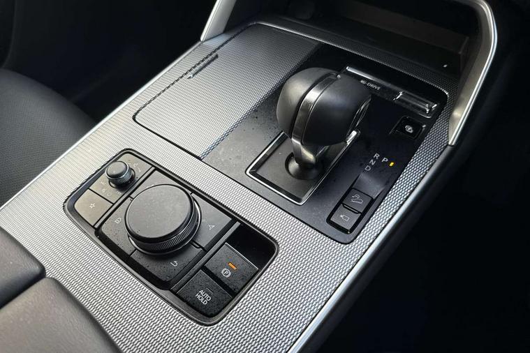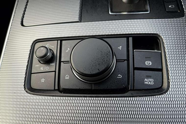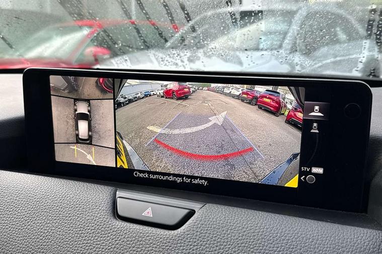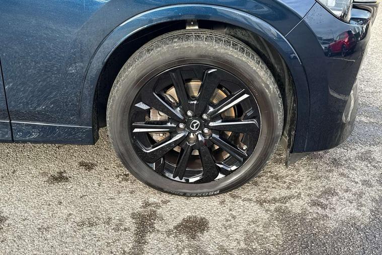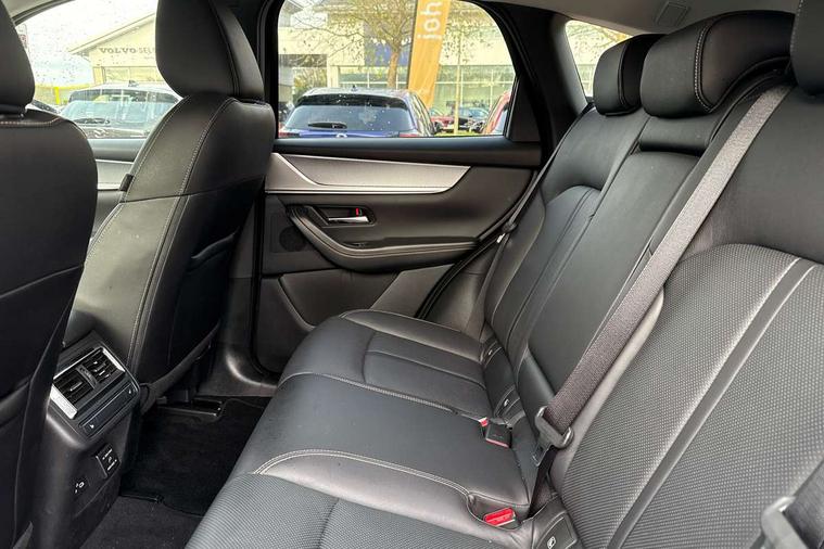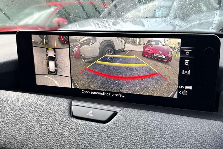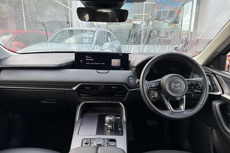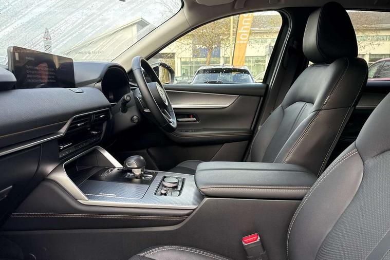 Emergency lane keeping with blind spot assist, Low washer fluid warning light, 12.3" Colour entertainment centre display with mazda connect infotainment, 12.3" TFT Colour display, Adjustable speed limiter, Black faux leather vinyl dashboard with titanium piping, Blind spot assist, Blind spot monitoring with rear cross traffic alert, Distance alert system, Driver attention alert system, Driver Monitoring with personal identification, E-call with GPS, Emergency stop signalling system, Exit warning function, Front and rear parking sensors, Ingress / Egress support and automatic driver position guide, Integrated bluetooth, Intelligent speed assist, Kinematic posture control, Lane keep assist system (LAS) with Lane departure warning system (LDWS), Mazda Driver Personalisation System, Mazda Navigation System with european mapping, Multimedia Commander, PAS, Power lift gate with handsfree function, Power start/stop button, Reversing camera with static guide lines, Speed alert, Traffic sign recognition, Trip computer, Windscreen projected colour active driving display, Wireless apple car play/android Auto, Type 2 Mode 2 cable for AC charging via UK 3-pin plug, 7.2 kw On board Charger, Mi-Drive (Normal, Sport, Off-road, Towing and EV mode), Paddle shift, Type 2 Mode 3 cable for AC charging via home or public charge points, AM/FM and DAB radio, Bose surround sound system with 12 Speaker, Bose center point, Bass match and audio pilot technology, Steering wheel mounted audio/bluetooth controls, USB-C inputs (x2 front and x2 rear), Auto dimming driver's door mirror, Automatic headlight levelling, B-pillar and C-pillar garnishes in gloss black finish, Body colour roof spoiler, Body coloured bumpers, Body coloured wheel arch and side mouldings, Coming/leaving home lighting function, Dark plated headlight lense, Dark plating finish signature wing in front grille, Dark plating front side garnish, Differentiated front bumper design to accentuate the intake, Dusk sensing headlights, Electric front/rear windows with one touch auto up/down, Electrically adjustable, heated auto power folding door mirrors with memory, Frameless auto dimming interior rear view mirror, Front kodo turn signal, Front wiper de-icer, Gloss black door mirrors, Headlight washers, High beam control, Honeycomb radiator grille in gloss black, LED 3rd brake light, LED rear signature combination lamps, Rain sensing front wipers with adjustable sensitivity and speed, Rear side wing doors, Rear wiper, Roof pillars and roof lining finished in lighter colour to soften the overall look, Signature LED daytime running lights, Silver decoration panel, 12v power outlet - front, 12V socket in boot, 3 height adjustable rear headrests, 3 seat bench in 2nd row, 40/20/40 split folding rear seats with quick levers in the boot, Ambient lighting, Cargo net, Chrome interior trim accents with steering wheel centre bezel, surround of engine start / stop button and glove box handle, Door panel trim vinyl leather with armrest, Driver and front passenger two rear grab handles with rear coat hooks, Driver and front passenger visors with covered vanity mirror and driver ticket holder, Driver seat electric tilt, slide, recline, height and lumbar adjustment, Driver, front passenger and two rear door pockets, Driver/passenger front seatback pockets, Dual zone climate control air conditioning with rear air vents, Electric telescopic and tilt adjustment steering wheel, Folding rear centre armrest with two cup holders, Front centre storage with two cupholders, Front down lamp with front and rear foot lamps, Front headrests, Front passengers seat electric slide, recline, height and lumbar adjustment, Front seat ventilation with 3-stage setting, Glovebox illumination, Heated front seats with 3 stage setting, Heated leather wrapped steering wheel, Heated outer rear seats with 3-stage setting, ISOFIX child seat anchorage points attached on outer rear seats, Karakuri tonneau cover, Leather upholstery, Leather wrapped gear shift knob, LED illumination luggage compartment, Practical and spacious front centre armrest storage, Rear seat recline function for rear passenger comfort, Remote fold down rear seats, Roof mounted sunglasses holder, Single front passenger seat, 3 point ELR front seat belts x2 with pretensioners, 3 point ELR rear seat belts, Active bonnet, Anti-lock braking system (ABS), Drivers knee airbag, DSC - Dynamic Stability Control, Electronic parking brake with auto disengage function and auto hold function, Front and rear curtain airbags, Front dual stage driver and single stage front passenger airbags, Front passenger airbag cut-off switch, Front side airbags, Front smart city brake support, Hill decent control, Hill launch assist, Manual rear child locks, Seatbelt reminder for driver/front passenger and rear seats, Traction control, Tyre pressure monitoring system (TPMS), Remote central locking with deadlocking and automatic door lock when driving, Smart keyless entry, Thatcham accredited alarm and immobiliser, Black centre console panel, Dashboard panel - Black Vinyl, 20" Black metallic alloy wheels, Emergency tyre repair kit,