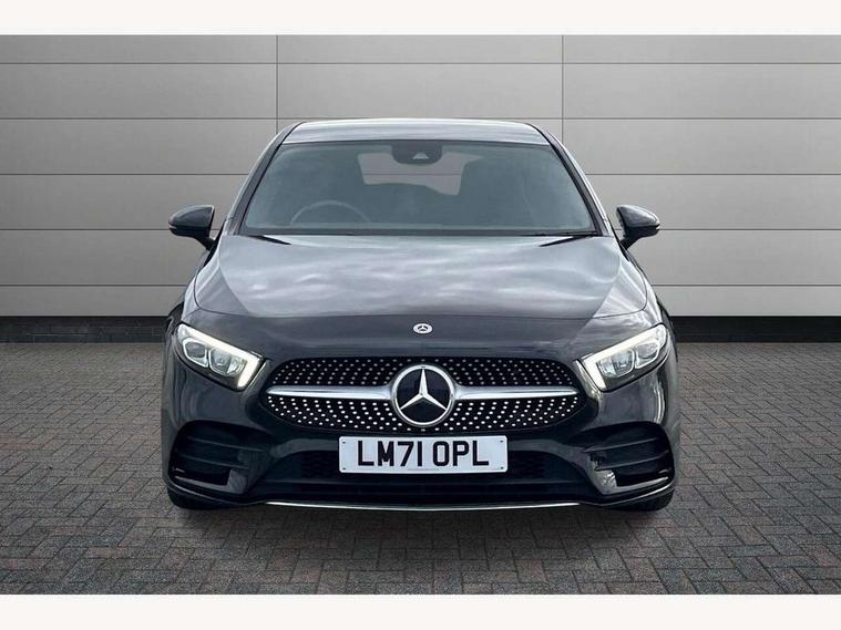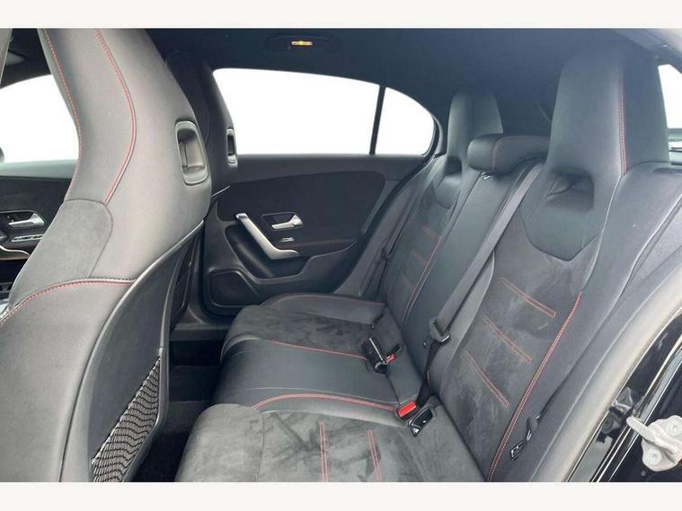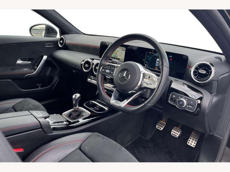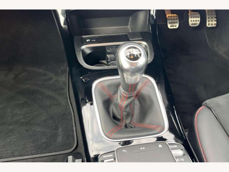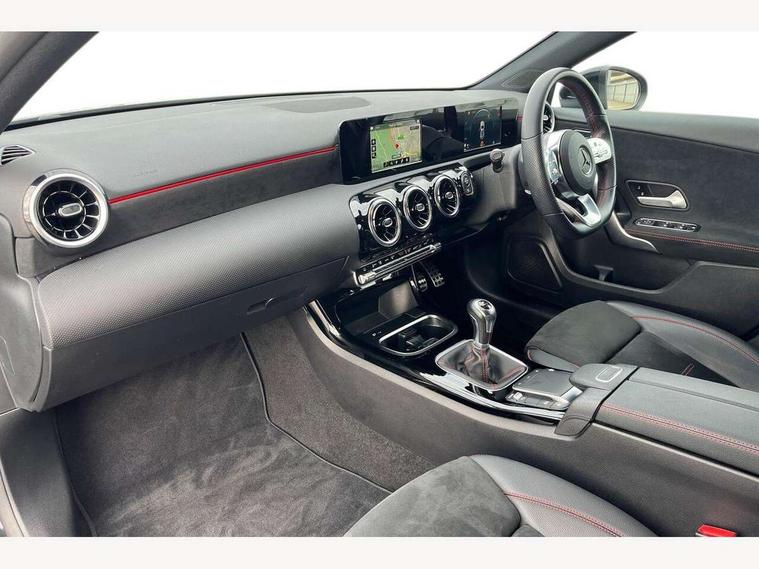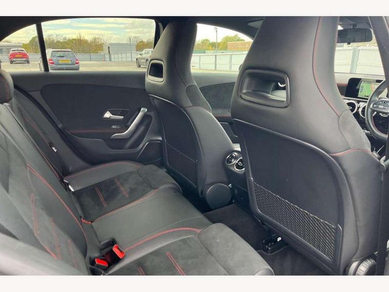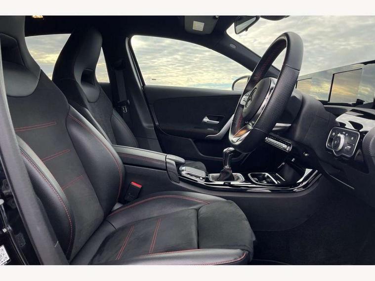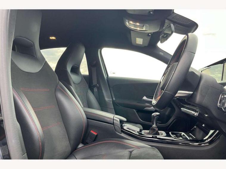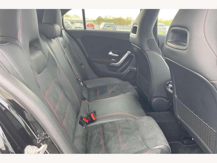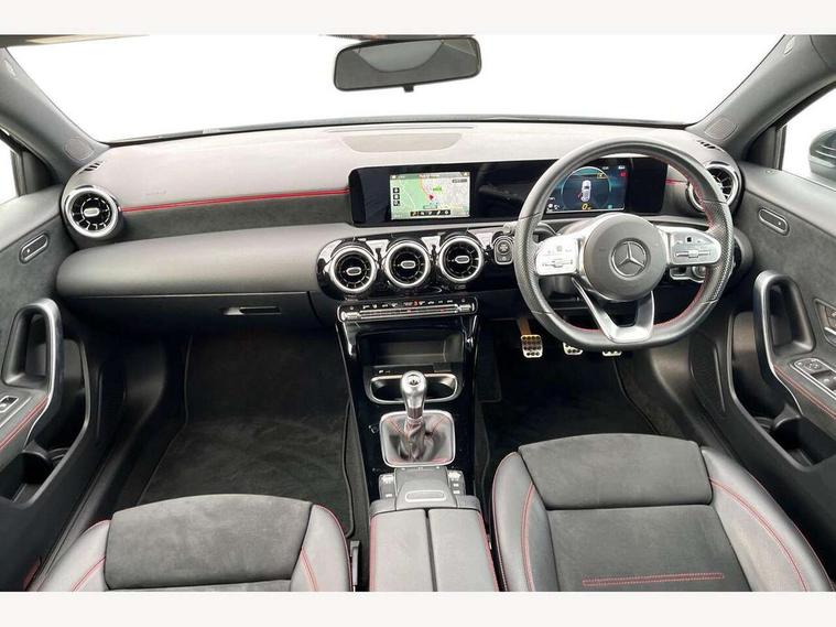 180 degree rear view camera with parking guidelines, 7" colour screen in instrument panel, 7" touchscreen media display, Attention assist, Brake pad wear indicator warning light, Car wash mode, Cruise control + speed limiter, Direct steering, Dual bluetooth interfaces, DYNAMIC SELECT with a choice of driving modes (ECO, Comfort, Sport and Individual), ECO start/stop function, Fluid level warning indicator for fuel, oil, coolant and washer fluid, Hard-disk navigation, Hey Mercedes Voice activation, Lamp failure indicator, Mercedes me connect including emergency call system, accident recovery, breakdown and maintenance management, Mercedes me remote services, Outside temperature gauge, Owners manual in English, Pre-installation for private car sharing, Preinstallation for Mercedes Benz link, Service indicator (ASSYST), Speed sensitive power steering, Trip computer, Lowered comfort suspension, Rear axle torsion beam, 2 USB ports (type C) in rear stowage compartment and one in front of center console, 6 speakers, DAB Digital radio, MBUX multimedia system with DAB digital radio and touchpad including satellite navigation, Mercedes-Benz sound system - 100W, 4 Electric Front and Rear windows, Adaptive brake lights, AMG bodystyling - Front apron with splitter in chrome, rear apron with chrome trim and chrome visible trim elements in tailpipe, Black weather strip, Body colour bumpers, Body colour door handles, Body colour side skirt, Body coloured door mirrors, Chrome beltline trim, Diamond radiator grille with chrome pins and silver louvre + chrome insert, Electric adjustable and heated door mirrors with integrated LED side indicators, Exhaust system - Twin visible tailpipes in polished stainless steel, Headlamp assist automatic headlamp activation, Heated glass rear windscreen + timer control, LED high performance headlamps with integrated LED daytime running lights, LED tail lamp, LED third brake light, Privacy glass, Radio aerial, Rain sensing windscreen wipers with two sensitivity settings, Rear fog lights, Rear wiper, Window line trim strip in chrome, 3 Spoke flat bottom leather multi function steering wheel with perforated leather in grip area, 40:20:40 split folding rear seats, Artico man-made leather/Microfibre Dinamica upholstery with red contrast stitching, Auto Mercedes-Benz child seat recognition sensor, Black air vents with surround in silver chrome, Black roof lining, Brushed stainless steel sports pedals with rubber studs, Controller on centre console with chrome surround, Floor mats with stitched edging and AMG lettering, Front centre armrest with storage compartment, Front door sills with Mercedes Benz lettering, Front seat backs luggage nets, Front seat cushion length adjustment, Heated front seats, Height/reach adjustable steering column, Interior mirror with reading lamps in black and frameless, Manual height adjustable front seats, Rear head restraints, Seat occupancy sensor for front passenger seat, Sports seats with integrated headrests, Sunvisors with illuminated vanity mirrors, Touchpad on center console, Twin front cupholders, Two zone thermotronic luxury automatic climate control, Light and sight pack - A Class, Seat comfort pack - A Class, 3 rear 3 point seatbelts, ABS with Brake Assist, Active bonnet, Active brake assist includes forward collision warning system with autonomous braking, Adaptive brake assist with hold function and hill start assist, Black seatbelts, Childproof locks manually operated for rear doors and electrically operated for rear power windows, Crash responsive emergency lighting, Driver and passenger head and side airbags, Drivers knee airbag, Dual stage driver/passenger airbags, Electronic parking brake, ESP curve dynamic assist, ESP with ASR, Front and rear seatbelt reminder, Front brake callipers with Mercedes Benz lettering, ISOFIX and top tether child seat fixing points in two outer rear seats, Tyre pressure monitoring system, Warning triangle and first aid kit, Window airbags, Alarm system/interior protection/immobiliser, Keyless Go, Remote central locking and crash sensor with emergency opening function, Urban guard vehicle protection system with immobiliser and interior protection, Dinamica microfibre trim in black, 18" AMG 5 twin spoke light alloy wheels in titanium grey with highsheen finish, Summer tyres, Tirefit sealant kit,
