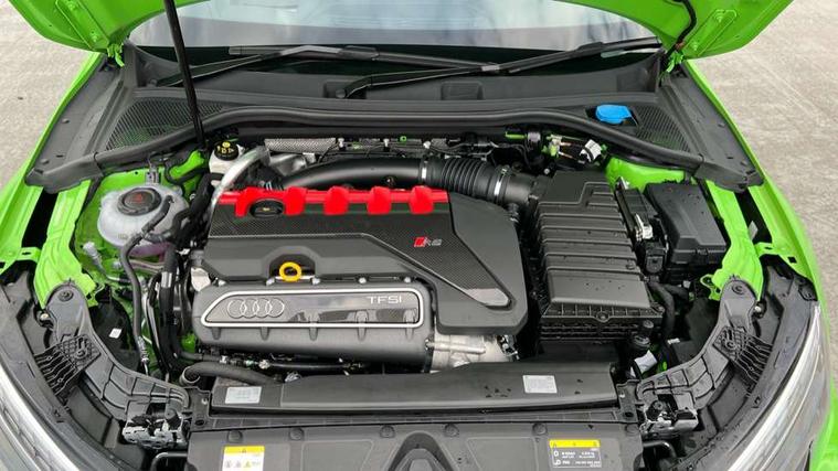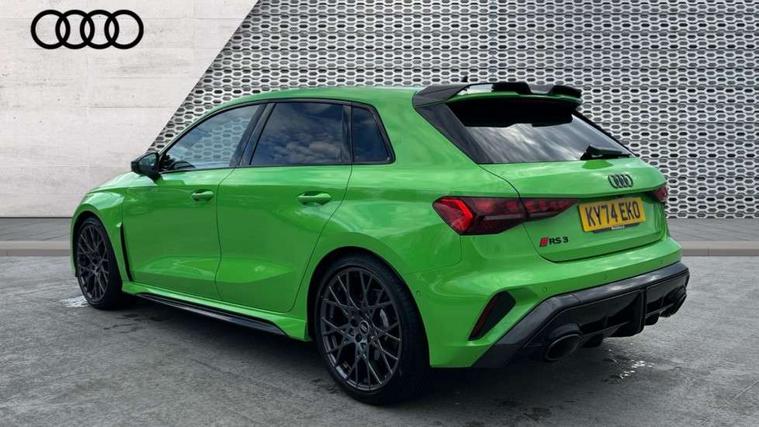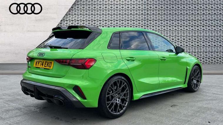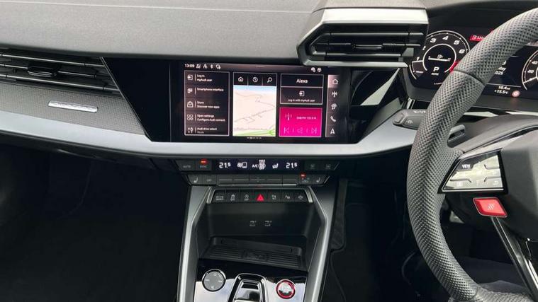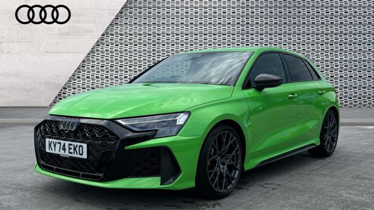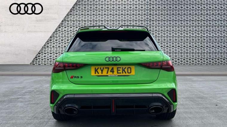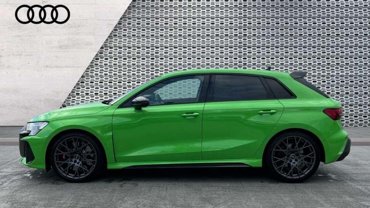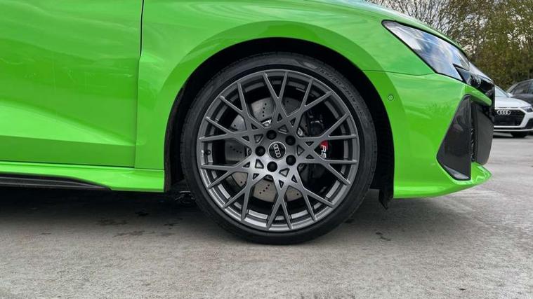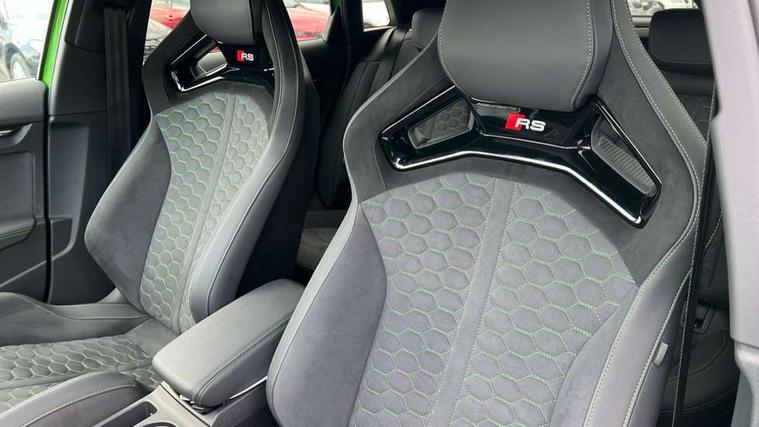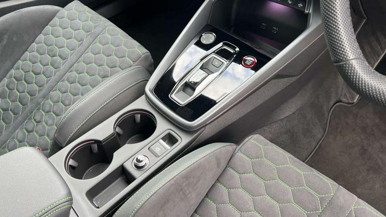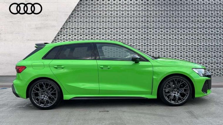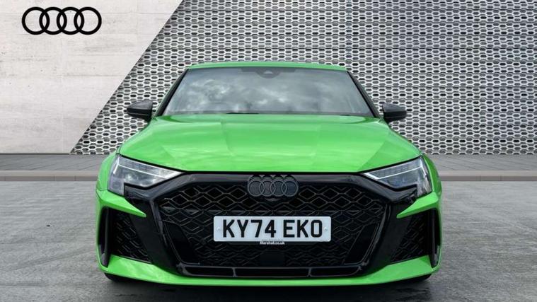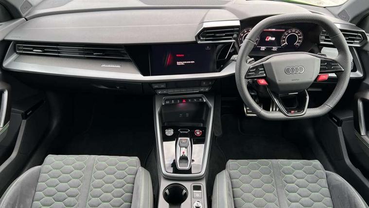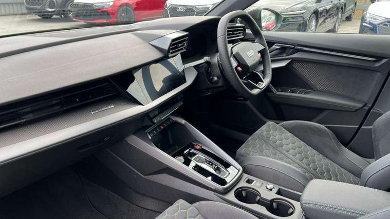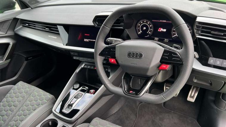 Adjustable speed limiter, Audi drive select comfort, auto, dynamic and efficiency, Audi smartphone interface with app store includes wireless Apple carplay, Android auto and Amazon alexa integration, Audi virtual cockpit plus with RS specific design and 12.3" display with additional graphic display options, Automatic start/stop system with recuperation, Bluetooth interface, Camera based traffic sign recognition, Collision avoidance assistant, Distraction and Fatigue warning, e-Call (emergency call), Lane departure warning system, MMI Navigation Plus with high resolution 10.1" colour touch screen display, Park Assist with parking system Plus, Progressive steering, RS specific driving modes - RS Individual, RS Performance and RS Torque rear, Voice control system with natural language interaction, Quattro permanent four wheel drive, Audi Phonebox light with wireless charging, DAB Digital radio, USB ports with charging function in the rear, All weather light, Audi beam LED projection of RS logo on ground as you exit, Audi darkened matrix LED headlights with dynamic light sequencing and dynamic indicator, Auto dimming frameless rear view mirror, Automatic dynamic range control, Carbon door mirror housings, Carbon fibre engine cover, Dipped beam, main beam, position light and turning light, Dynamic RS specific light sequencing of the coming home and leaving home function, Electrically adjustable/heated/folding/auto dimming door mirrors with integrated LED indications + kerb view function for passenger side, Exterior model badging, Front electric windows, Headlight cleaning system, Heat insulating glass windscreen, Intersection light, LED 3rd brake light, LED brake lights, LED daytime running x3, LED rear lights with dynamic light sequencing and dynamic indicator, LED rear number plate lights, LED reverse light, LED tail lights, Light and rain sensors, Manoeuvring light, Motorway light, Privacy glass - dark tinted rear window, rear door and side windows, Rear electric windows, Rear side wing doors, Rear wiper, Roof edge spoiler in carbon, RS dual branch exhaust system with two chrome plated oval tailpipe trims, Static Cornering lights, Visually upgraded RS specific daytime running light choice of 4 digital signature in chequered flag design within the headlight, 12V socket and storage compartment in front centre console, 3 seat bench in 2nd row, 3 Spoke flat top and bottomed black leather multi function steering and gear shift paddles, 3-zone deluxe automatic air conditioning, 40/20/40 split folding rear seat bench, Black cloth headlining, Front and rear headrests, Front centre armrest, Front door sill trims with RS 3 logo, Front sports seats RS embossed logo, Front/rear floor mats, Heated front seats, Height and reach adjustable steering wheel, Manual boot compartment lid, Manually adjustable front seats, Rear centre armrest with cupholder, Seat side bolsters, Single front passenger seat, Stainless steel pedals and front footrest in black, Vanadium look - Interior door handles, Door trim, power latching, Air vents, window controls, mirror adjust, rear door lock, Selector lever in centre console, Black Styling plus package - RS3, Extended ambient lighting package Pro with Multi-coloured contour lighting of instrument panel - RS3, RS exterior features pack in carbon and gloss black - RS3, RS sport suspension pack - RS3, Storage package - RS3 Sportback, Technology package without speed limiter - RS3, 3x3 point rear seat belts, Driver and front passenger airbag with passenger airbag deactivation, Electronic Stabilisation Control (ESC) including ABS, ASR and EDL, First aid kit with warning triangle and 2 safety vests, Hill hold assist, Pre-sense front with pedestrian and cyclist detection, RS steel brakes, Seatbelt monitoring, Tyre pressure loss indicator, Anti theft alarm, Anti-theft wheel bolts, Electronically operated child locks, Remote central locking with safelock, Inlays in carbon atlas structure, 19" 10 cross spoke silk matt grey alloy wheels, Tyre repair kit,