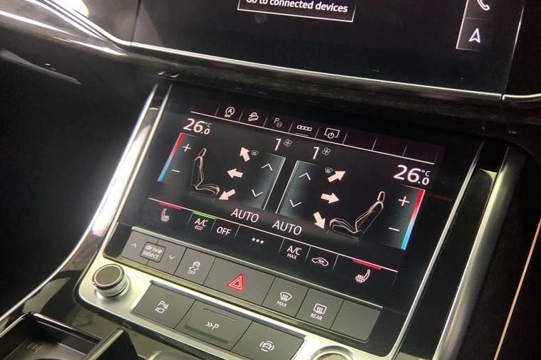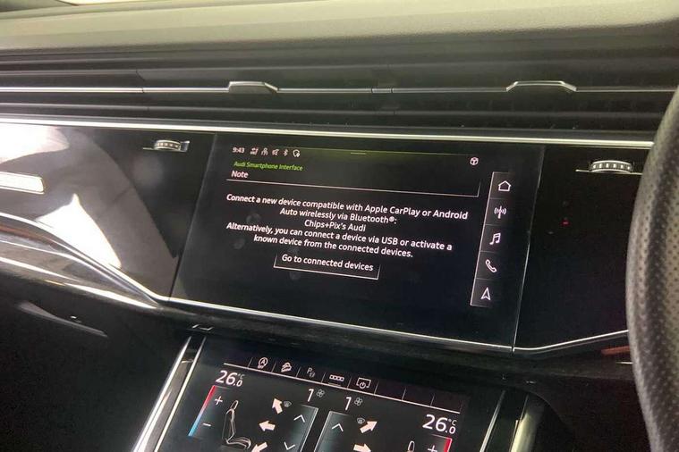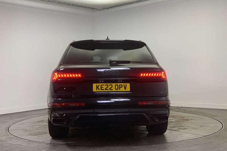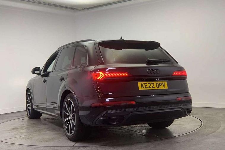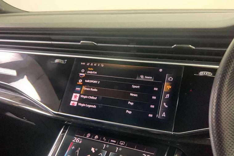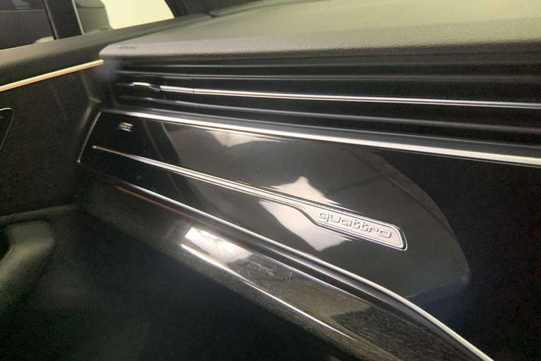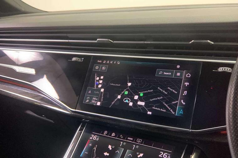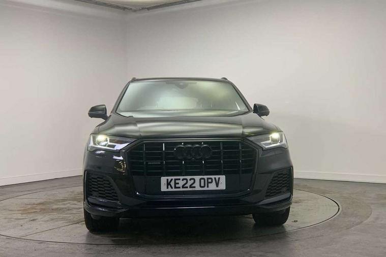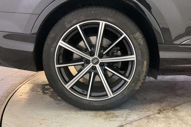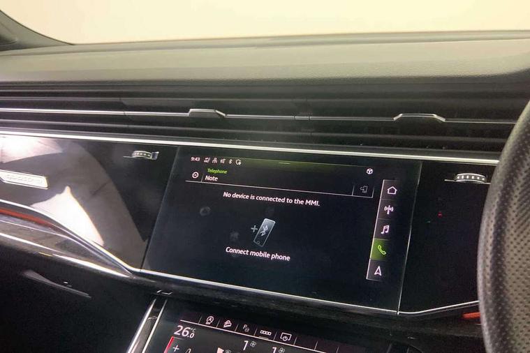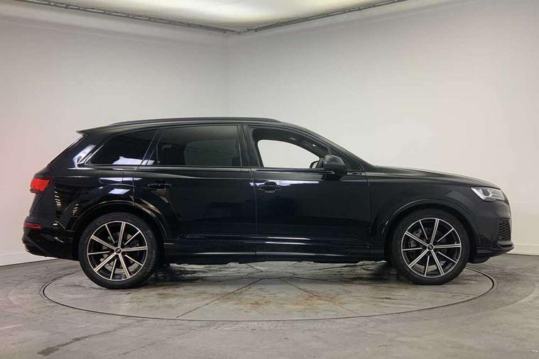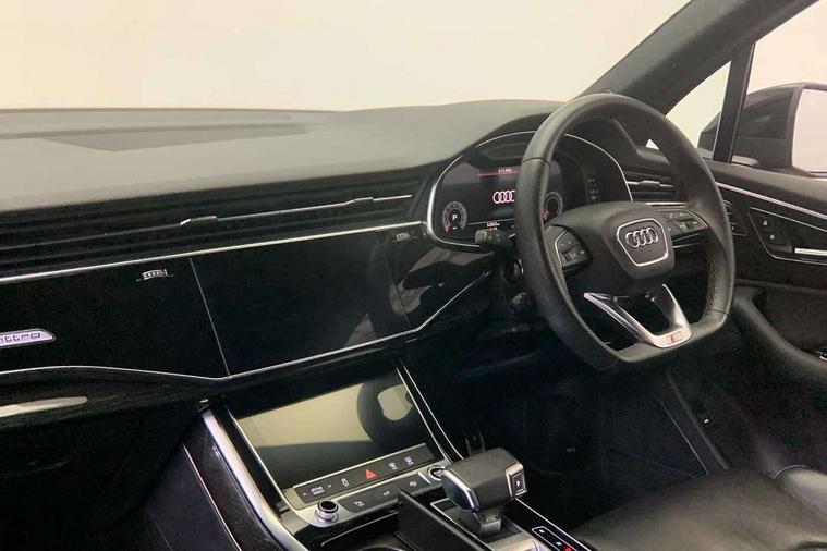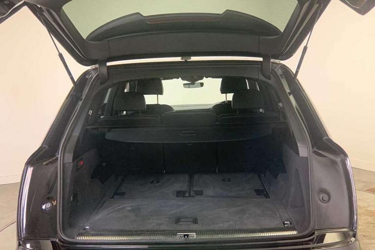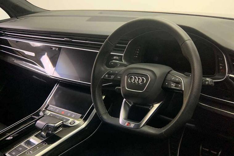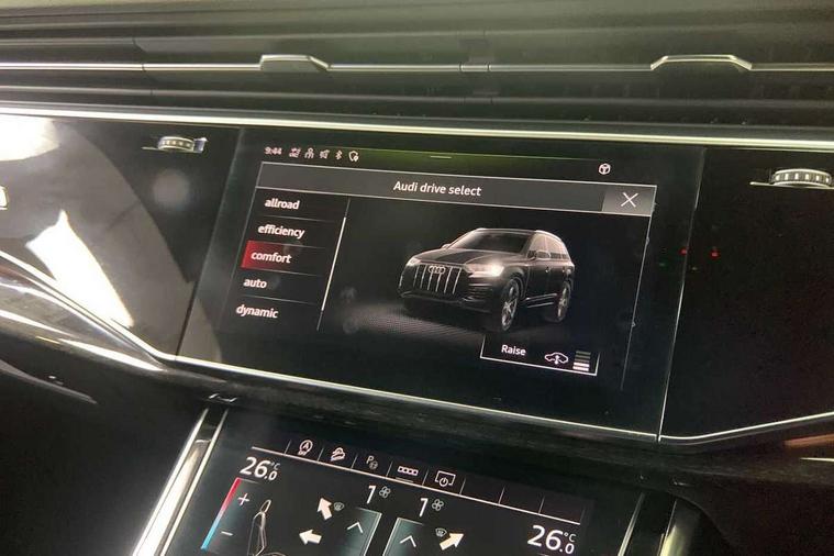 Audi connect safety and service (e-call), Audi connect with Amazon Alexa Integration, Audi drive select (Auto, Comfort, Dynamic, Efficiency, Individual, Off-road and All road), Bluetooth interface, Camera based traffic sign recognition, Electromechanical steering, MMI navigation plus with MMI touch screens includes 10.1" and 8.6" screens with haptic feedback, Natural voice recognition, Parking system plus with 360 degree display (front, rear and side sensors) - acoustic and visual park assist system, Power operated tailgate, Rear view camera, Smartphone interface includes wireless Apple carplay/Android Auto, Start/stop system, 48V Mild hybrid technology, 85 litre fuel tank, Adaptive air sports suspension, Quattro all wheel drive with self locking centre differential, Audi music interface - front 2 USB-C ports with charger and data functions, Audi sound system with 6 channel amplifier, 180 watt amplifying capacity and 10 loudspeakers including subwoofer, DAB digital radio module, 3rd brake light, Audi matrix LED headlights with dynamic front and rear indicators, Auto dimming frameless rear view mirror, Black roof rails, Bumpers in contrast paint scandium grey finish includes door trim and wheel arch trim strips, inlays in door strip contain quattro embossing, Electrically adj heated/folding + automatically dimming exterior mirrors with memory + automatic kerb side function for passenger side exterior mirror, Heat insulating glass in windshield, Integrated LED indications in door mirrors, LED daytime running lights, LED rear tail lights, Privacy glass - dark tinted rear and rear side windows from B-pillar backwards, Rear side wing doors, Rear wiper, 2 seat bench in 3rd row, 3 seat bench in 2nd row, 4 zone deluxe automatic climate control, 7 seat layout with ISOFIX points for the front passenger seat and rear passenger seat, Black cloth headlining, Comfort front centre armrest, Electric adjustable front seat with 4 way lumbar support, driver memory functionality, Folding rear seats, Front head restraints, Front/rear floor mats, Heated front seats, Illuminated door sill trims with S logo, LED interior ambient lighting, Luggage compartment cover, Luggage compartment sill protection in stainless steel, Rear head restraints, Single front passenger seat, Stainless steel pedals, Sunvisors with illuminated vanity mirrors, Titanium black styling pack - Q7/SQ7, 3 point seatbelts on all rear seats, Audi pre sense front, Child locks on rear doors, Driver and front passenger, front side and curtain airbags, Electromechanical parking brake, Electronic Stabilisation Control (ESC) including ABS, ASR and EDL, Extended pedestrian protection measures, Hill hold assist, Seatbelt monitoring, Tyre pressure loss indicator, Warning triangle and first aid kit, Anti theft alarm, Anti-theft wheel bolts and wheel loosening detection, Keyless Go, Remote central locking, Polished oak trim with grey finish inlay, Tool kit, Tyre repair kit,