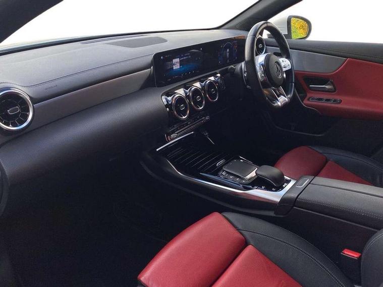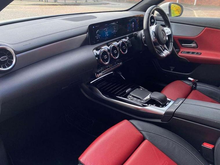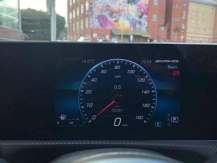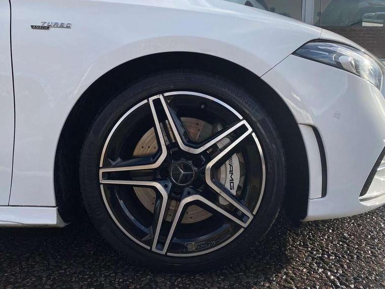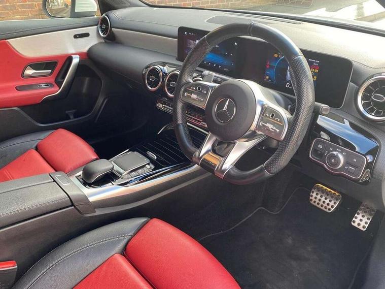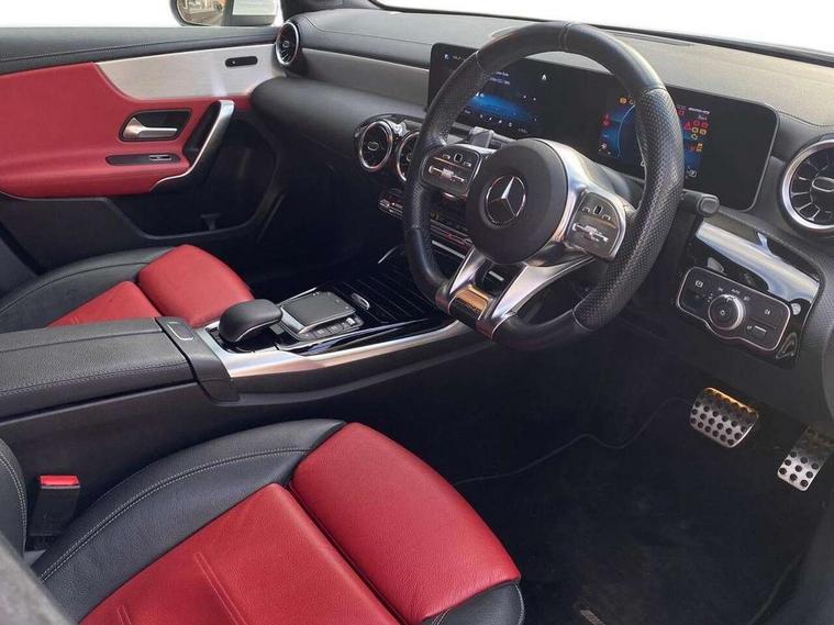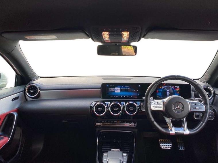 10.25" media display, 180 degree rear view camera with parking guidelines, 7" colour screen in instrument panel, Active parking assist with visual and audible warning of detected obstacles, Attention assist, Brake pad wear indicator warning light, Car wash mode, Cruise control + speed limiter, Direct steering, Dual bluetooth interfaces, DYNAMIC SELECT with driving programs (Slippery, Comfort, Sport, Sport+ and Individual), ECO start/stop function, Fluid level warning indicator for fuel, oil, coolant and washer fluid, Hard-disk navigation, Hey Mercedes Voice activation, Lamp failure indicator, Mercedes me connect including emergency call system, accident recovery, breakdown and maintenance management, Mercedes me remote services, Outside temperature gauge, Owners manual in English, Pre-installation for private car sharing, Preinstallation for Mercedes Benz link, Service indicator (ASSYST), Smartphone integration with Apple CarPlay and Android auto, Speed sensitive power steering, Trip computer, Ultrasonic sensors positioned in the front and rear bumpers, Wireless charging, AMG performance suspension, Rear axle multi-link, 2 USB ports (type C) in rear stowage compartment and one in front of center console, 6 speakers, DAB Digital radio, MBUX multimedia system with DAB digital radio and touchpad including satellite navigation, Mercedes-Benz sound system - 100W, 4 Electric Front and Rear windows, Adaptive brake lights, AMG bodystyling - Front apron with splitter in chrome, rear apron with chrome trim and chrome visible trim elements in tailpipe, AMG Front apron with flics as air deflector elements on the outer air intakes, AMG radiator grille with twin blade lamella and AMG Lettering, AMG Rear apron with specific diffuser look with four vertical fins and two round chrome plated tailpipe trim elements with a diameter of 90 mm, AMG spoiler lip on roof, AMG Sports exhaust system with two round tailpipes measuring 90 mm in diameter attached in rear apron, AMG lettering plus ribbing on the inside of the, Black weather strip, Body colour bumpers, Body colour door handles, Body colour side skirt, Body coloured door mirrors, Chrome beltline trim, Electric adjustable and heated door mirrors with integrated LED side indicators, Front wings wheel arches with TURBO 4MATIC lettering, Headlamp assist automatic headlamp activation, Heated glass rear windscreen + timer control, LED high performance headlamps with integrated LED daytime running lights, LED tail lamp, LED third brake light, Privacy glass, Radio aerial, Rain sensing windscreen wipers with two sensitivity settings, Rear fog lights, Rear wiper, Trim elements on louvres in outer air inlets in silver chrome, Wider wheel arches for AMG wheels, Window line trim strip in chrome, 40:20:40 split folding rear seats, AMG Performance steering wheel in nappa leather, Auto Mercedes-Benz child seat recognition sensor, Black air vents with surround in silver chrome, Black roof lining, Brushed stainless steel sports pedals with rubber studs, Controller on centre console with chrome surround, Floor mats with stitched edging and AMG lettering, Front centre armrest with storage compartment, Front door sills with Mercedes Benz lettering, Front seat backs luggage nets, Front seat cushion length adjustment, Heated front seats, Height/reach adjustable steering column, Interior mirror with reading lamps in black and frameless, Manual height adjustable front seats, Rear head restraints, Seat occupancy sensor for front passenger seat, Silver coloured aluminium gear shift paddles on steering wheel, Sports seats with integrated headrests, Stowage compartment in centre console with retractable cover, Sunvisors with illuminated vanity mirrors, Touchpad on center console, Twin front cupholders, Two zone thermotronic luxury automatic climate control, Light and sight pack - A Class, Mirror package - A Class, Seat comfort pack - A Class, 3 rear 3 point seatbelts, ABS with Brake Assist, Active bonnet, Active brake assist includes forward collision warning system with autonomous braking, Adaptive brake assist with hold function and hill start assist, Black seatbelts, Childproof locks manually operated for rear doors and electrically operated for rear power windows, Crash responsive emergency lighting, Driver and passenger head and side airbags, Drivers knee airbag, Dual stage driver/passenger airbags, Electronic parking brake, ESP curve dynamic assist, ESP with ASR, Front and rear seatbelt reminder, Front brake calipers with AMG lettering, ISOFIX and top tether child seat fixing points in two outer rear seats, Perforated front brake discs, Tyre pressure monitoring system, Warning triangle and first aid kit, Window airbags, Alarm system/interior protection/immobiliser, Keyless Go, Remote central locking and crash sensor with emergency opening function, Urban guard vehicle protection system with immobiliser and interior protection, Light aluminium with longitudinal grain interior trim, 18" AMG 5 twin spoke design bicolour alloy wheels, Summer tyres, Tirefit sealant kit,
